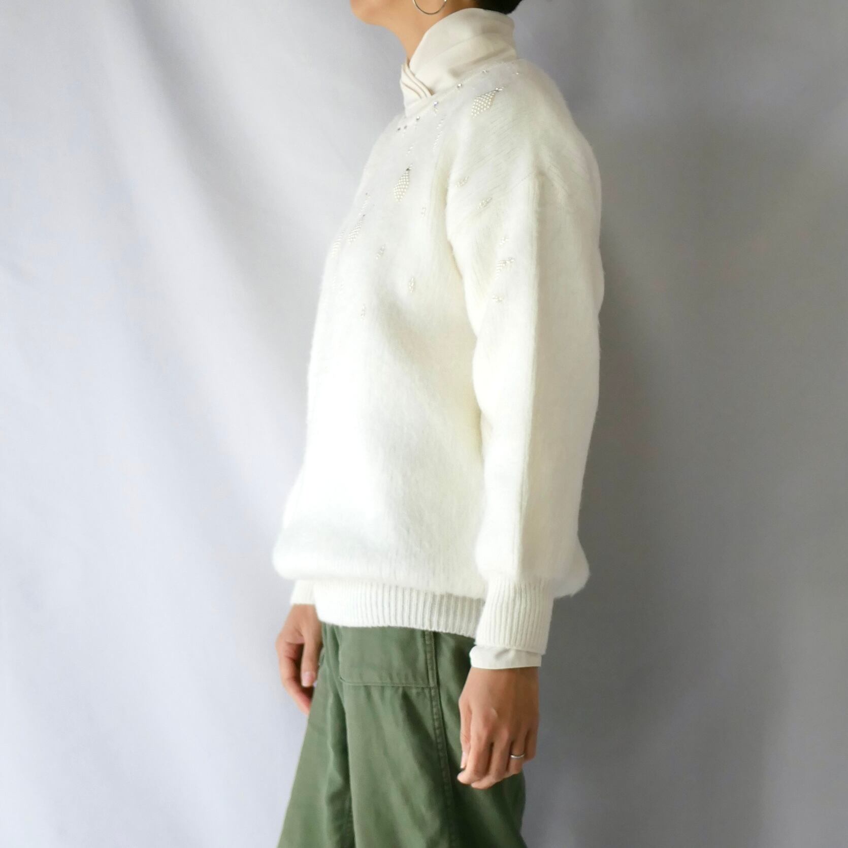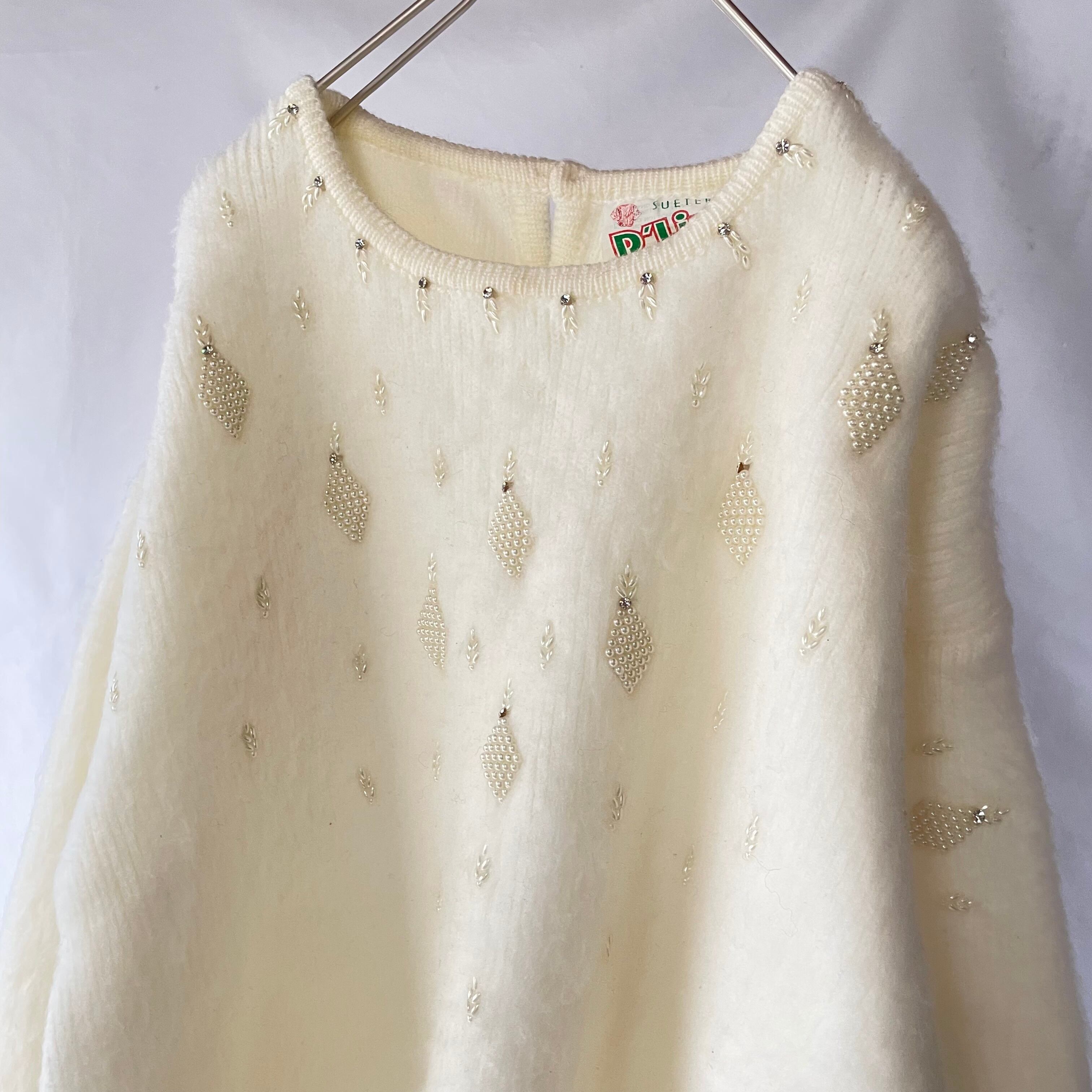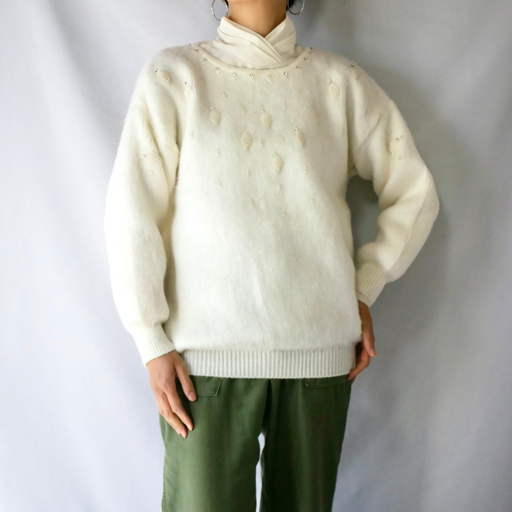 Made in Mexico white acryl beads knit メキシコ製白ビーズ装飾付きアクリルニット