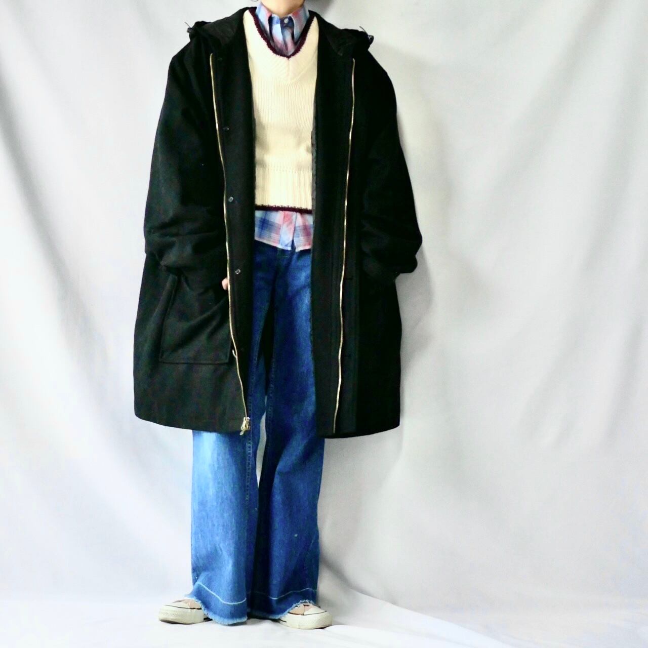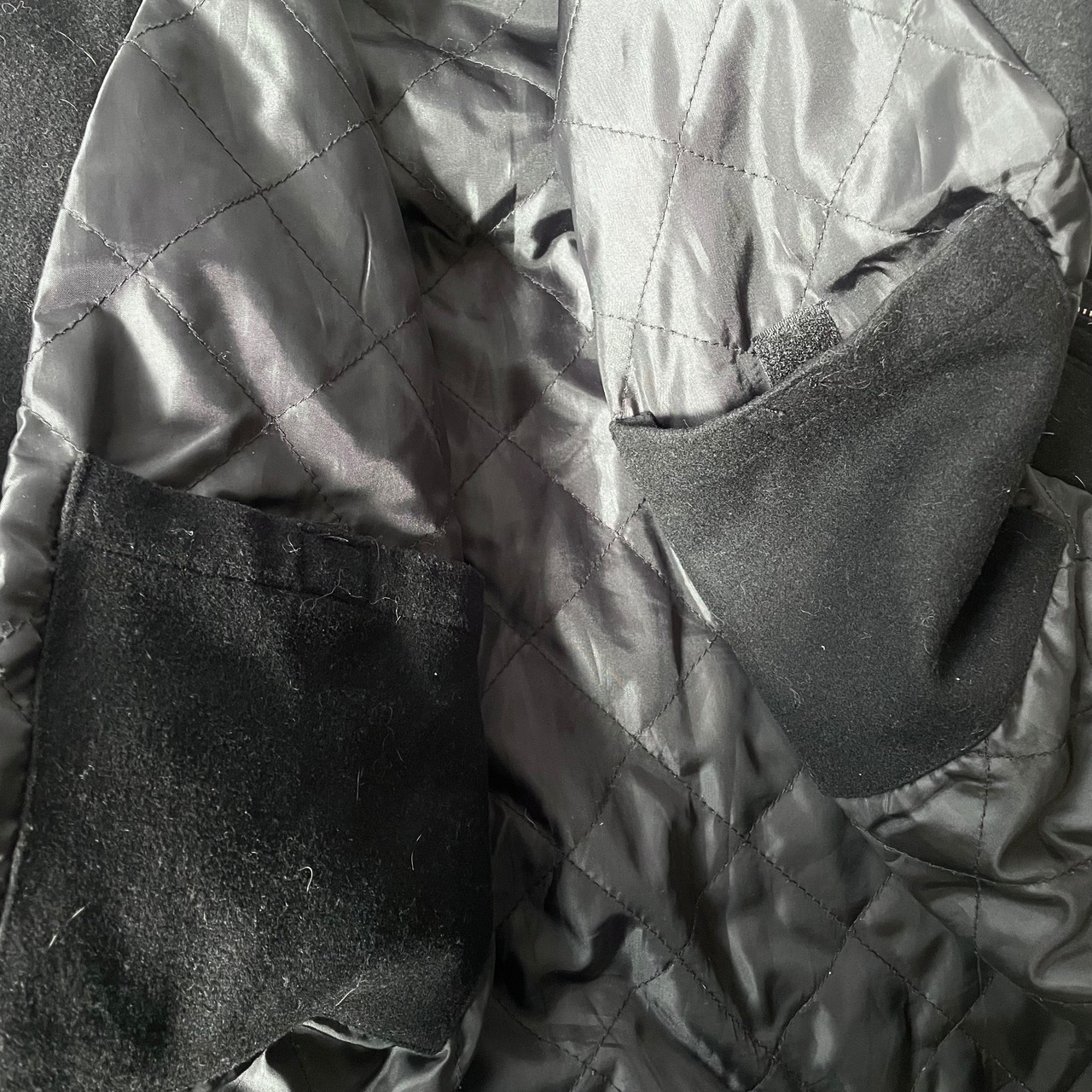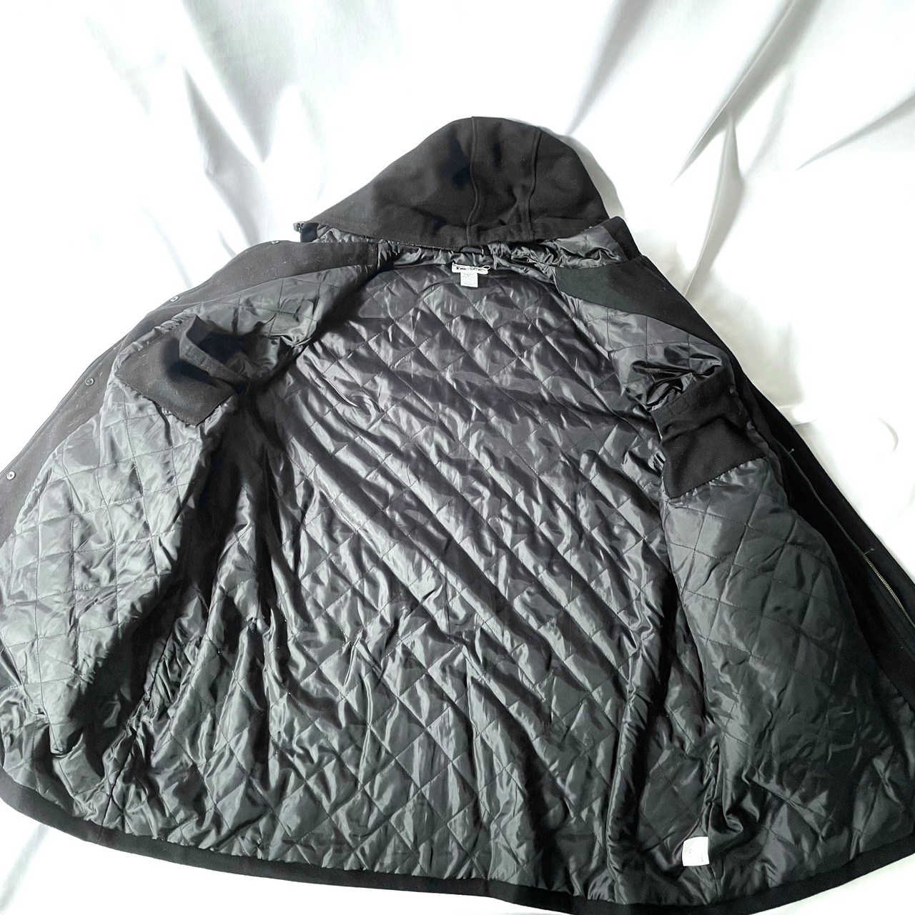 ぶかっと着られる4XLサイズ!黒ウール キルティングライナー フード付きハーフコートです。内側、外側にポケット付き