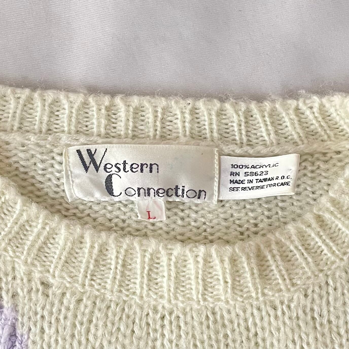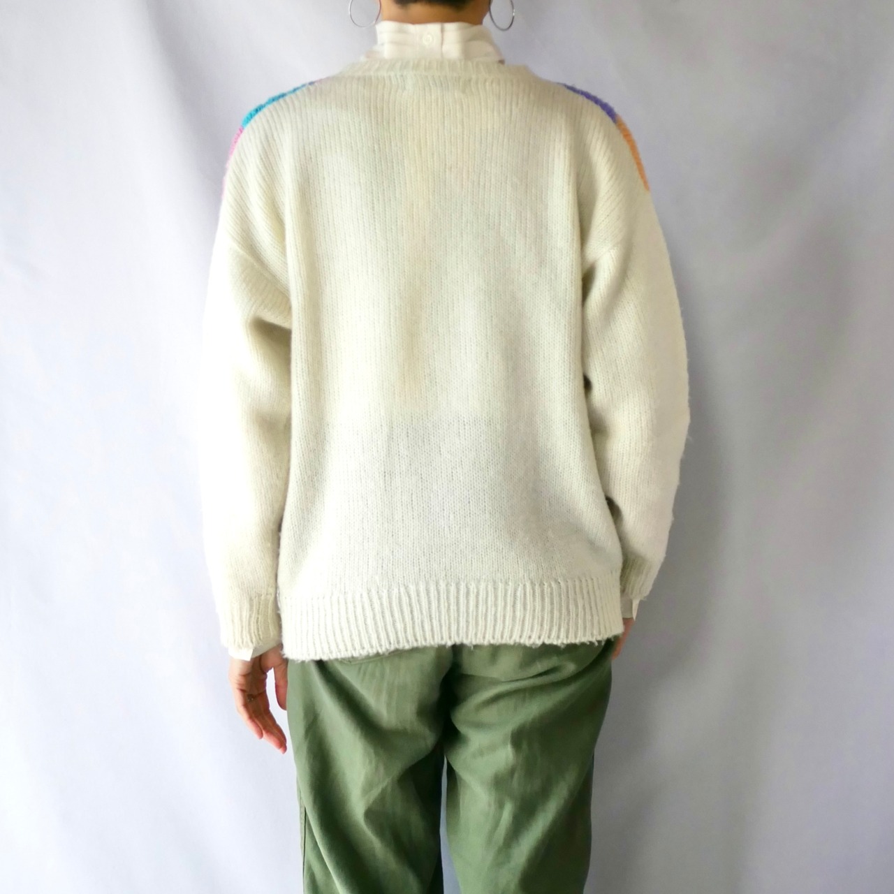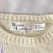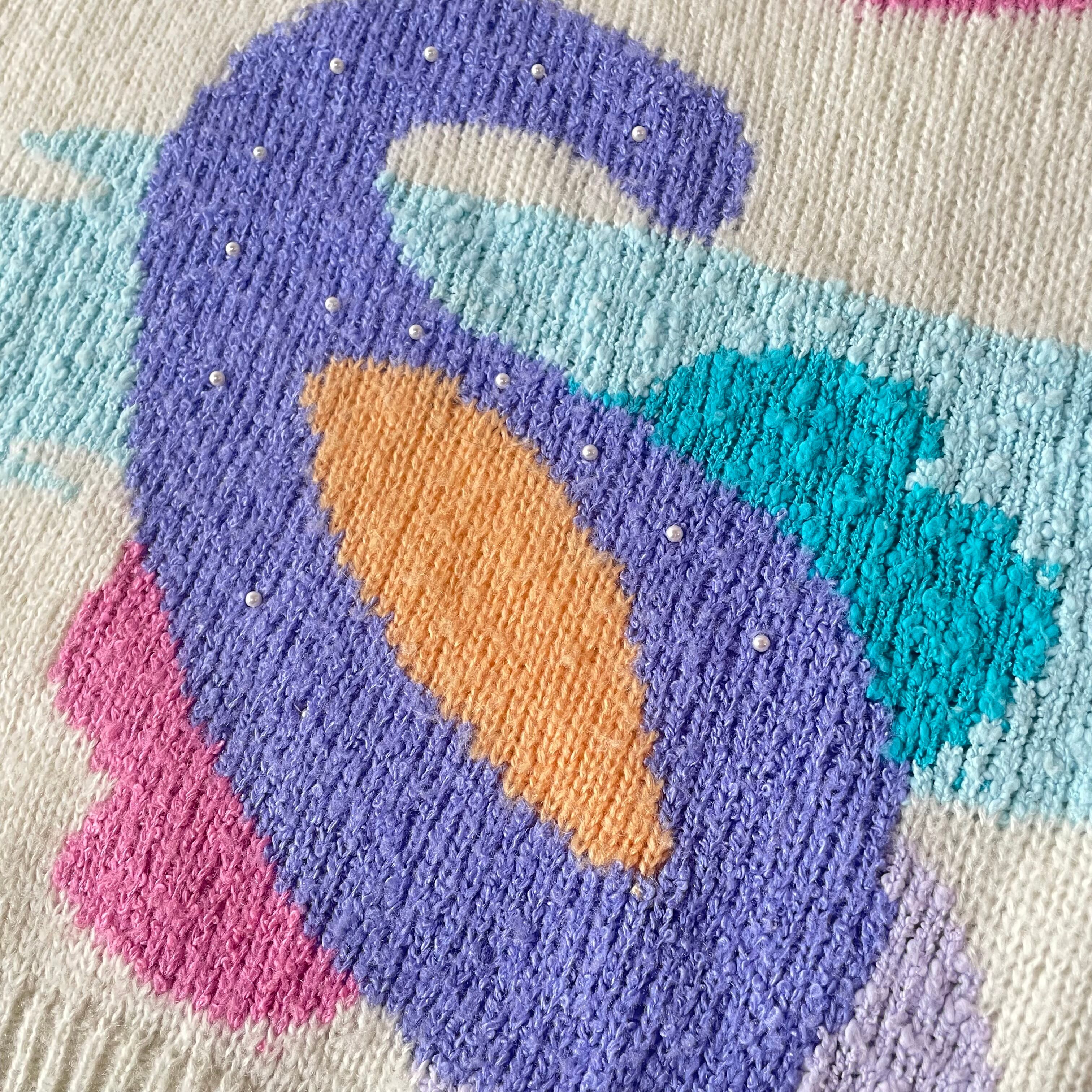 白地にパステルカラーの紫やピンクの不思議な柄がかわいいアクリルニットです。