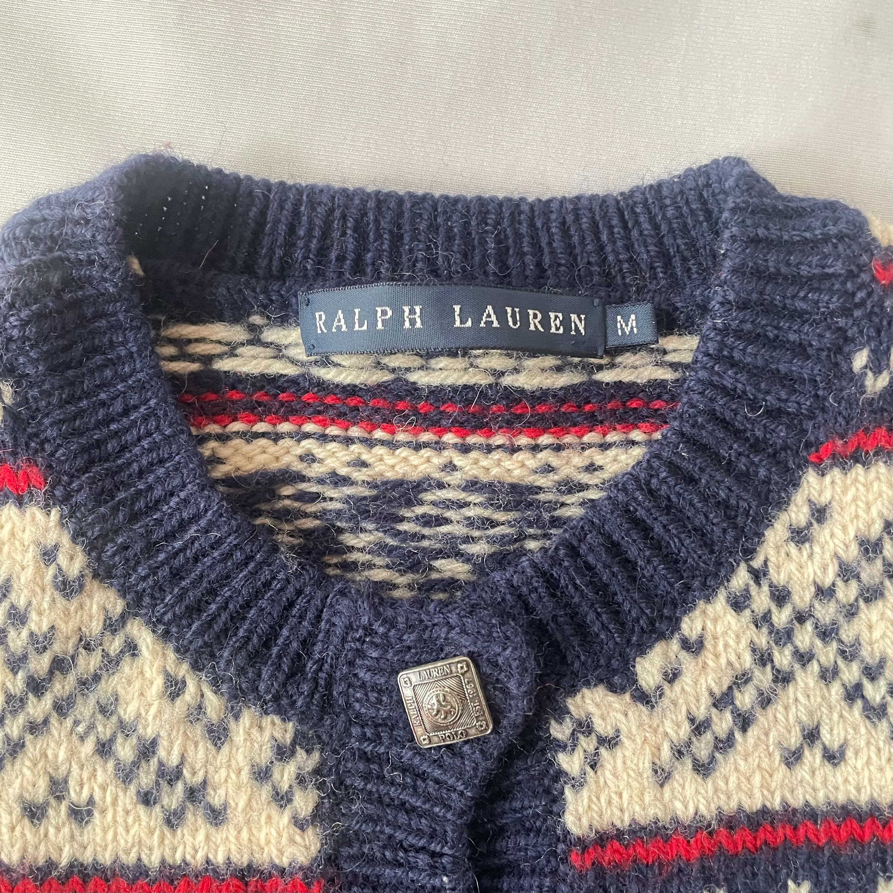 裾リブ長めでコンパクトサイズのショート丈がかわいい、ラルフローレン ノルディック柄ニットカーディガンです。タグ欠損しており不明ですが、ウール素材と思われます。