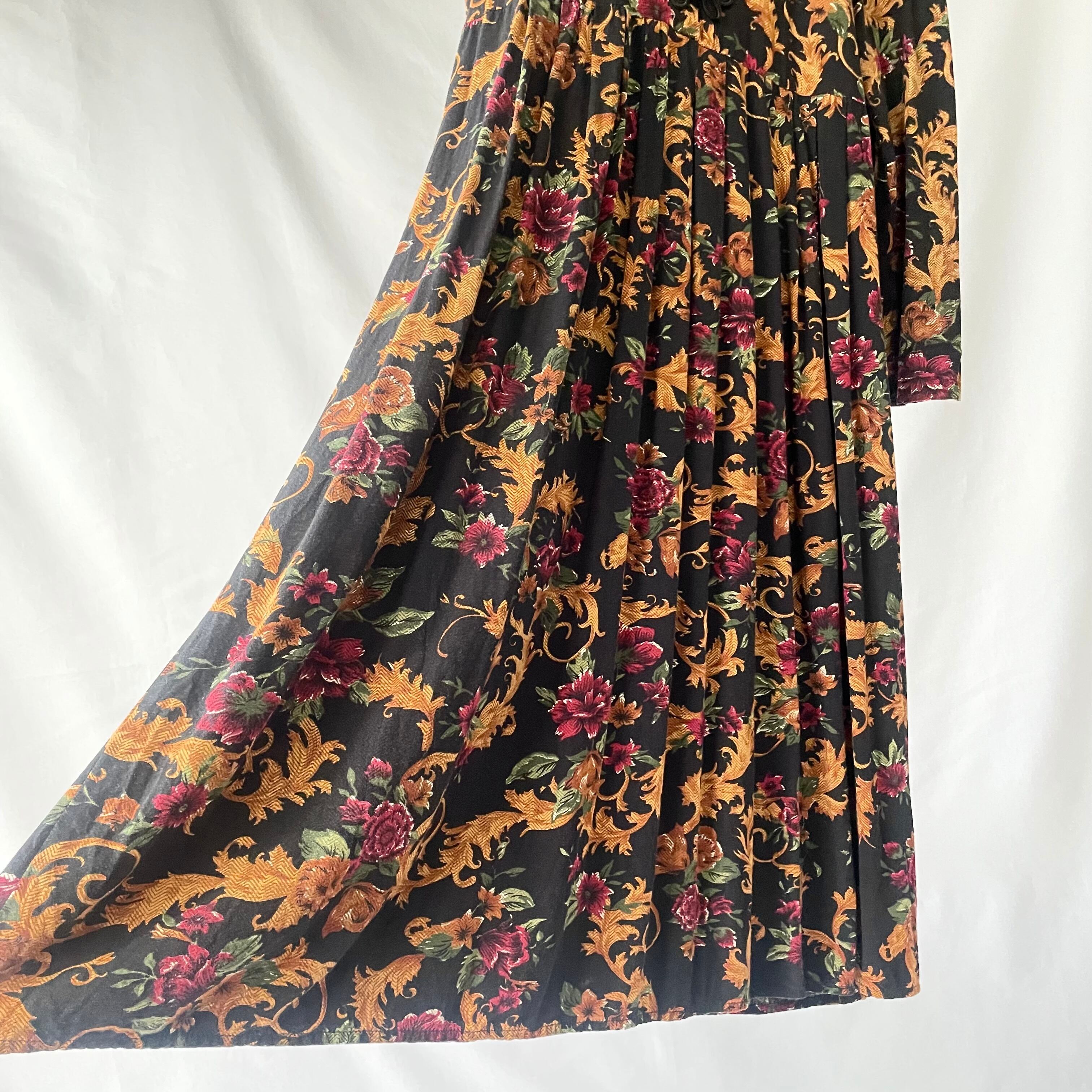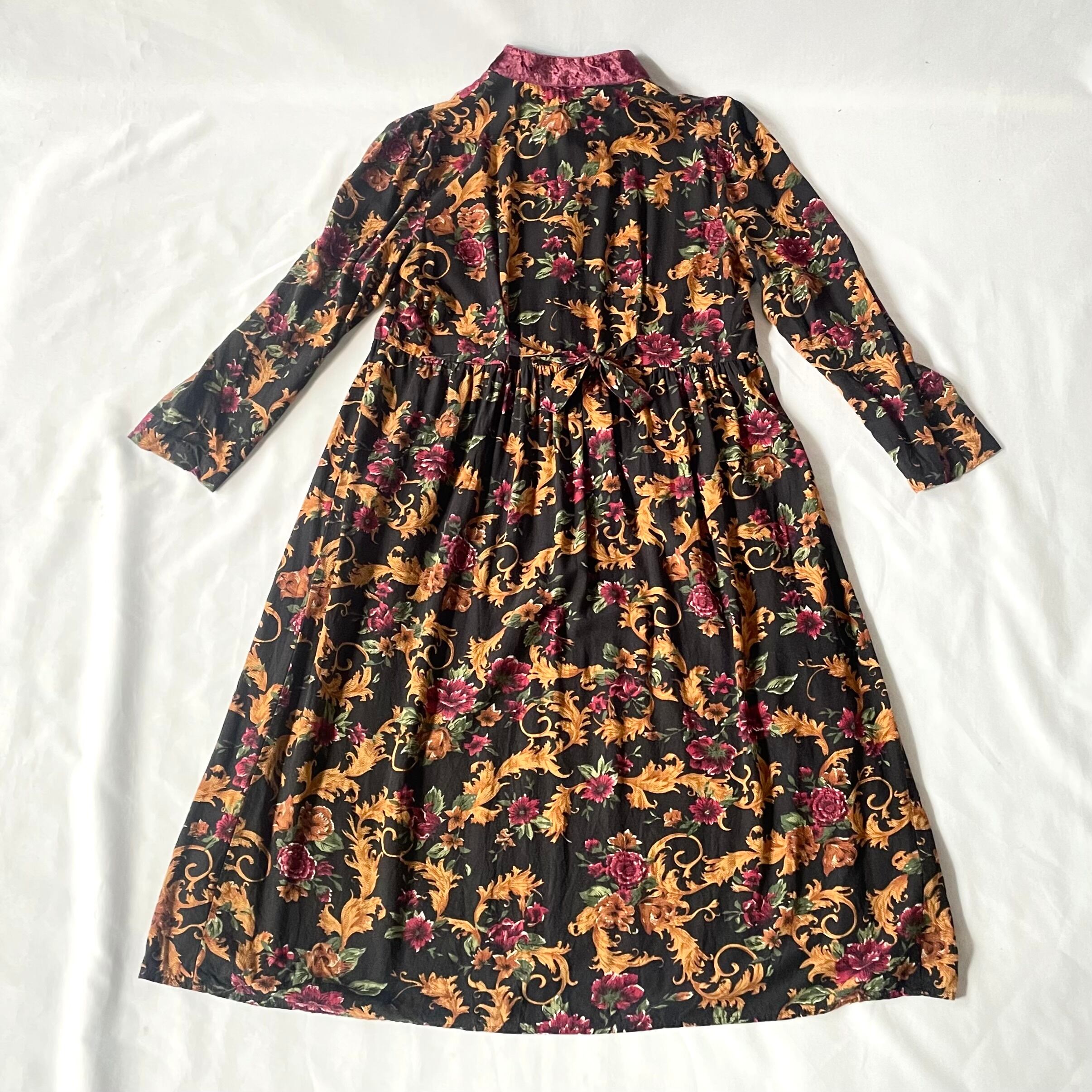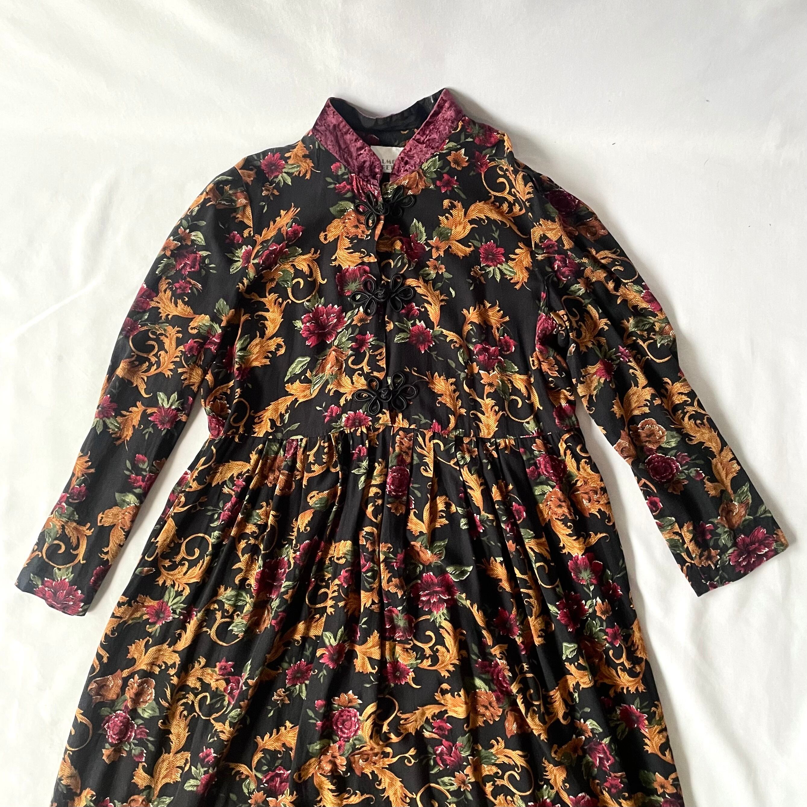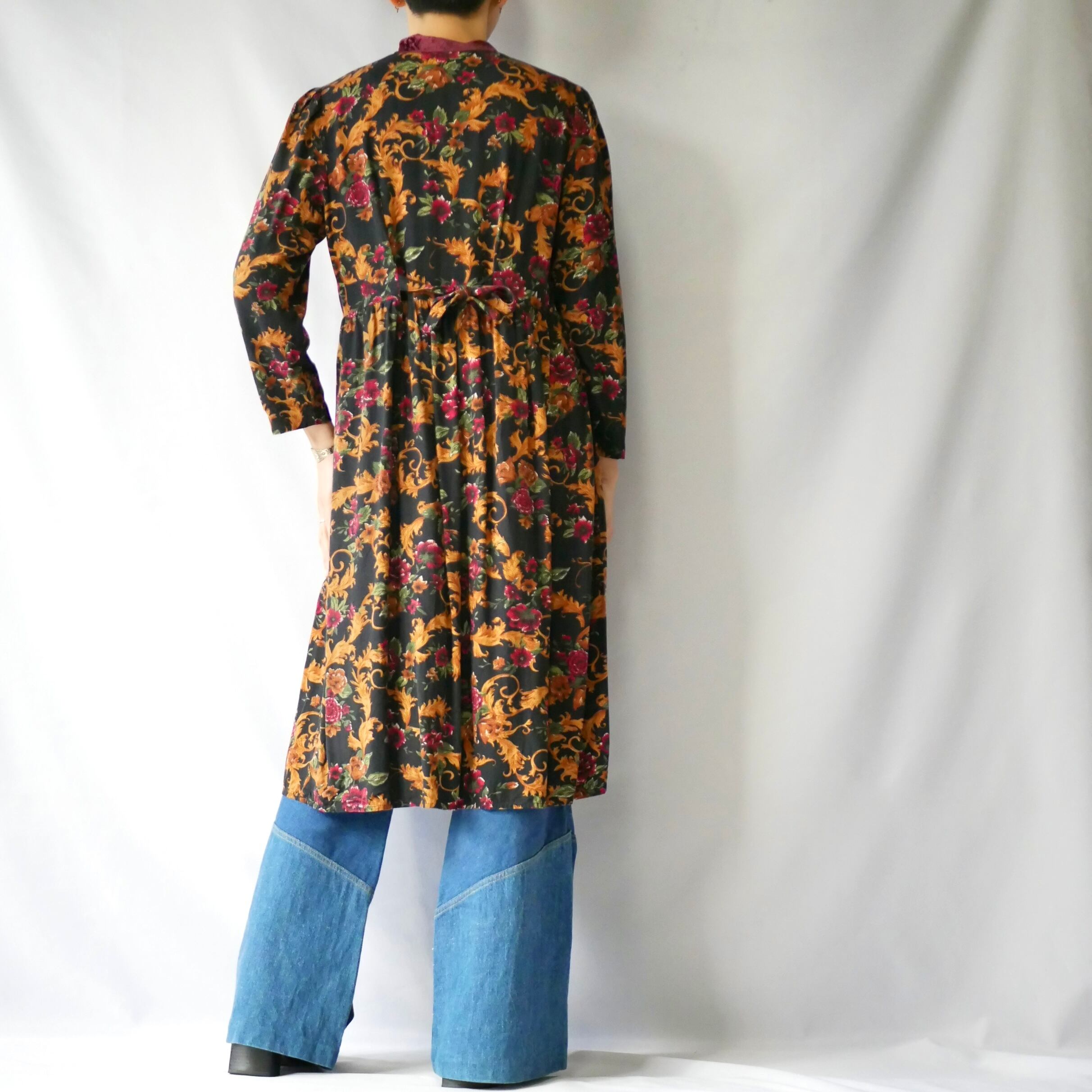 黒地にお花柄レーヨン生地のチャイナカラーがかわいい長袖膝丈ワンピースです。