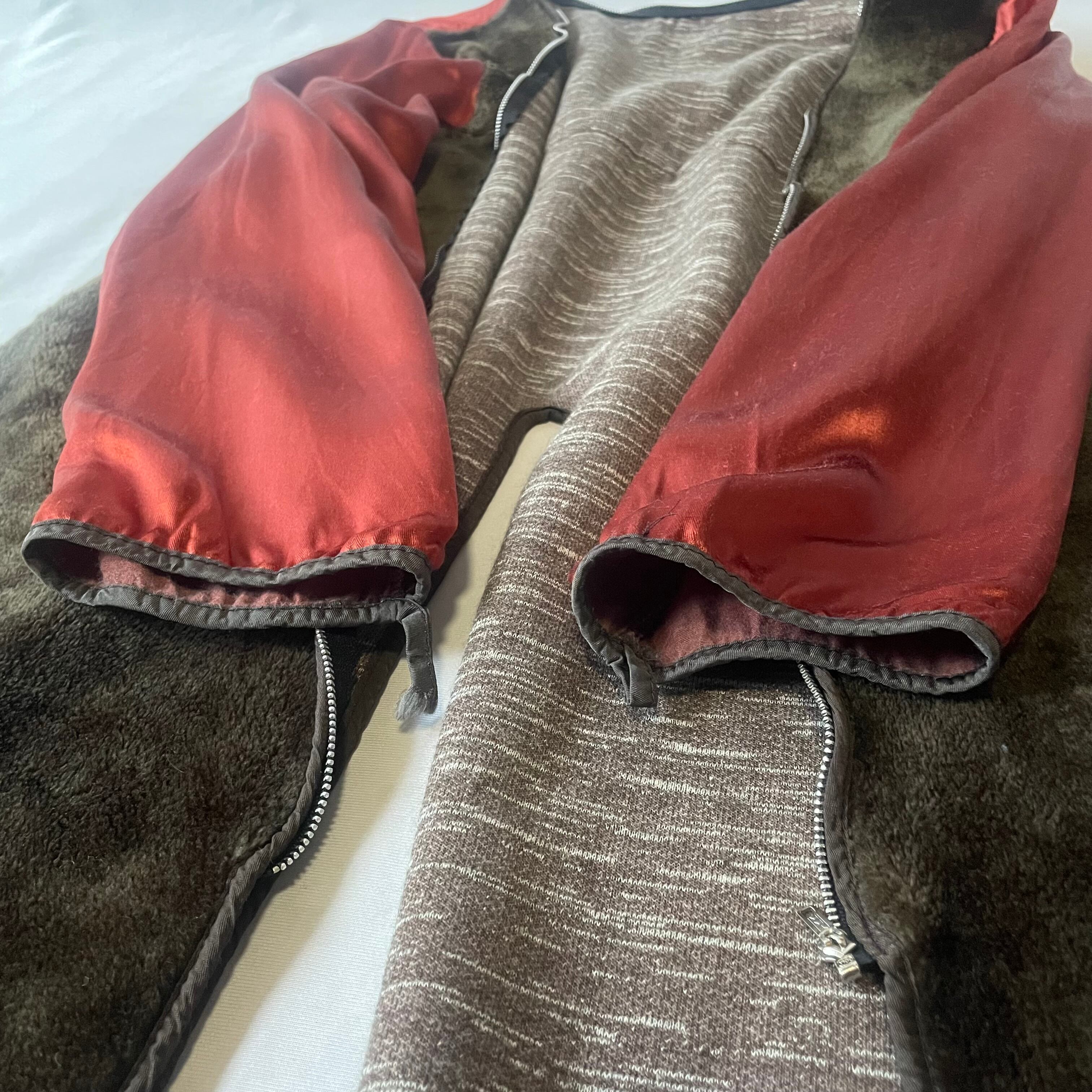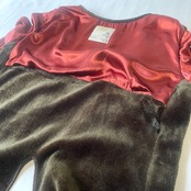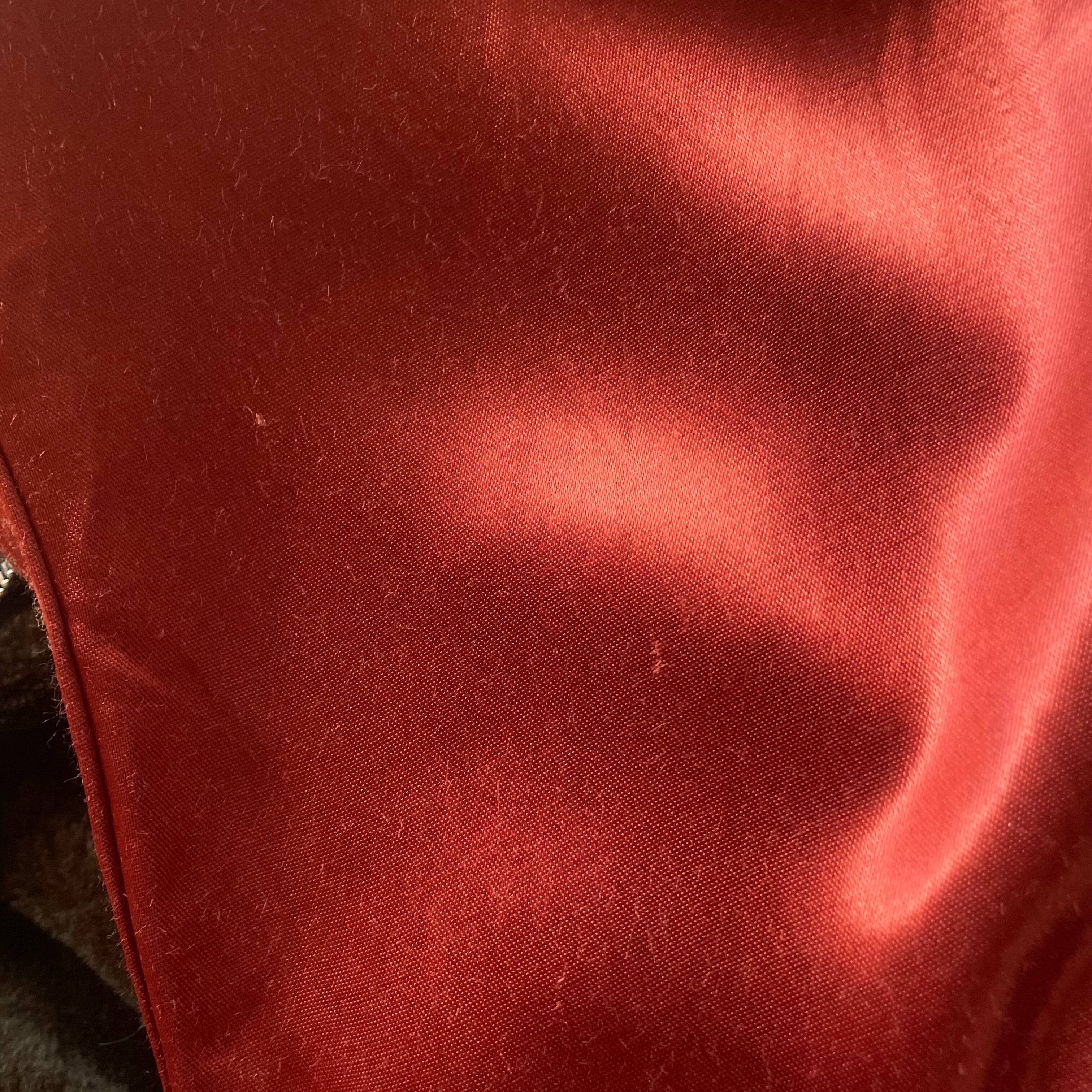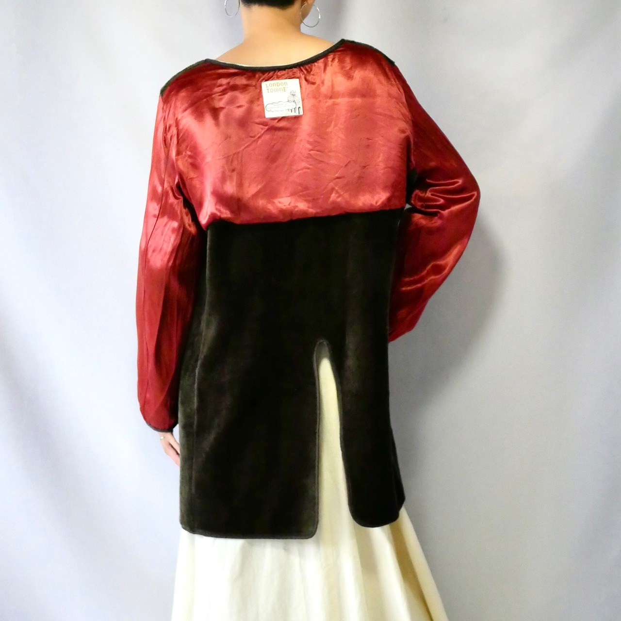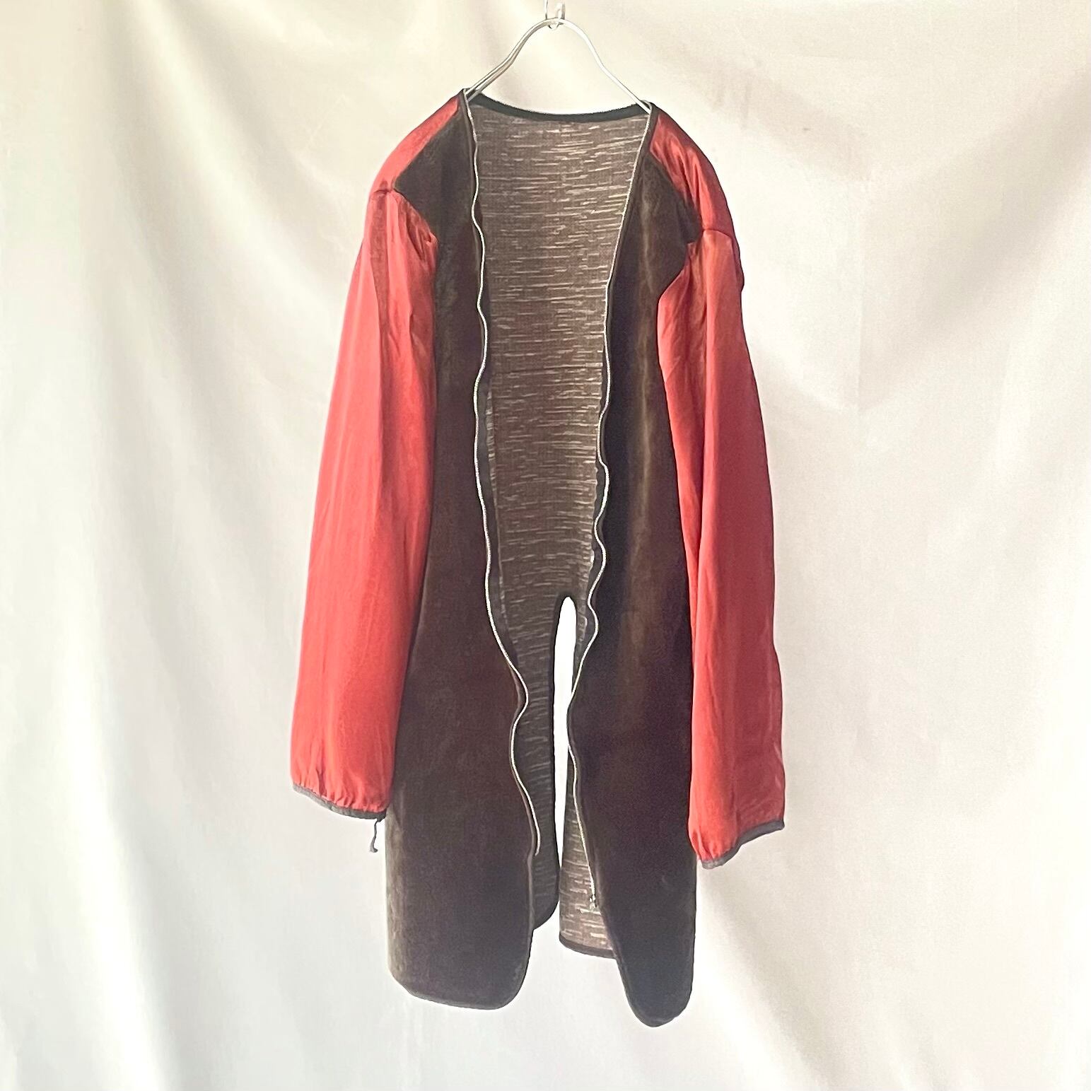 オレンジとバーガンディーの間の様な色のサテンにブラウンのもこもこボア切替のライナーコートです。