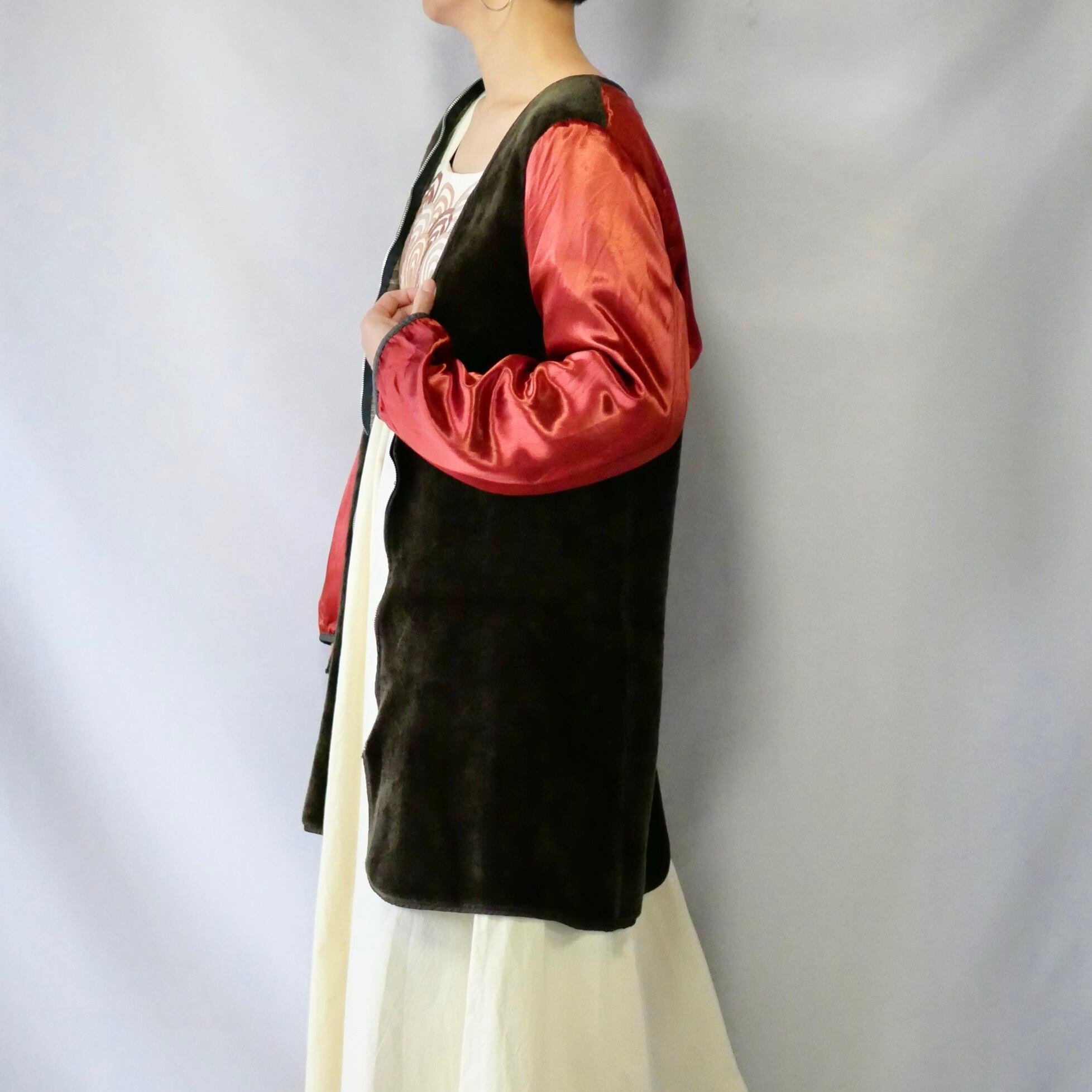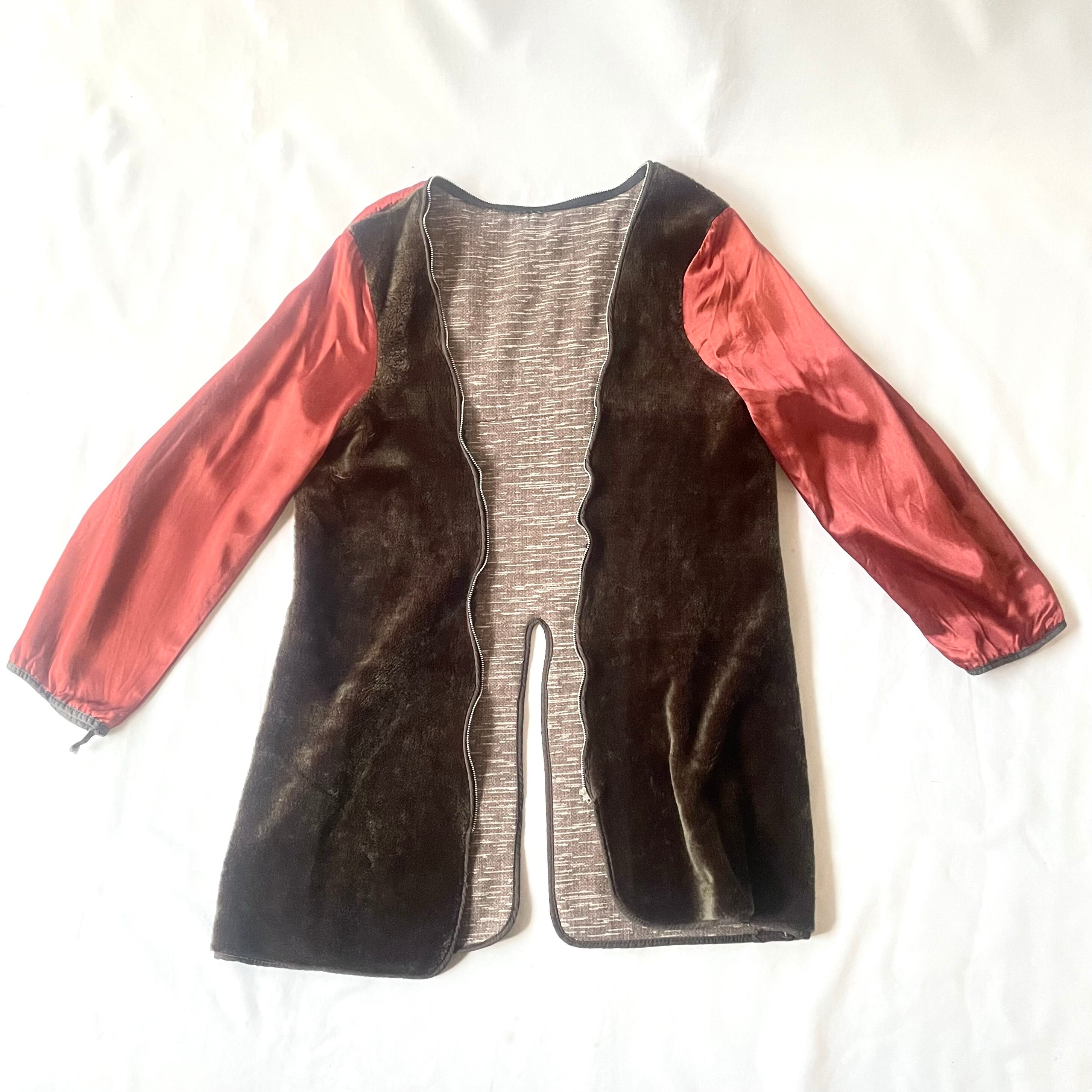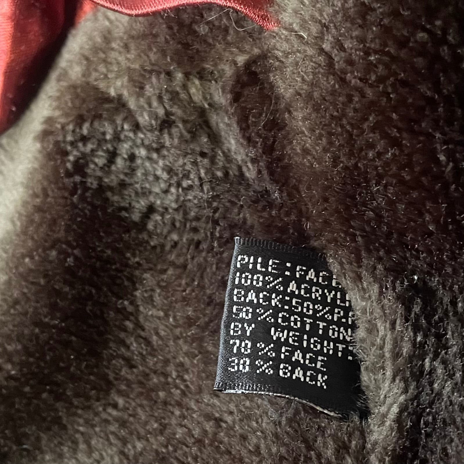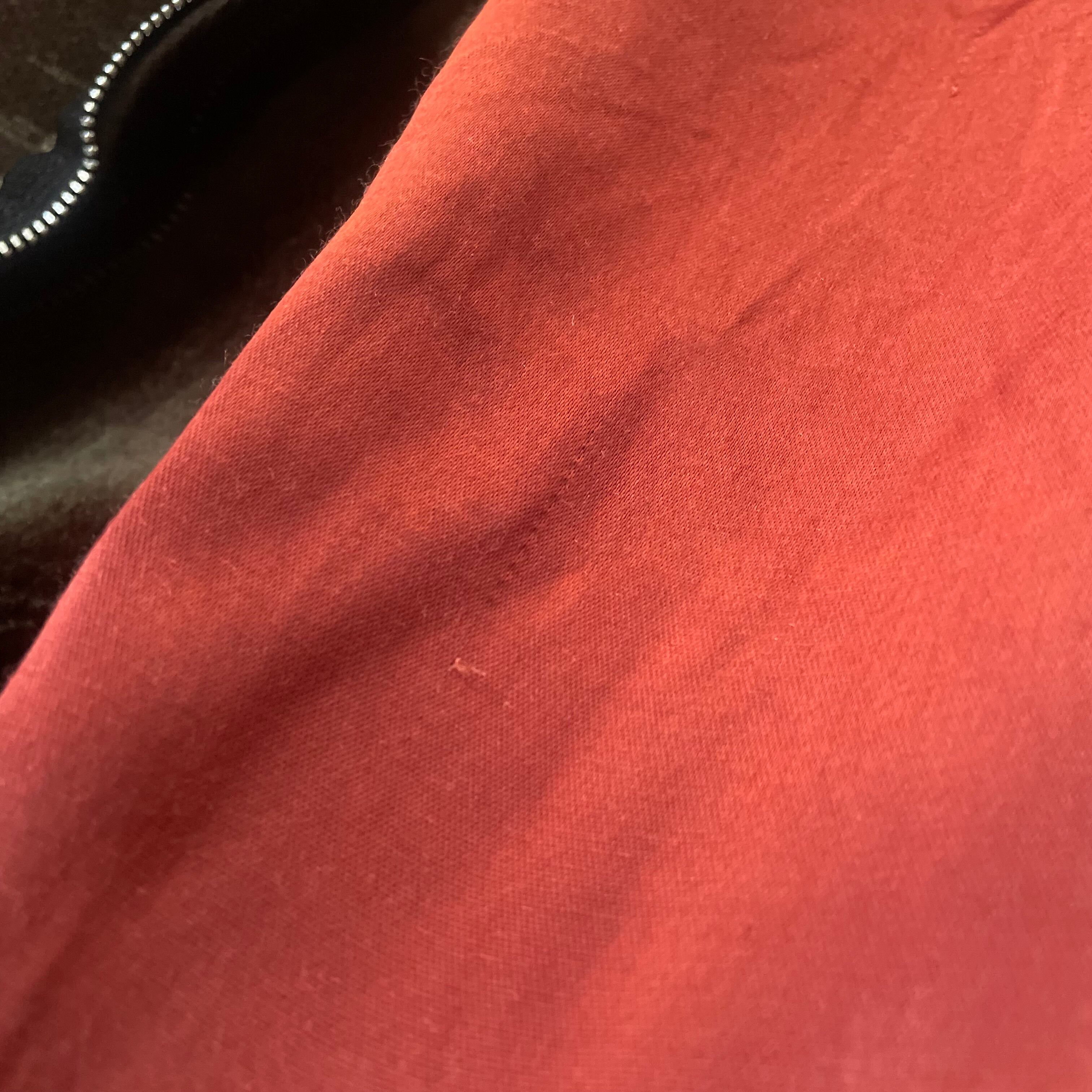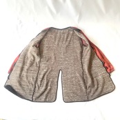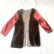 オレンジとバーガンディーの間の様な色のサテンにブラウンのもこもこボア切替のライナーコートです。