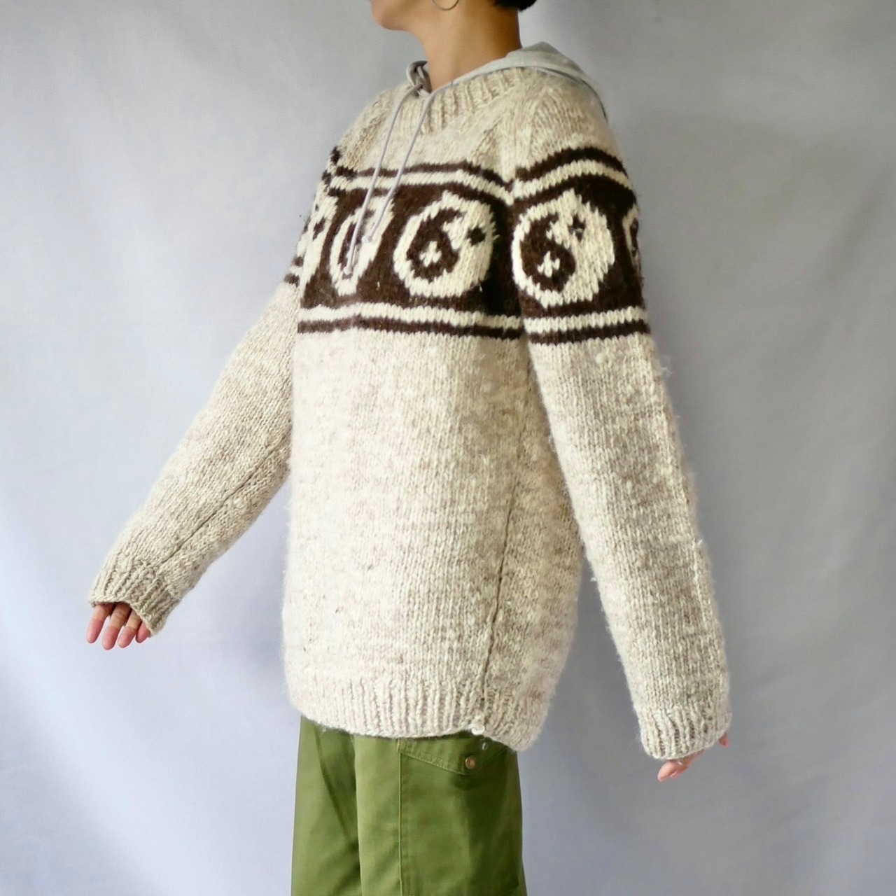 大きめでゆったり着られる、yin&yarn柄のニットです。ウールと思われる素材で、エクアドルなどの南米系の雰囲気です。