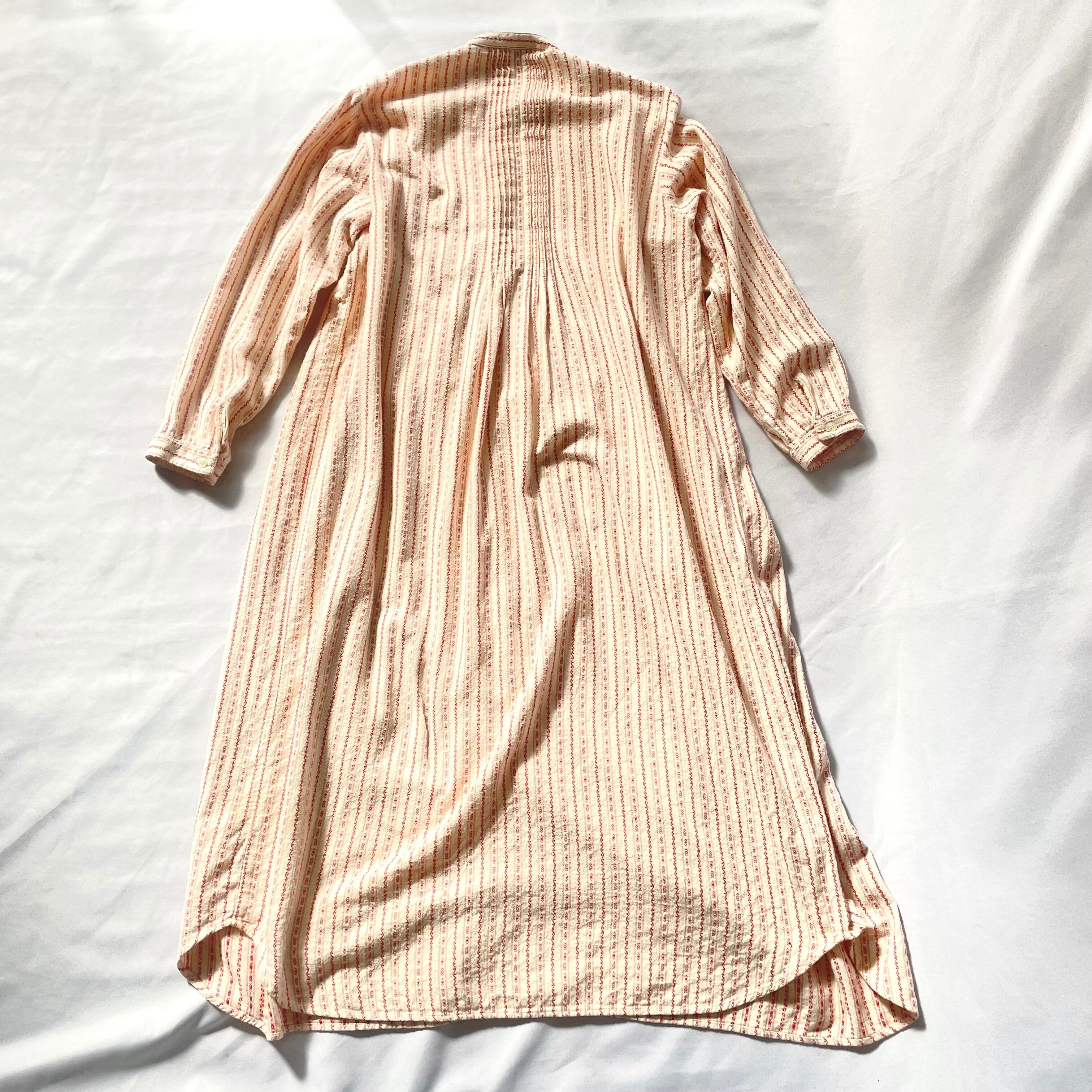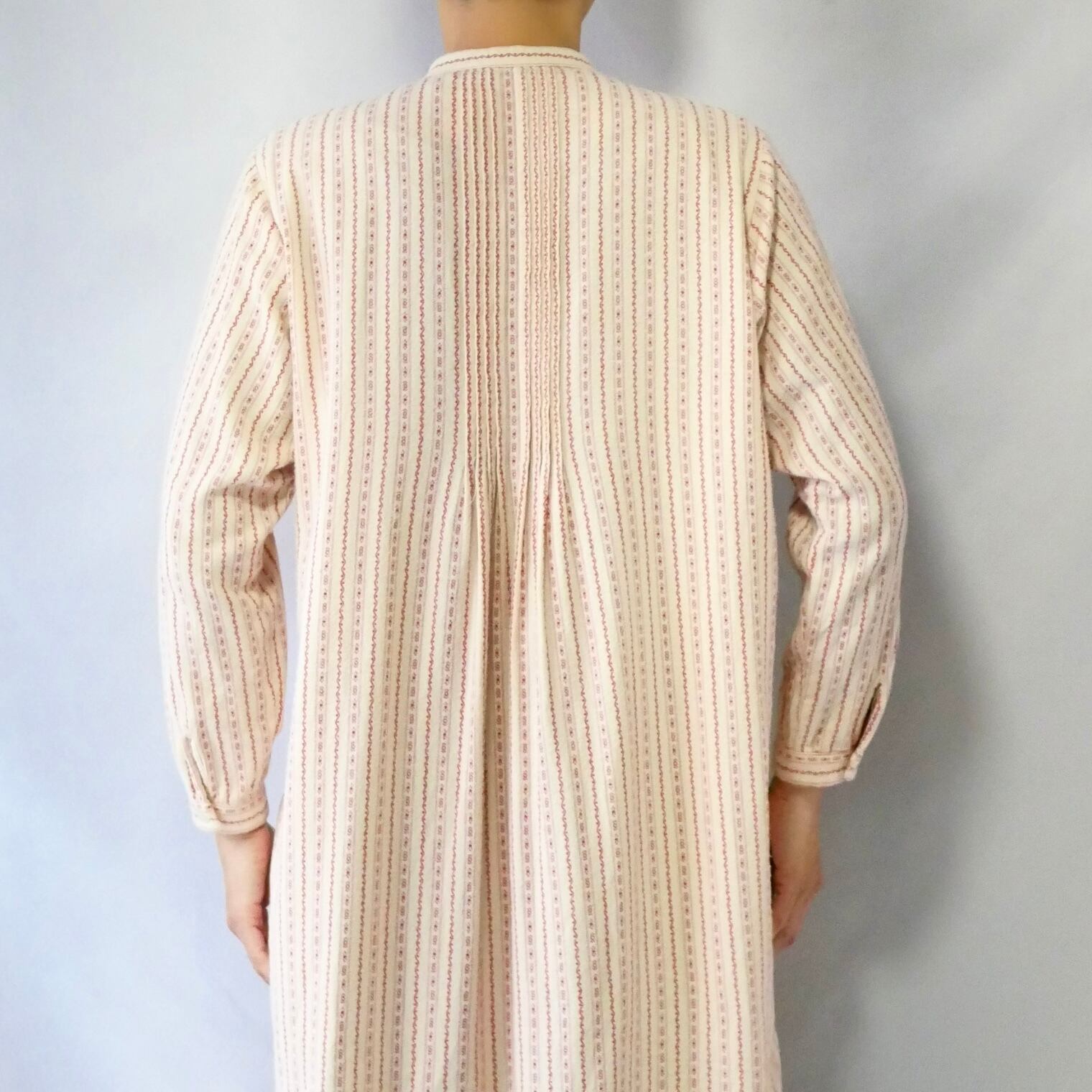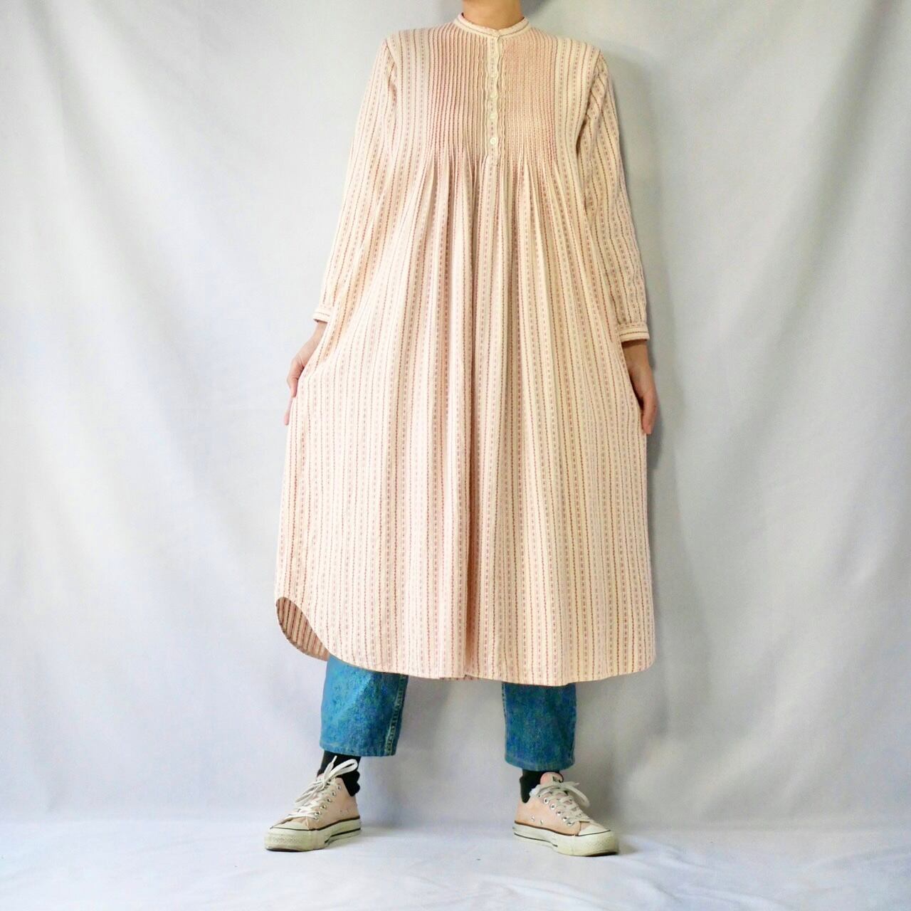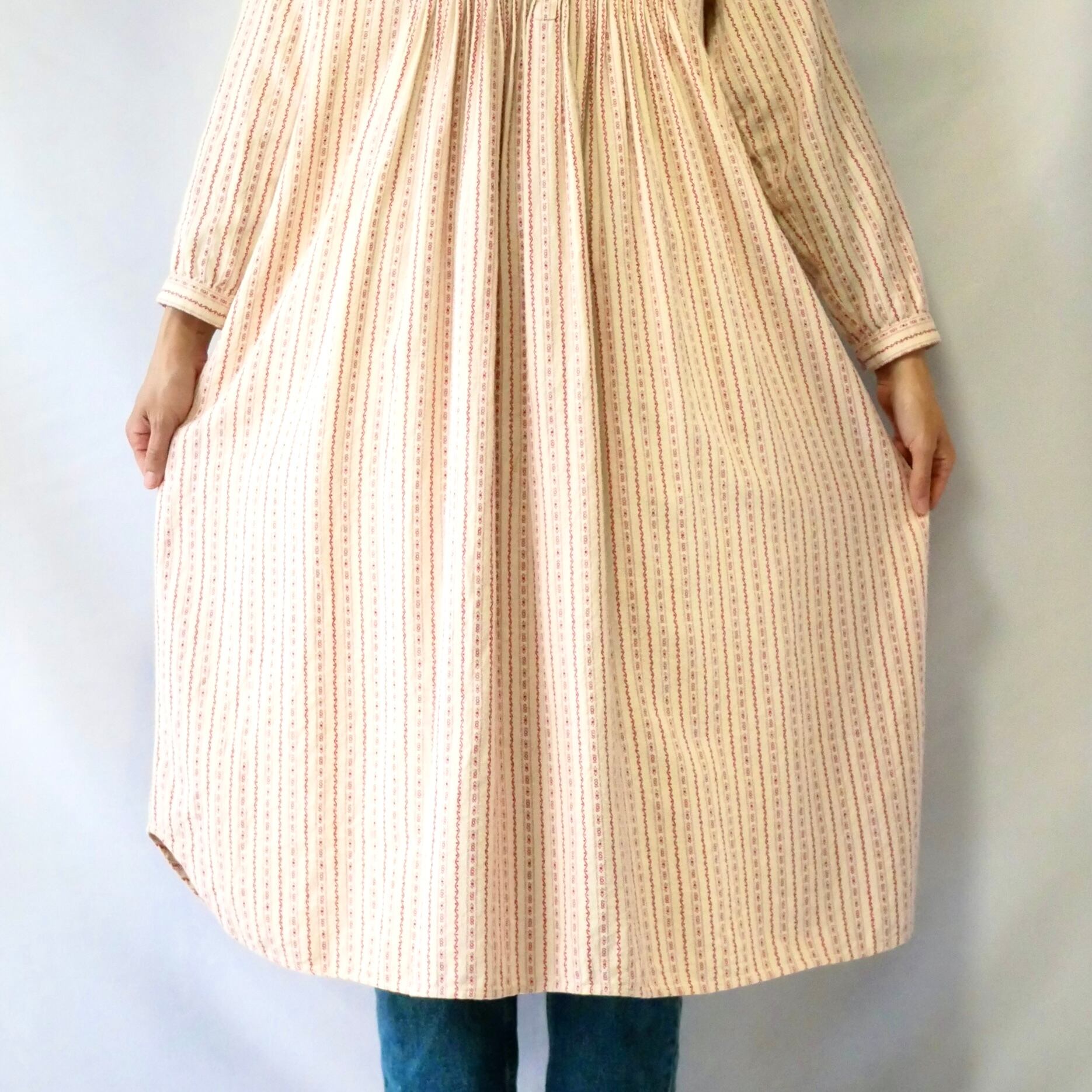 胸元にたっぷりプリーツが入った、L.L.bean アイボリー×赤 花柄 長袖ノーカラーワンピースです。