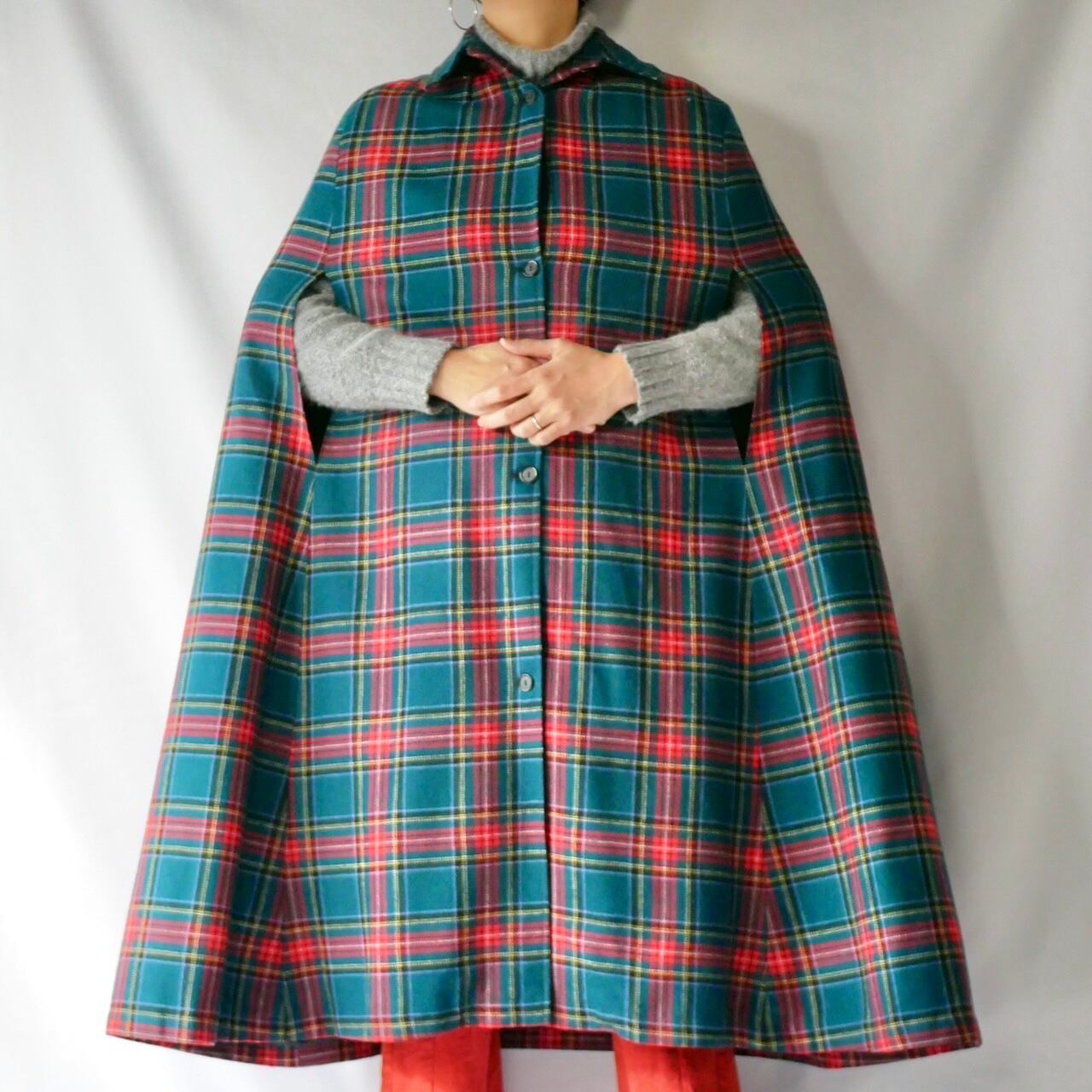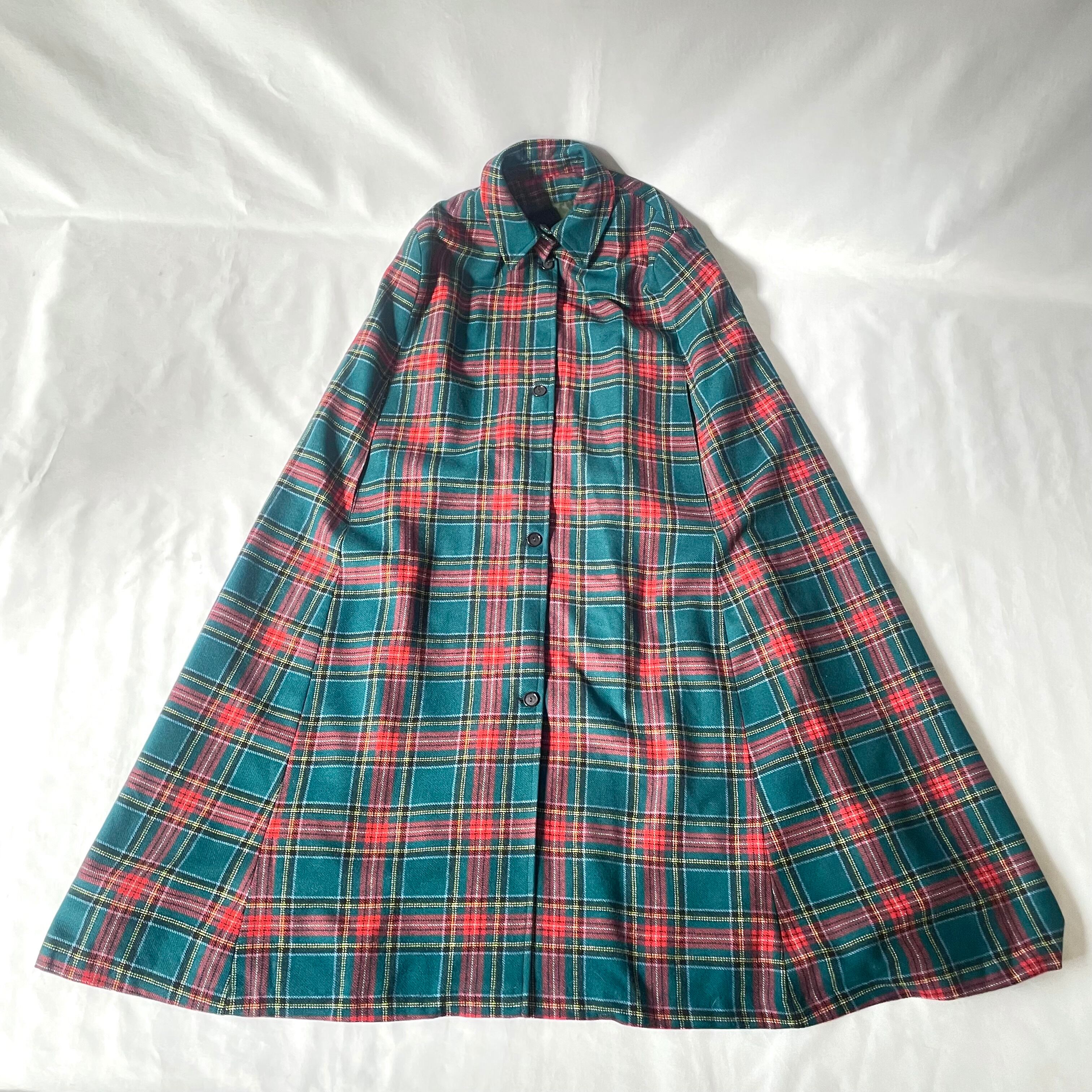 UK製グリーンタータンチェック柄ピュアアニューウール ロングマントです。状態良好です。
