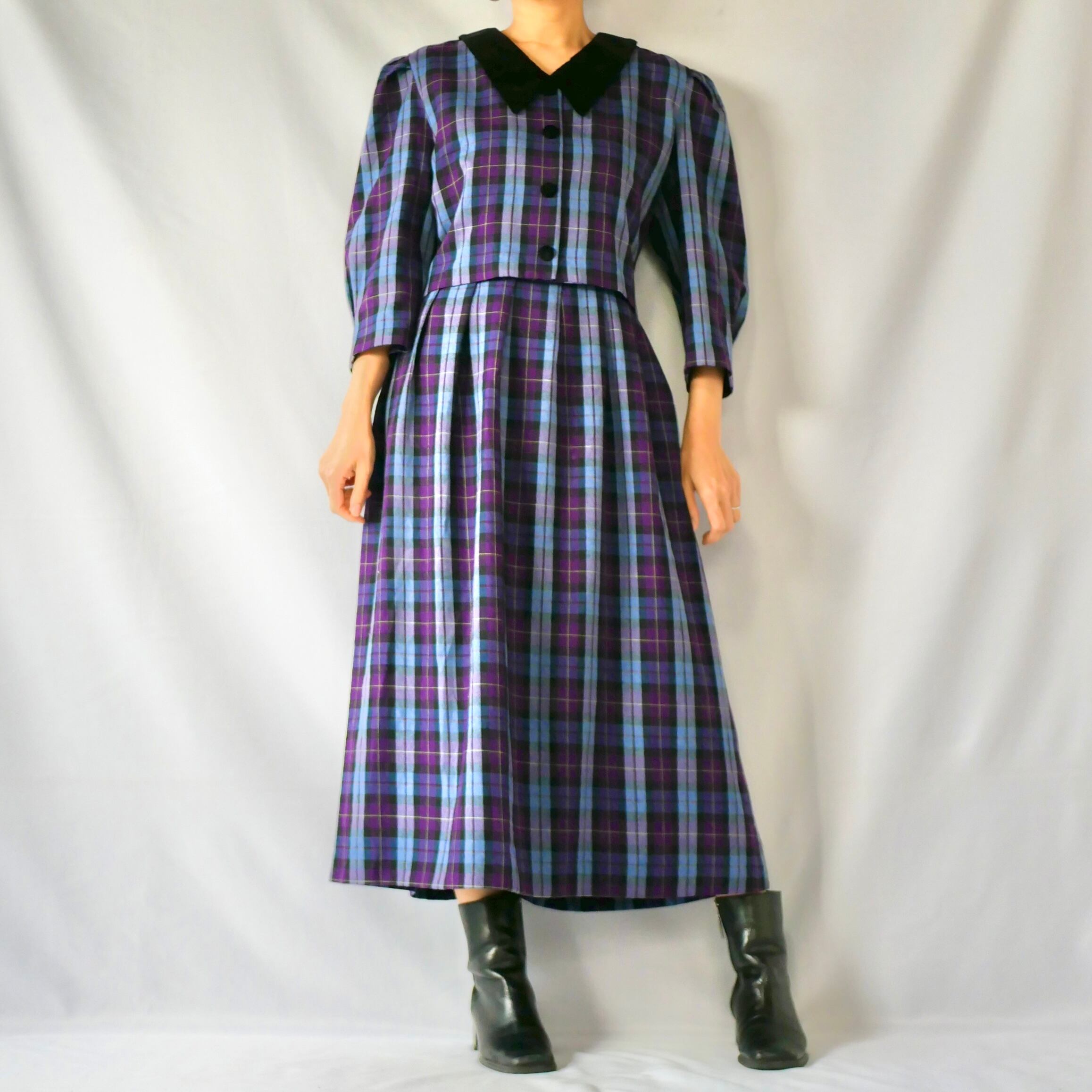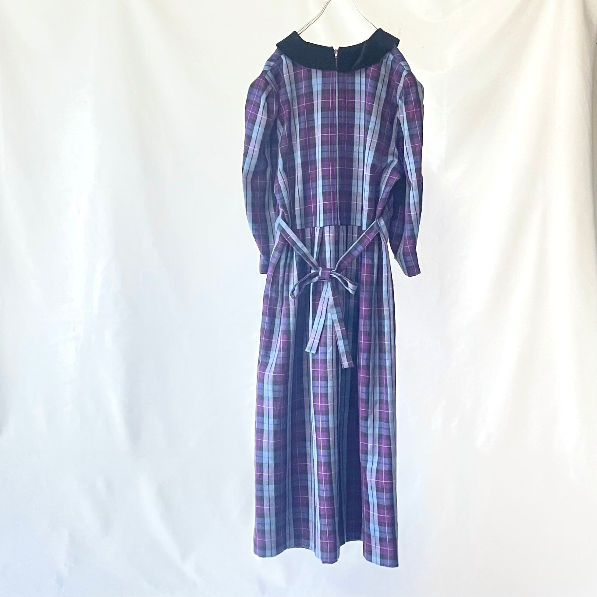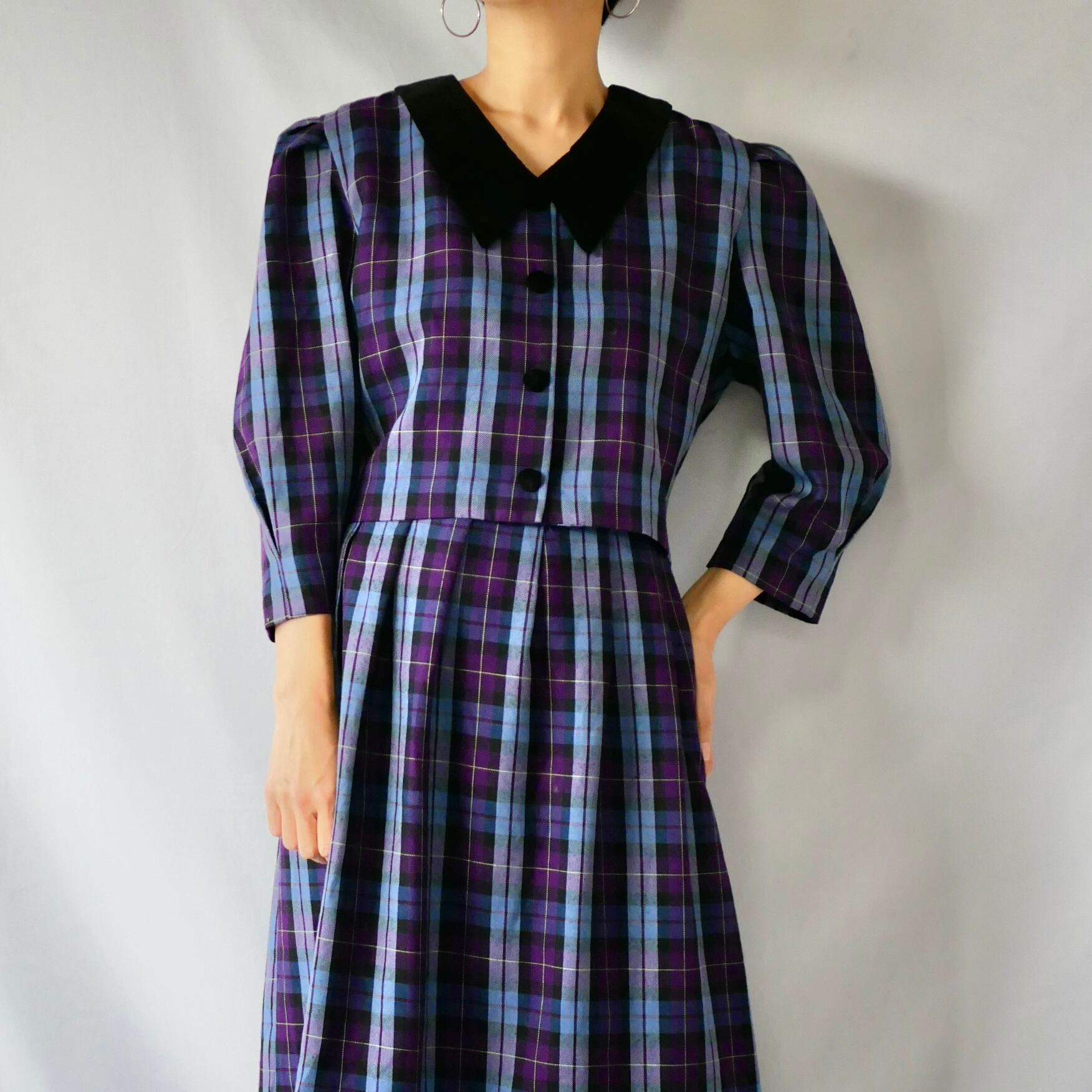 紫、ブルーのチェック柄に黒のベロア襟が可愛い、セットアップ風長袖ワンピースです。