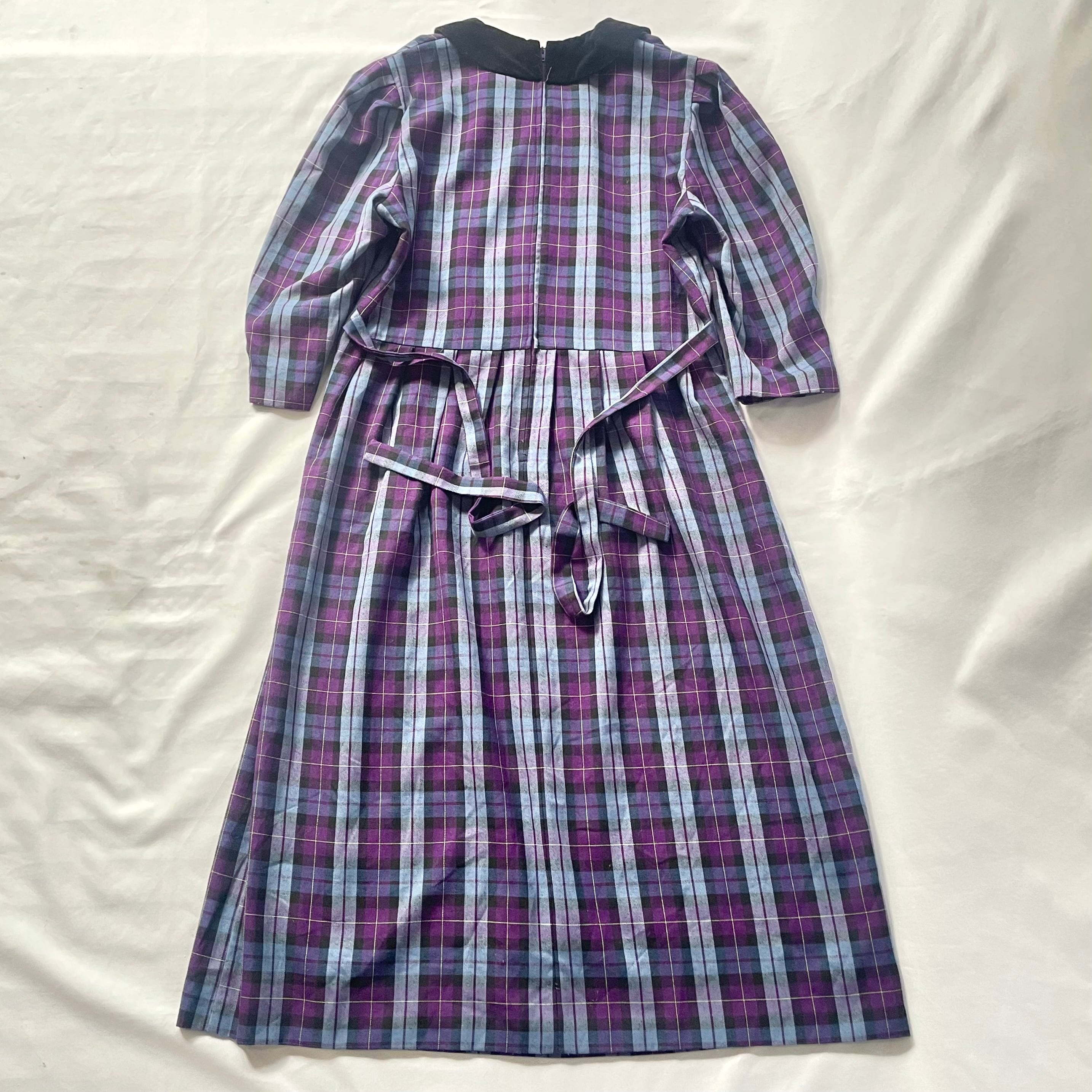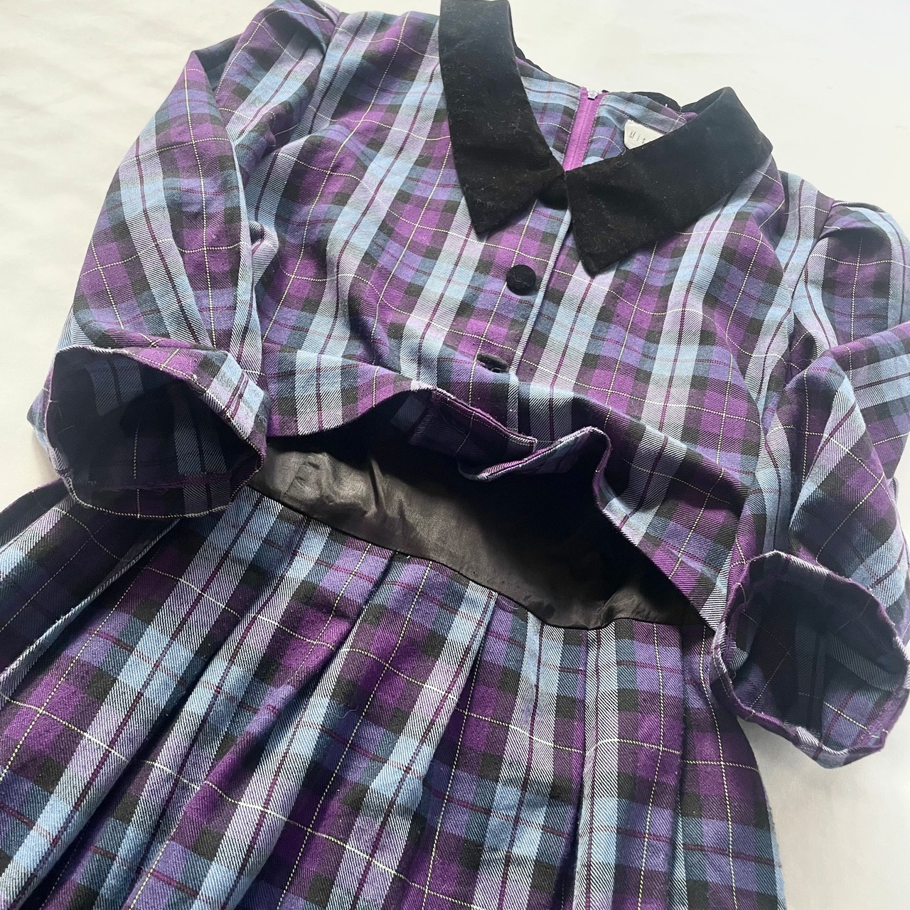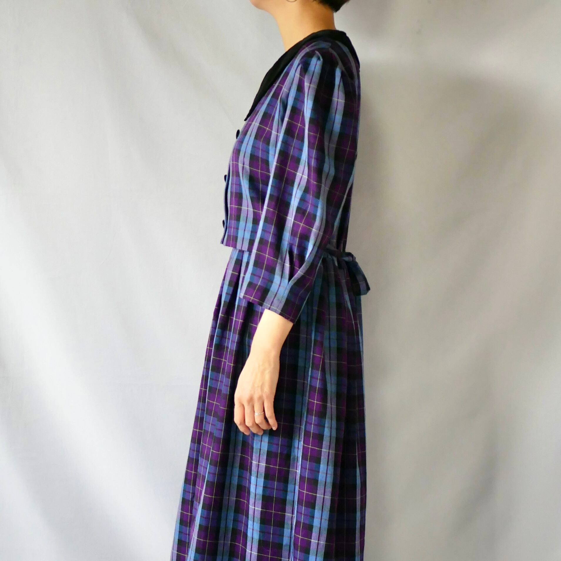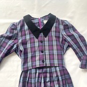 紫、ブルーのチェック柄に黒のベロア襟が可愛い、セットアップ風長袖ワンピースです。