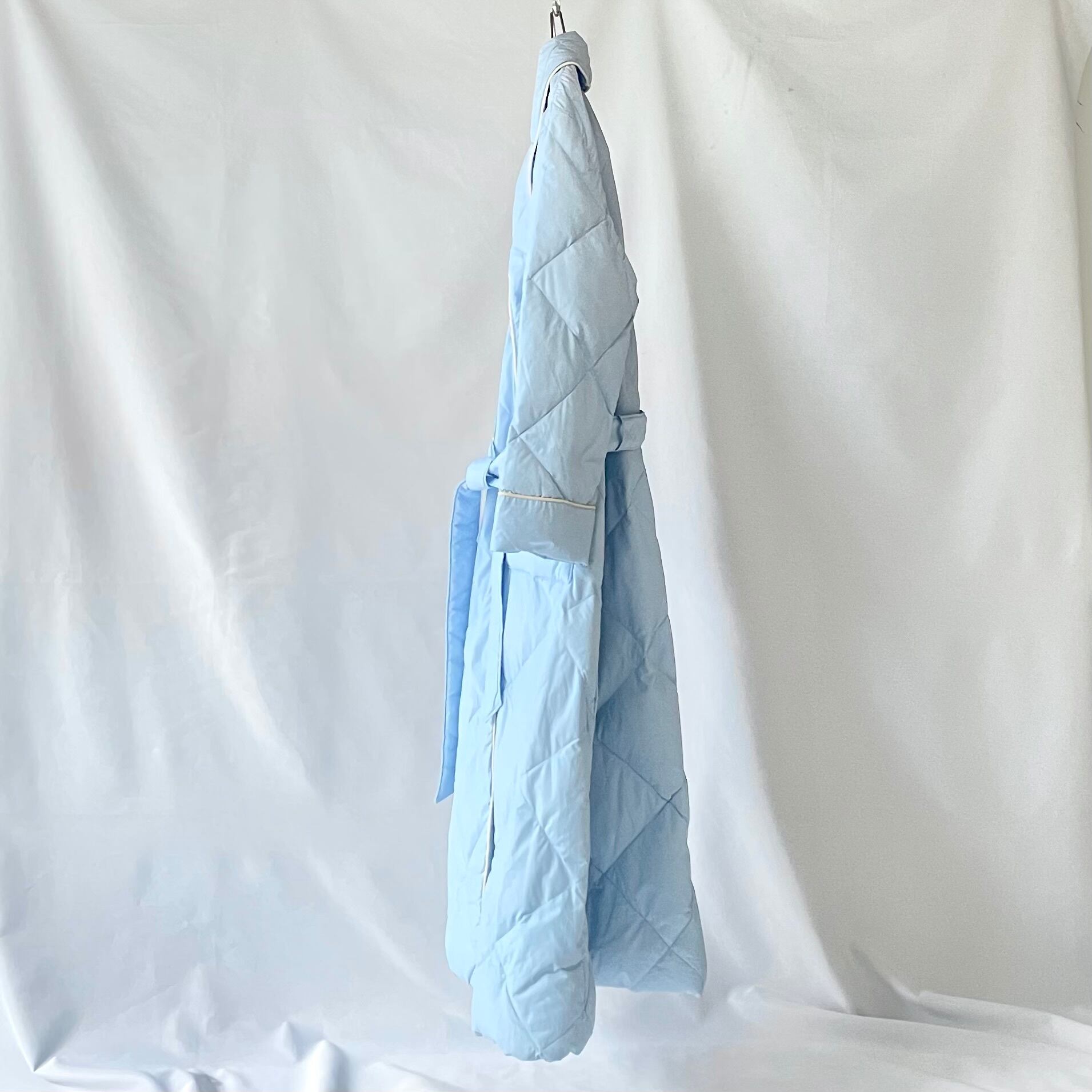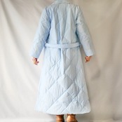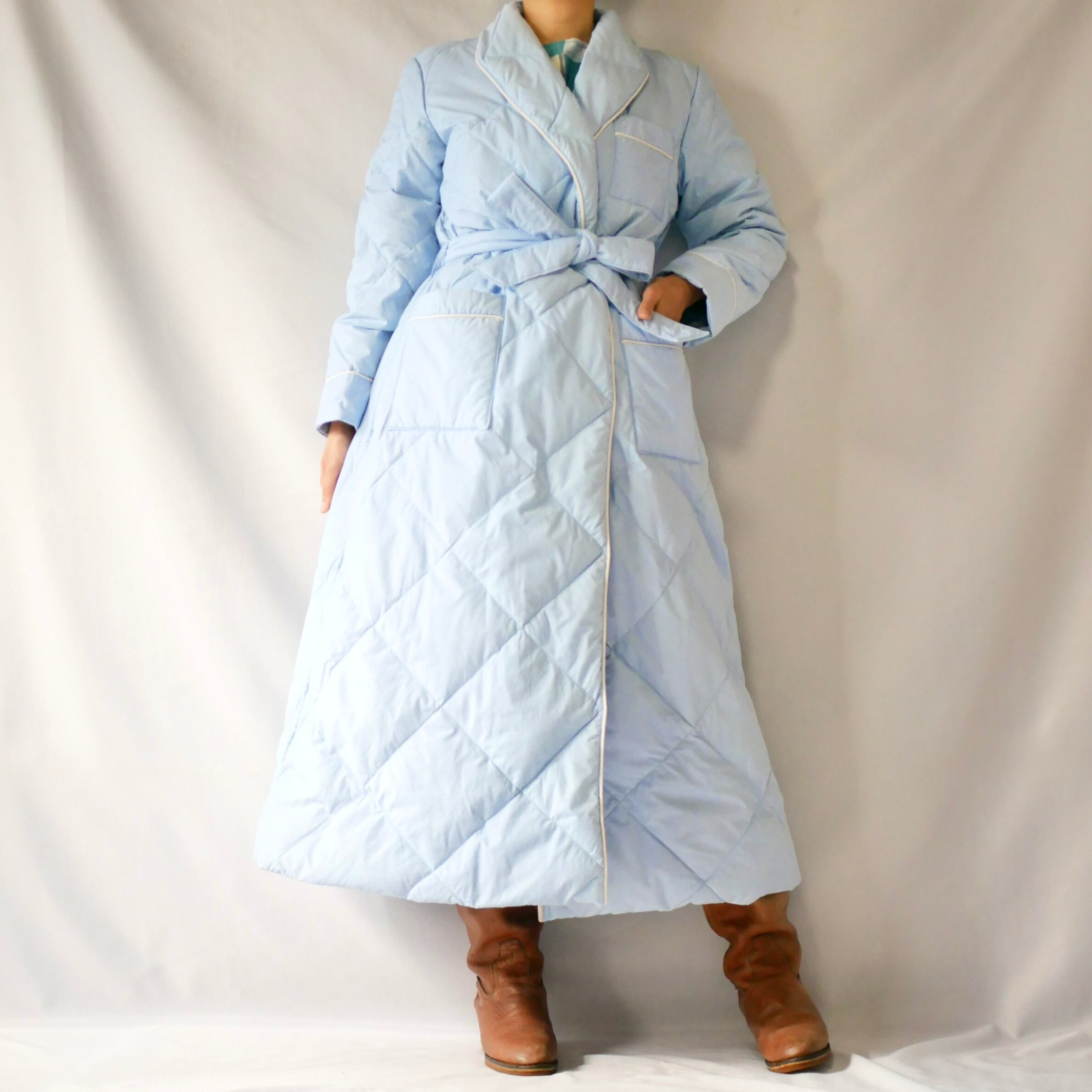 8-90年代ヴィンテージ EDDIE BAUERの淡い水色が珍しいグースダウン100% ガウンタイプ ロングコートです。ポケット、ベルト紐付き