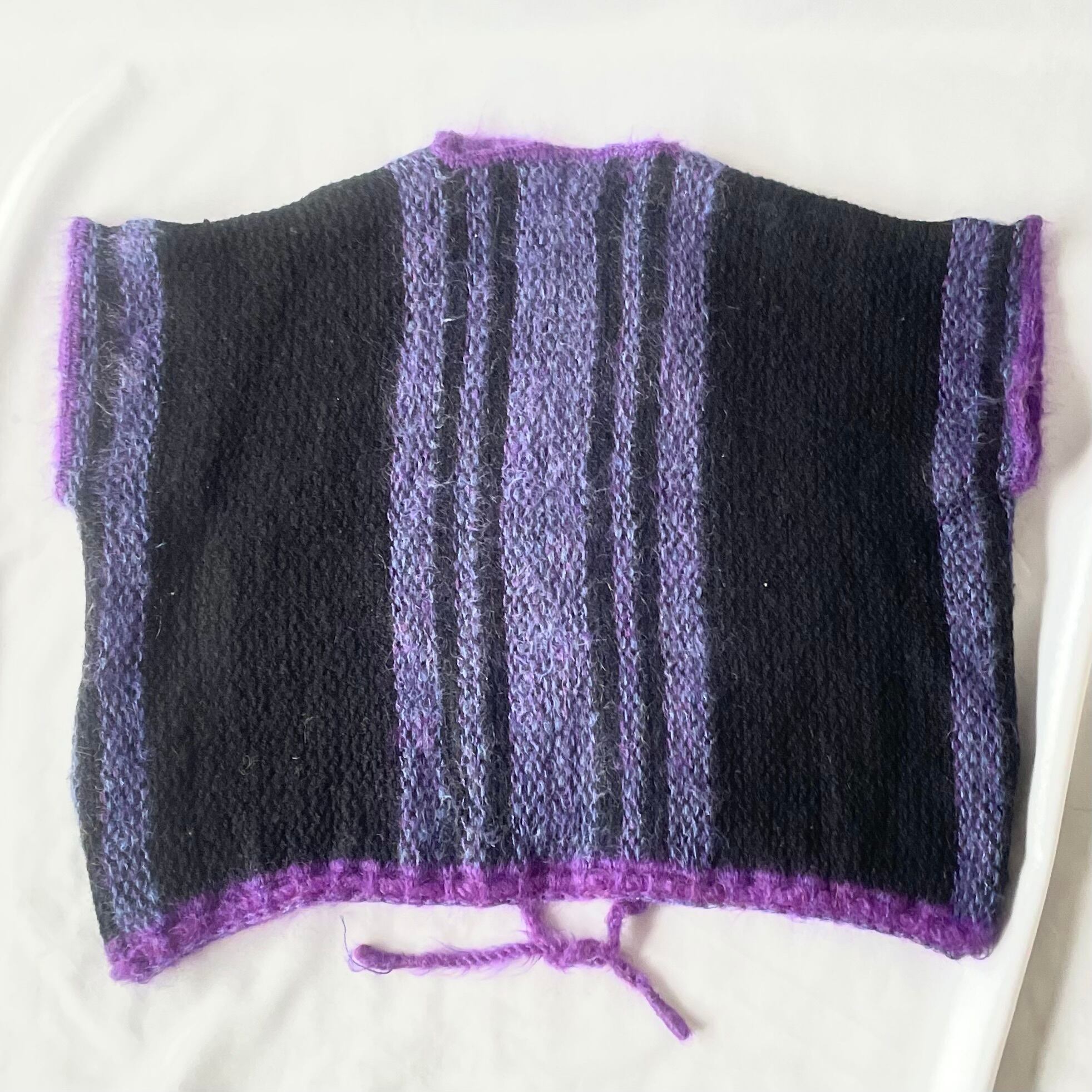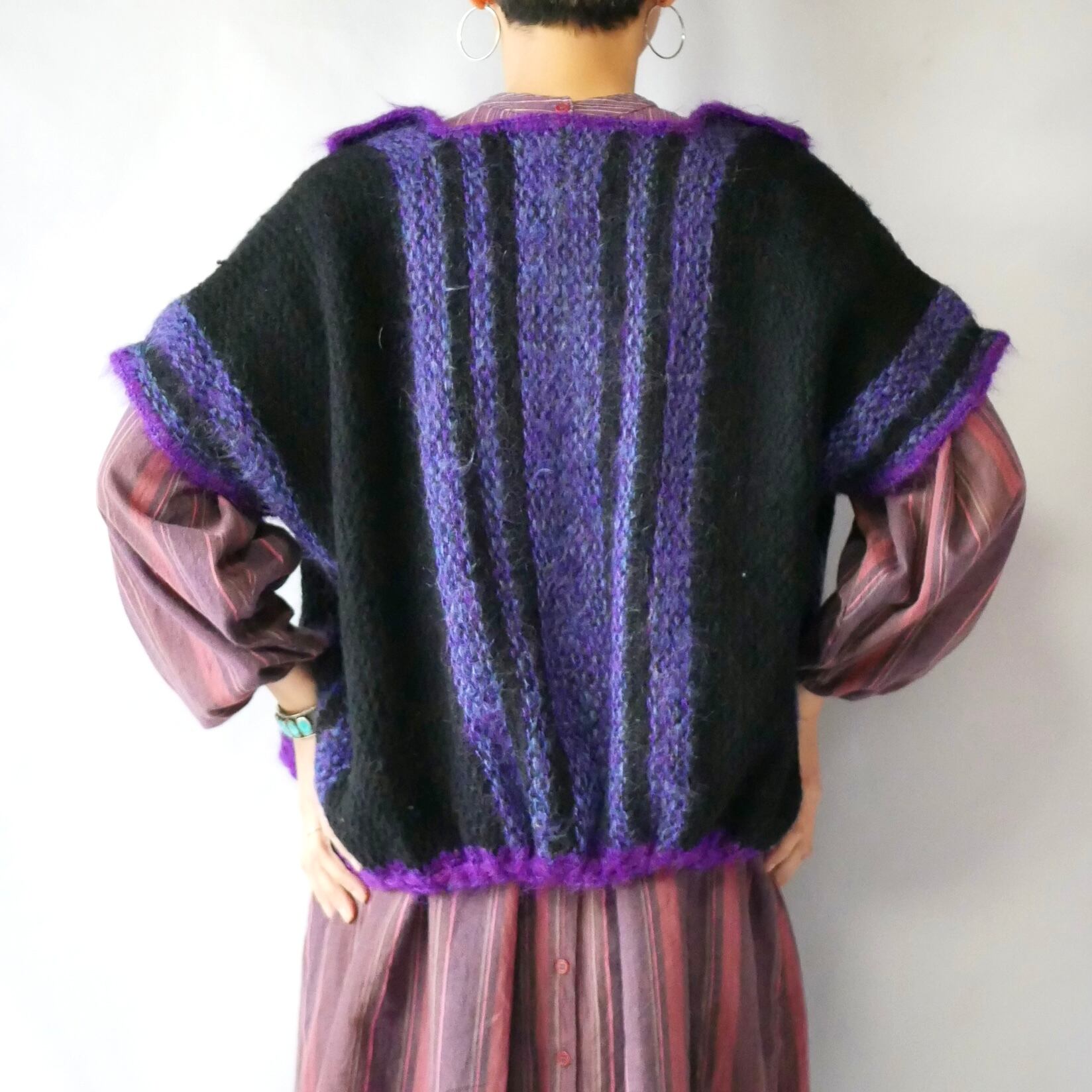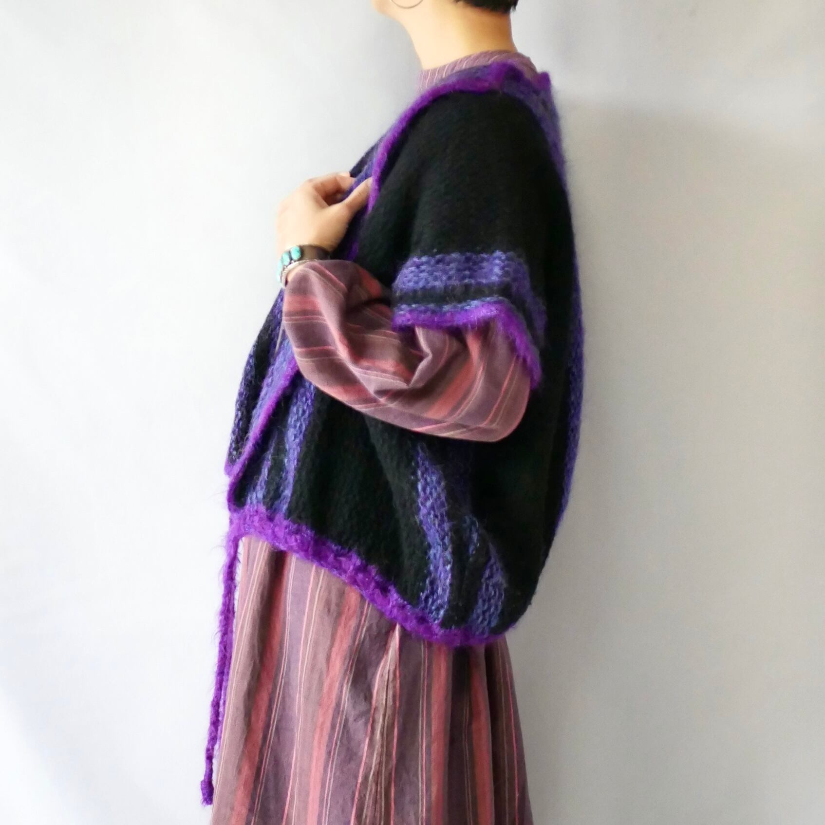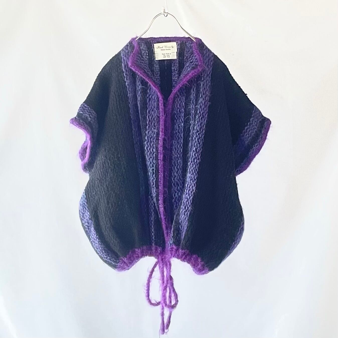 黒地に紫のふんわりした手織りニットが素敵な、ヴィンテージフレンチスリーブ前開きニットベストです。