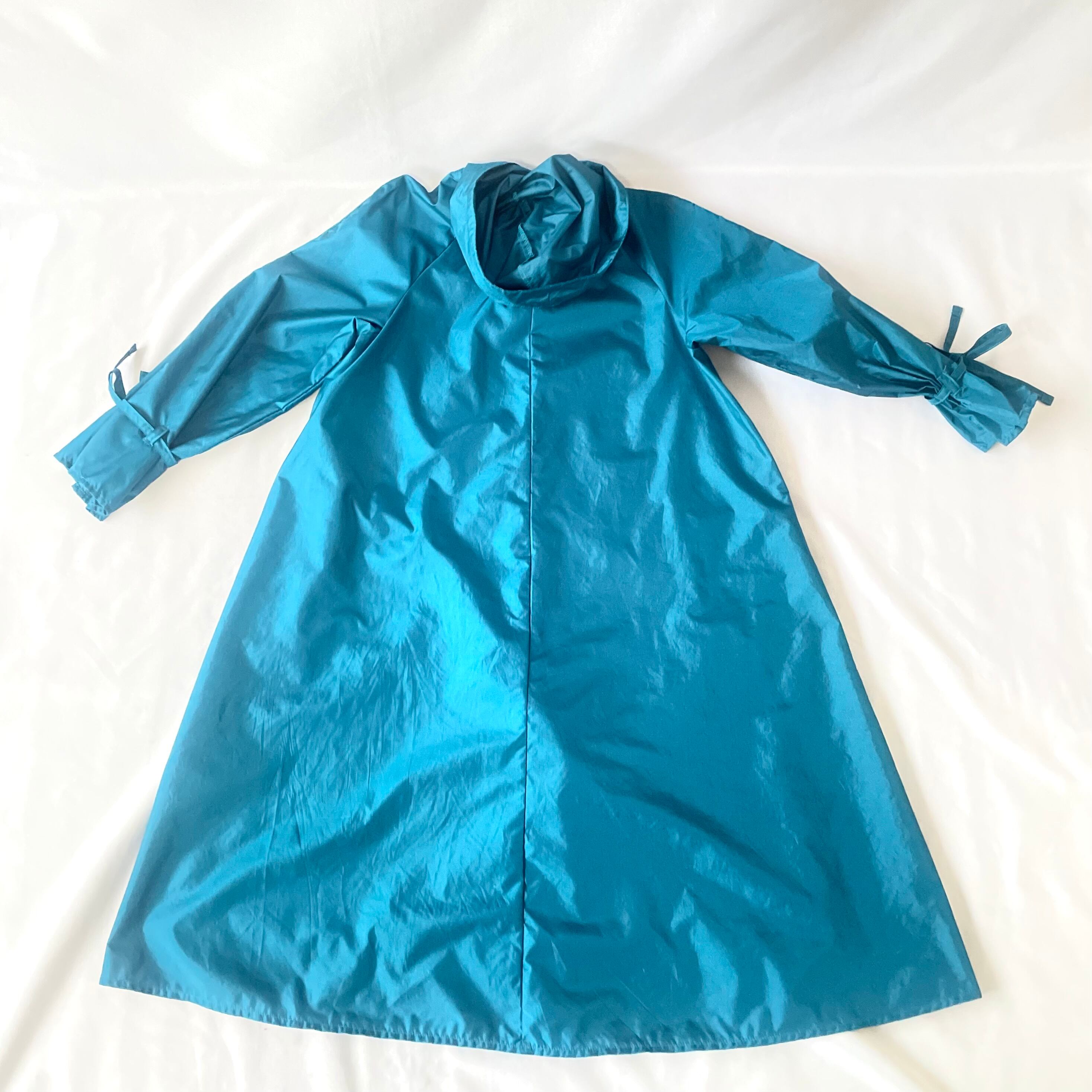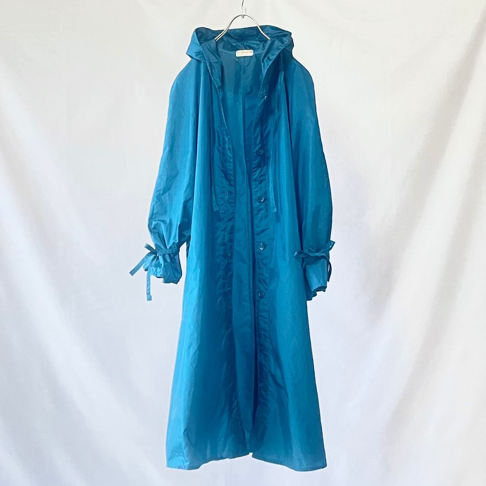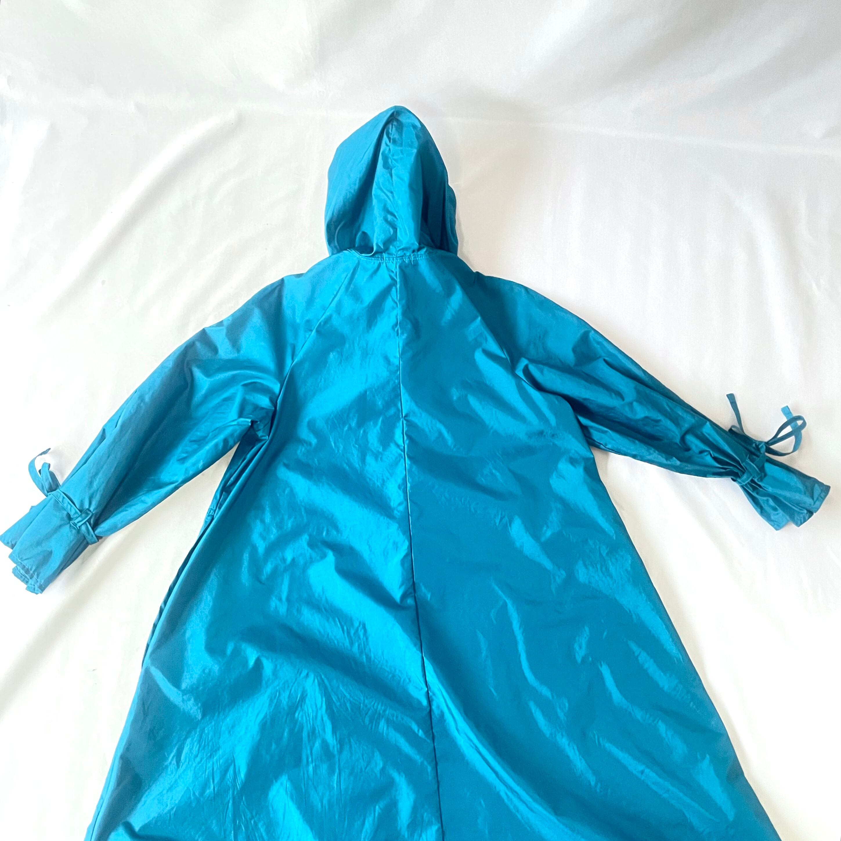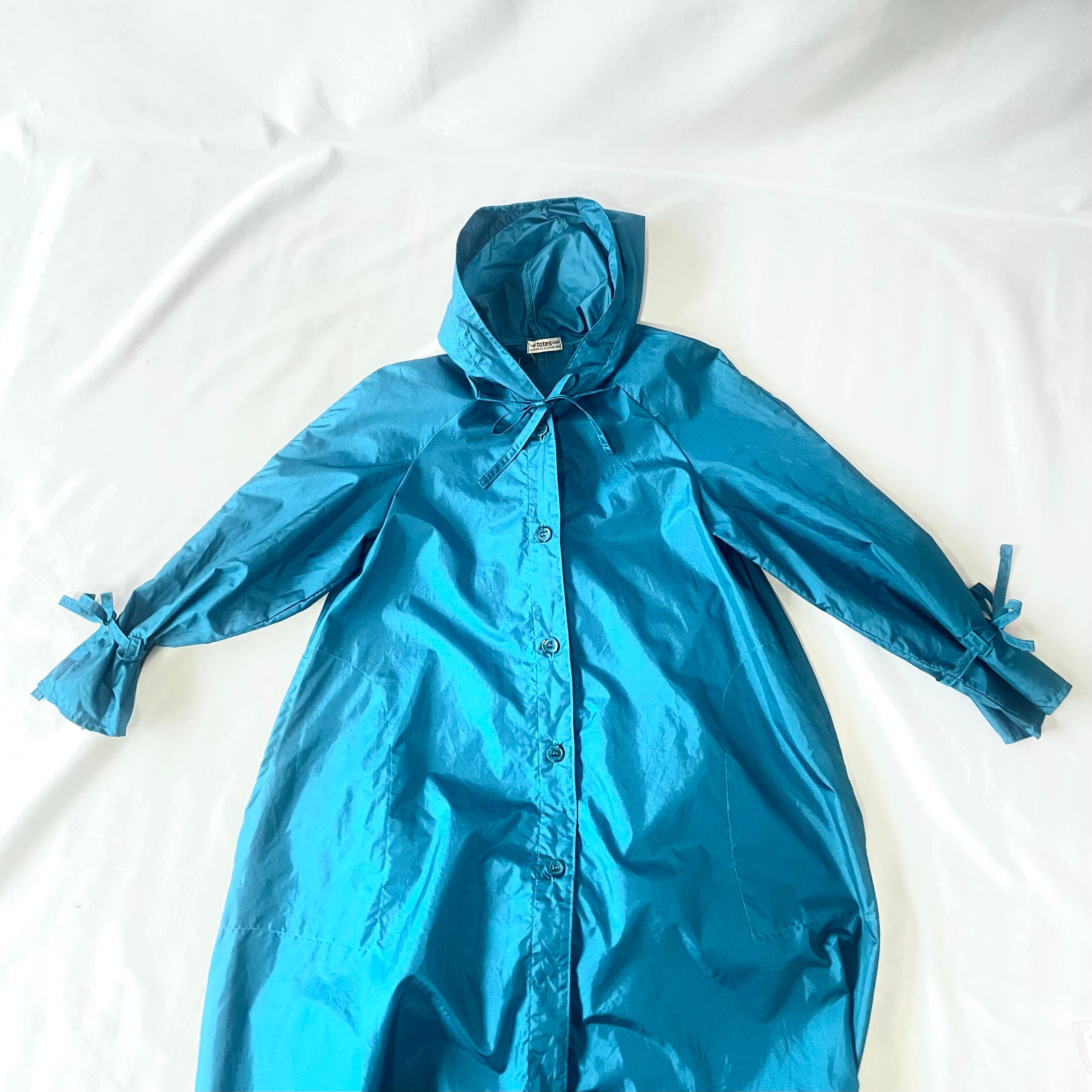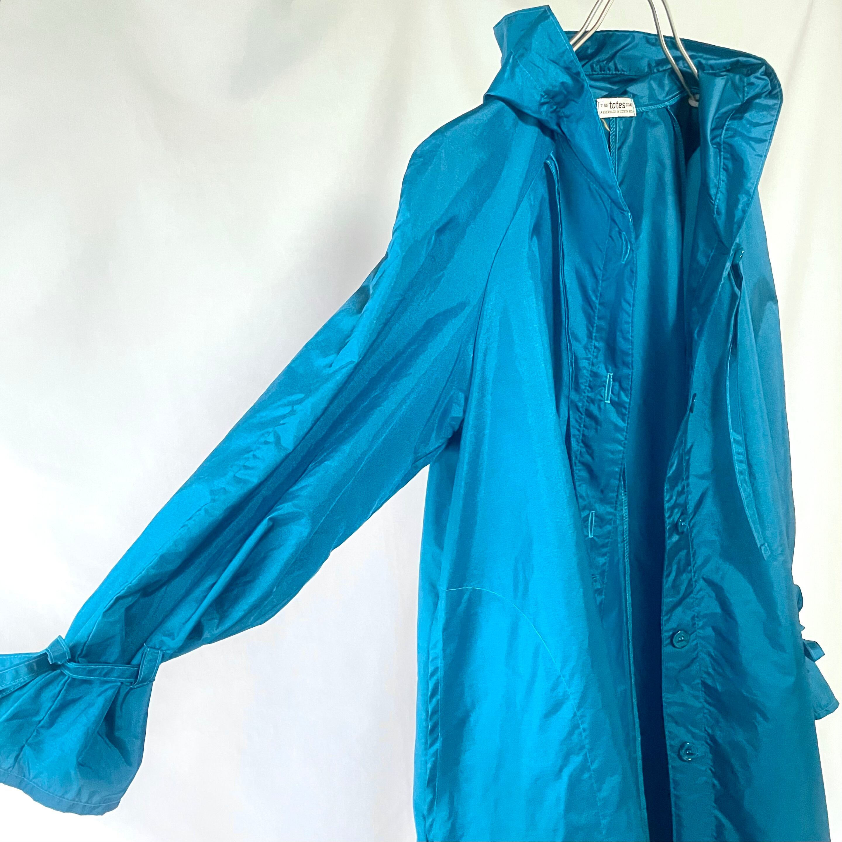 アメリカのレイングッズメイカーtotesのヴィンテージ ! フード付き フレアシルエット レインコートです。袖口にリボン紐付きで、ふんわりさせると可愛いです。ポケット付き