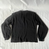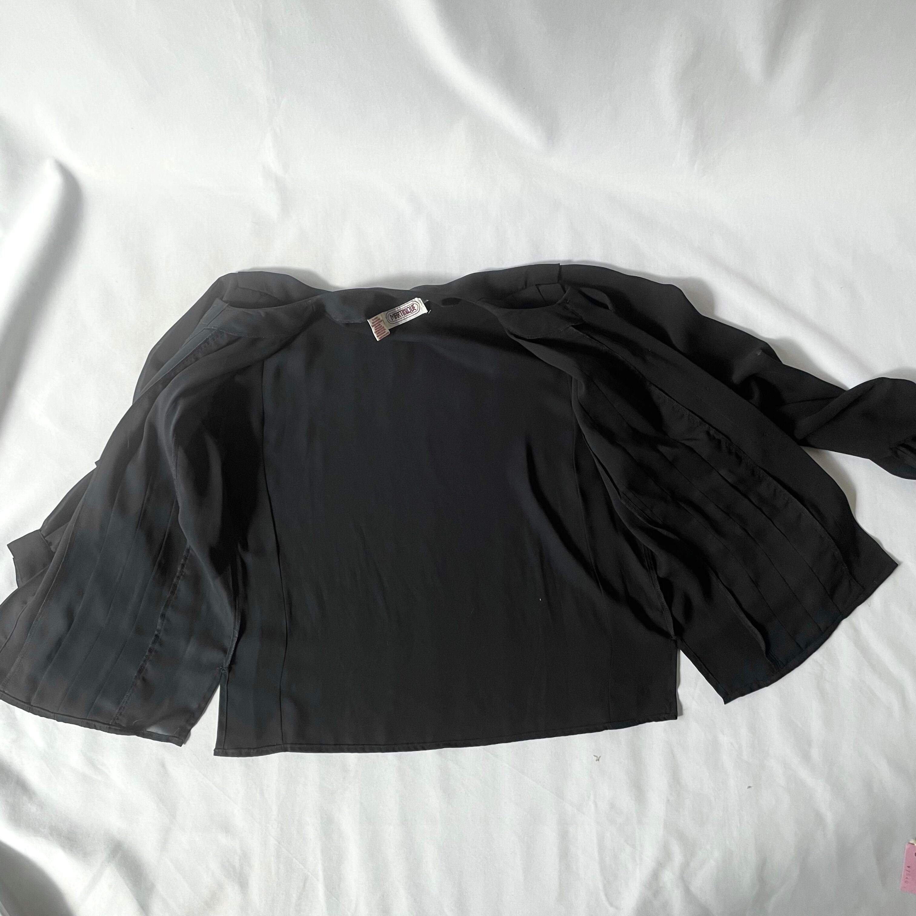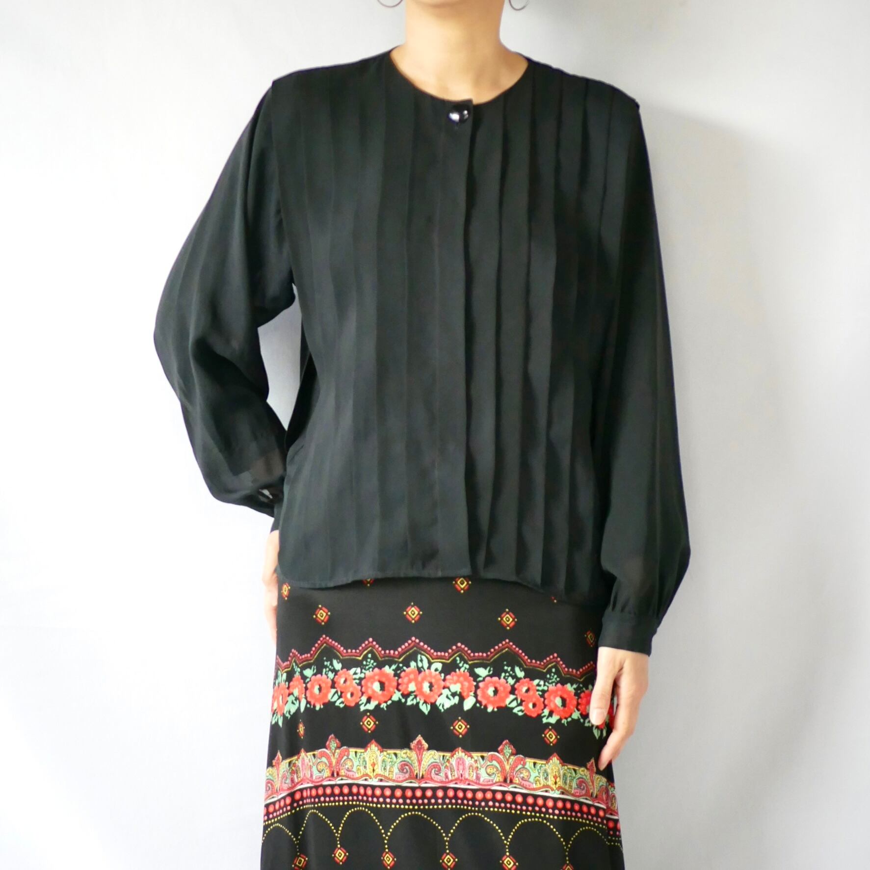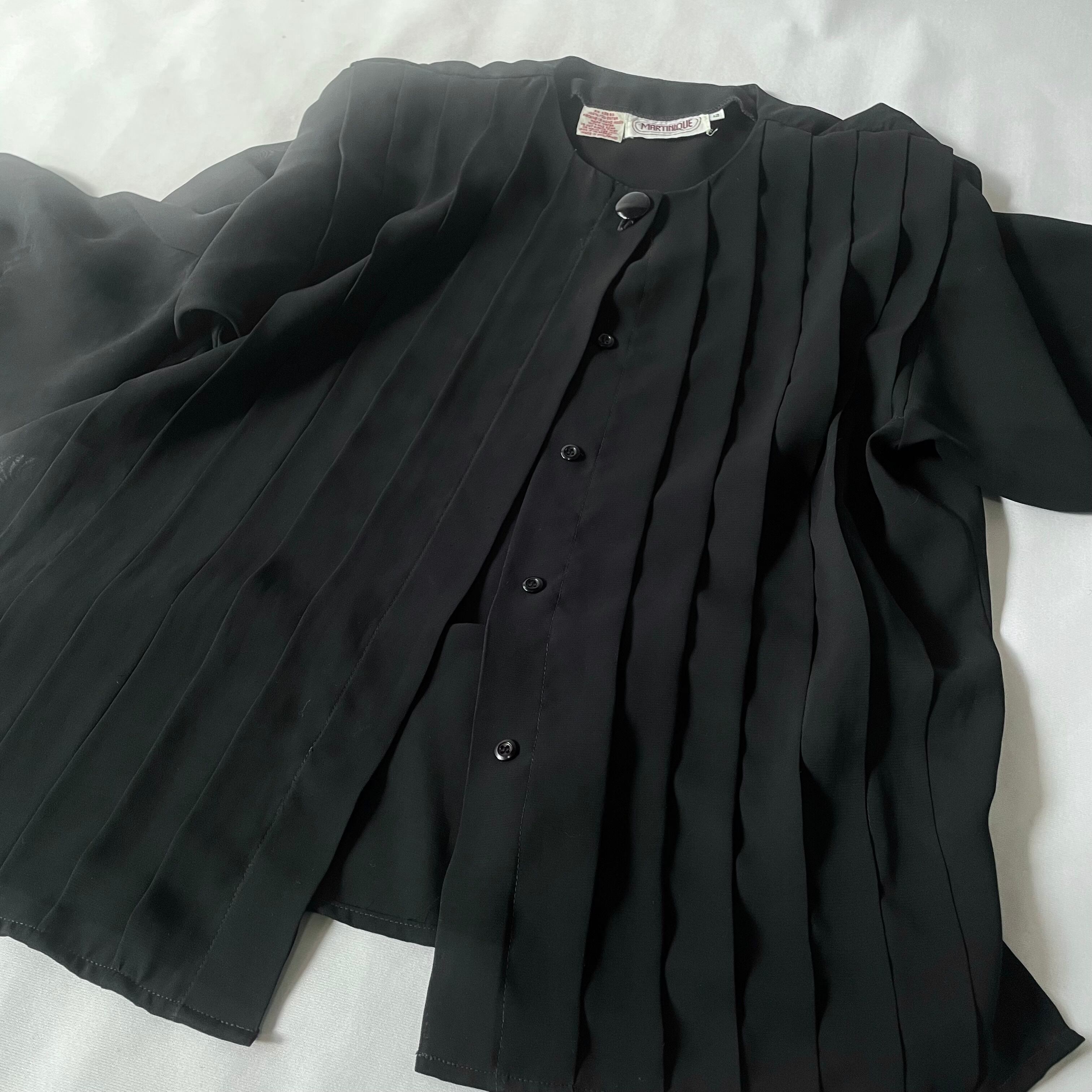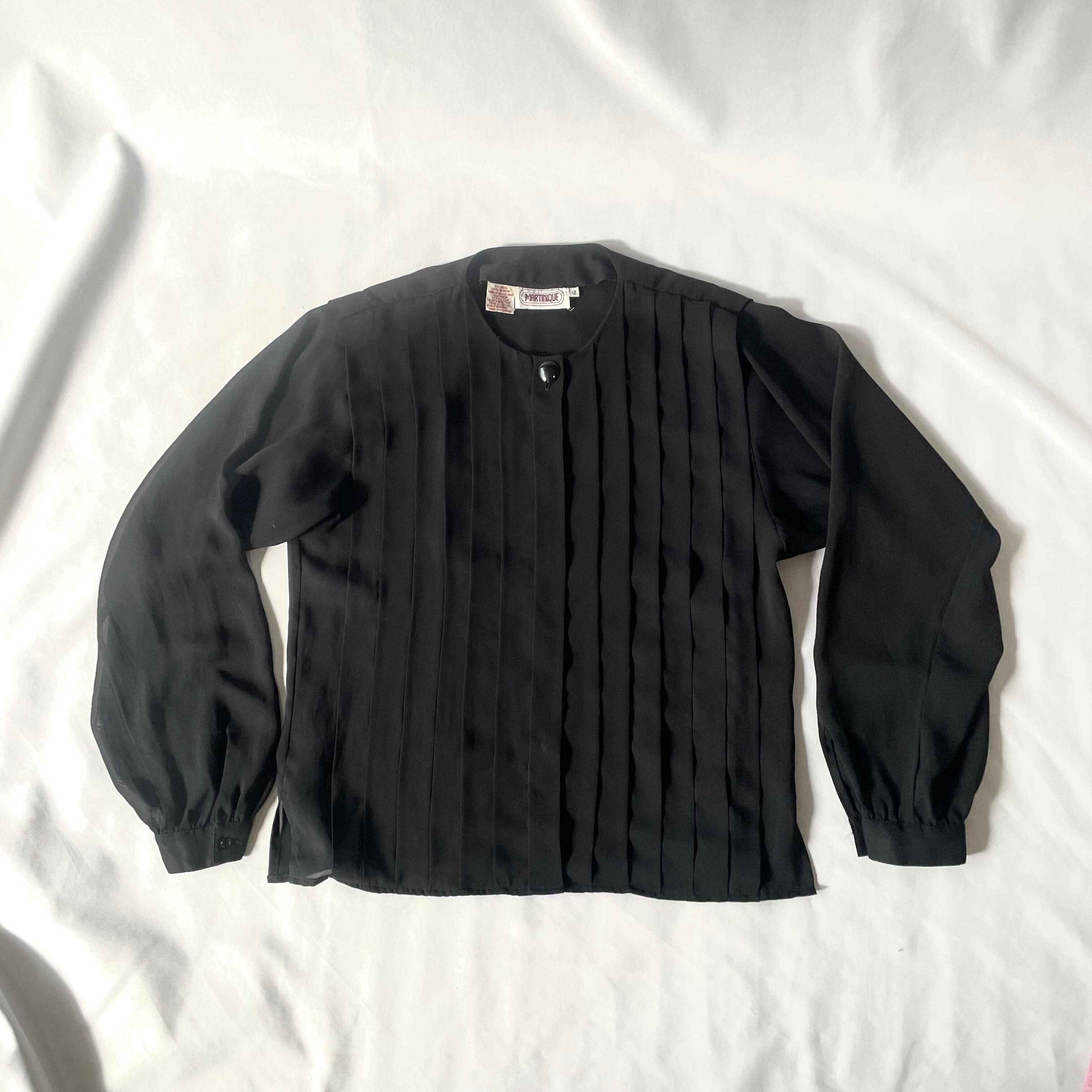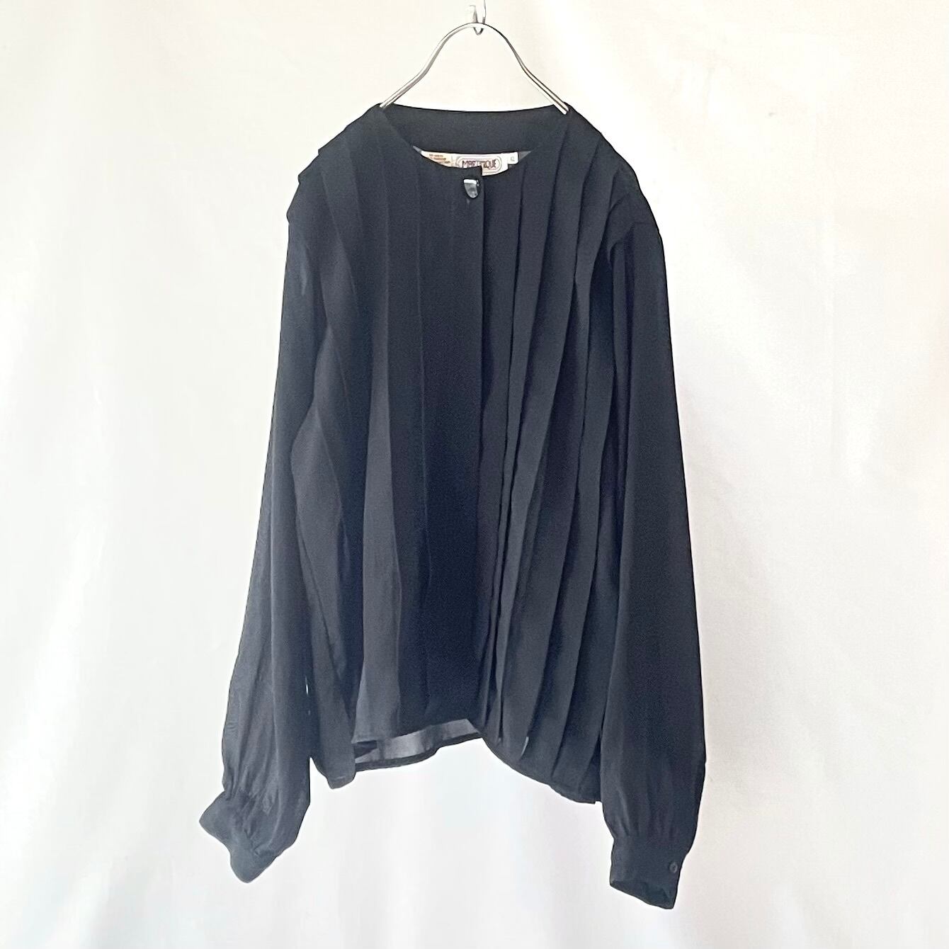 透け感のある80s頃の黒プリーツノーカラーブラウスです。