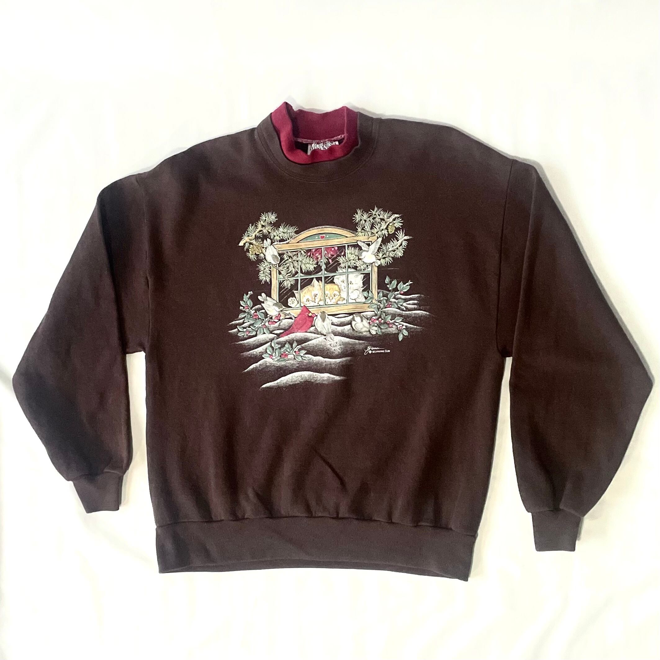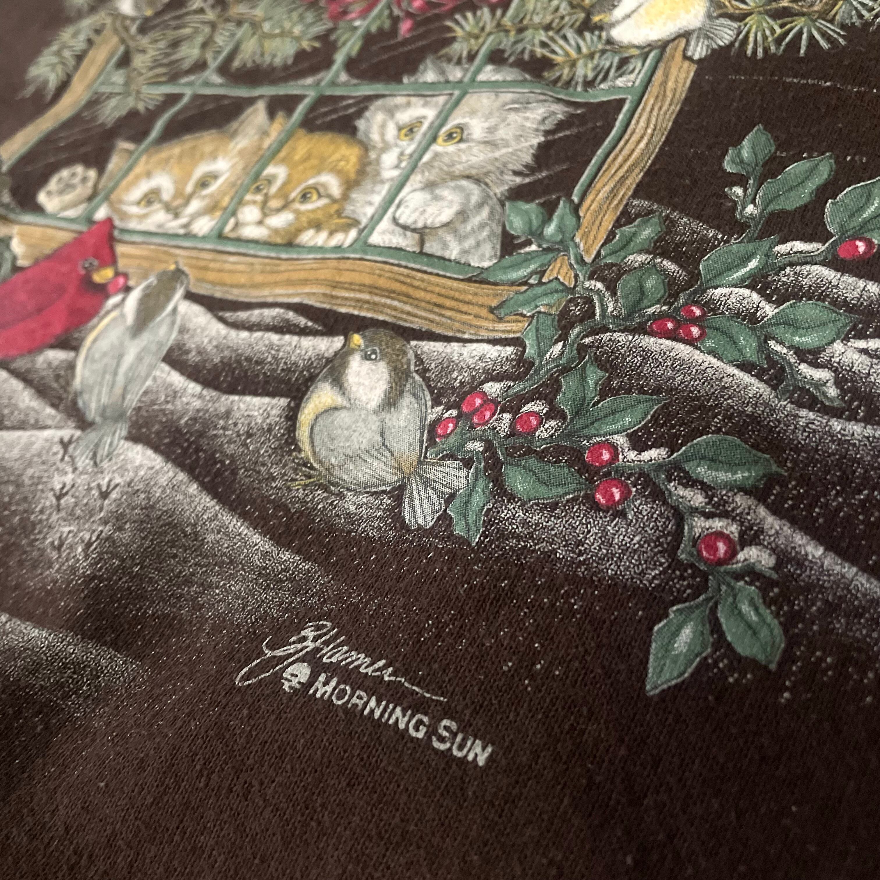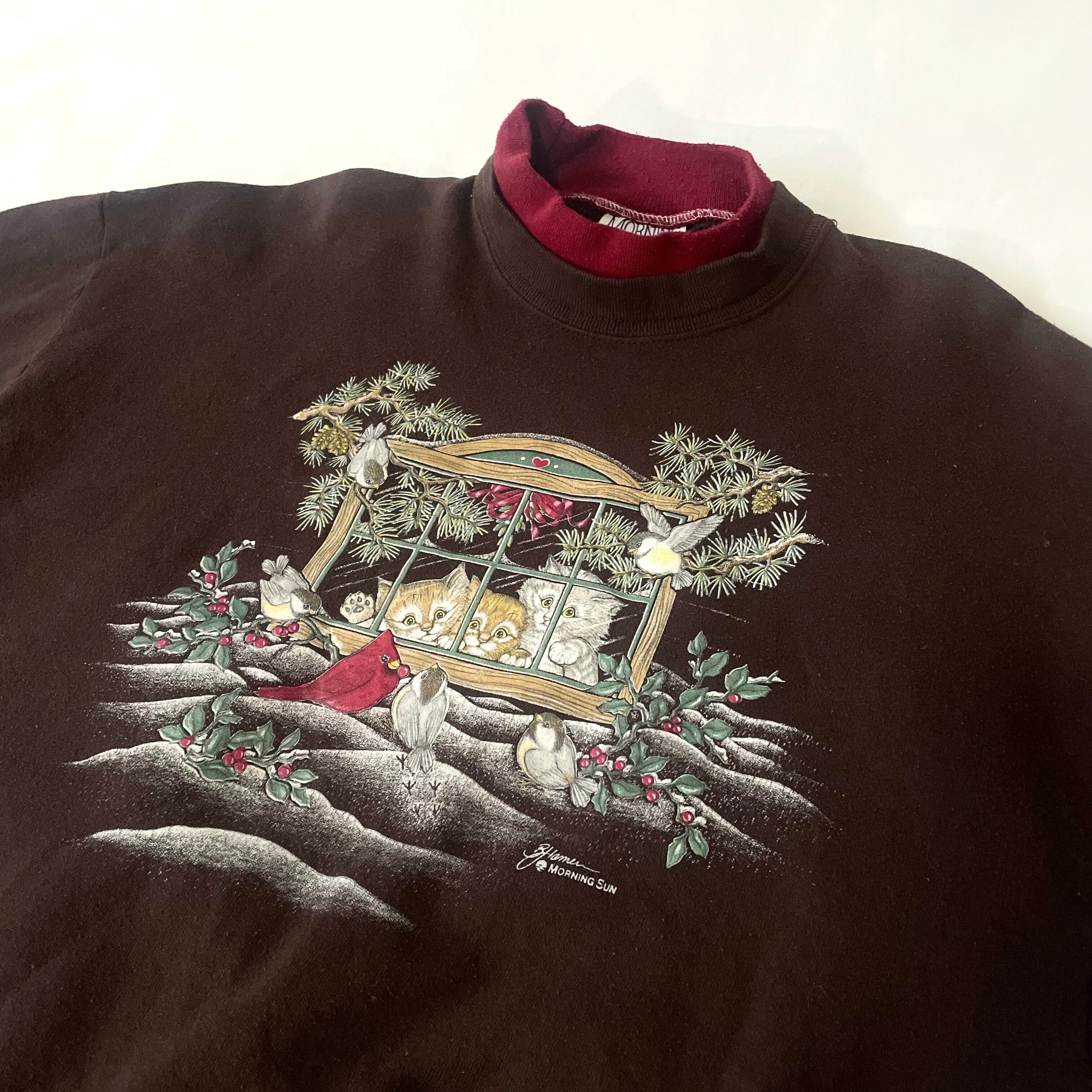 アメリカ製 MorningSun ブラウン ネコプリントスウェットです。鳥が窓の中の猫に注目されているプリントが可愛いです。