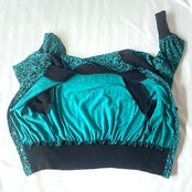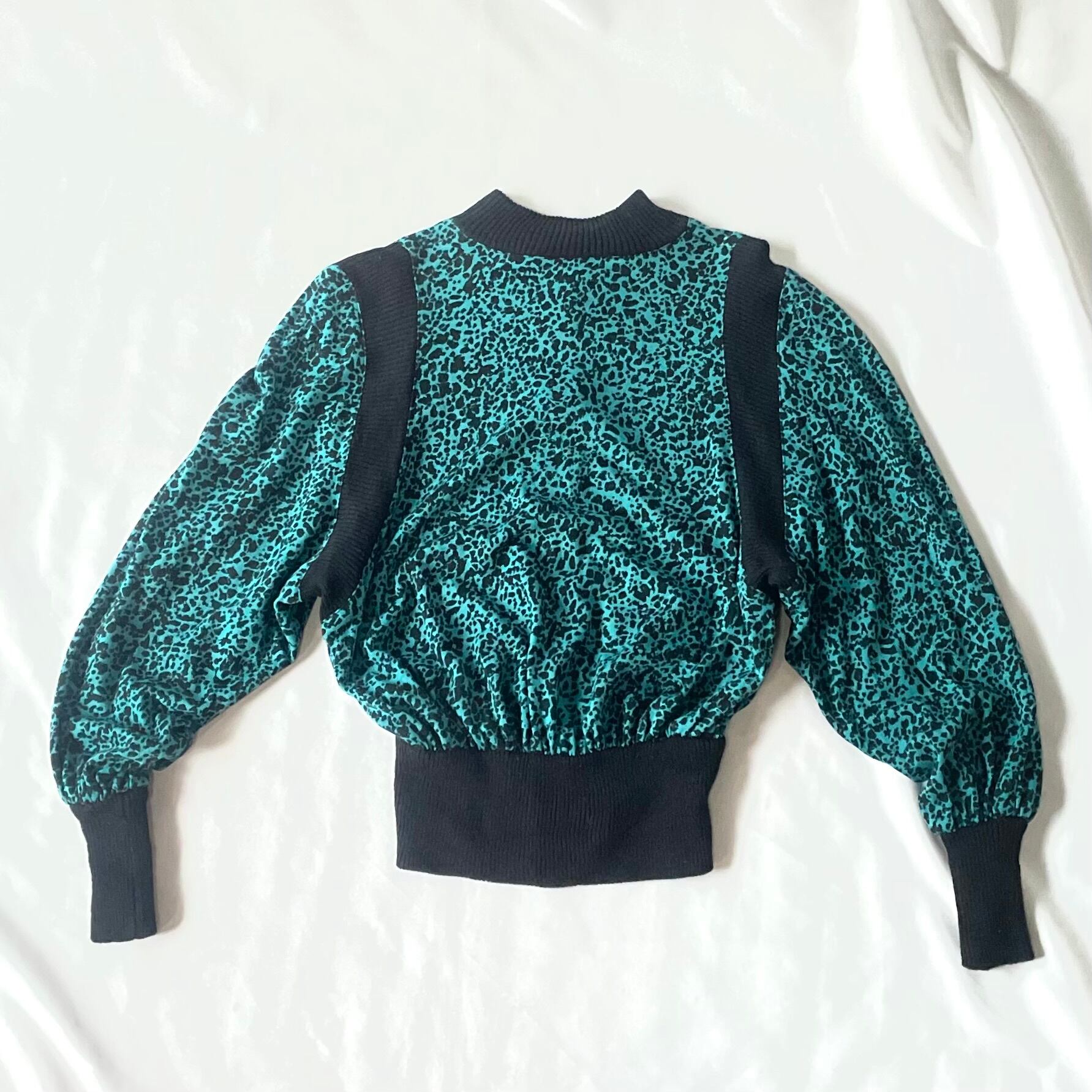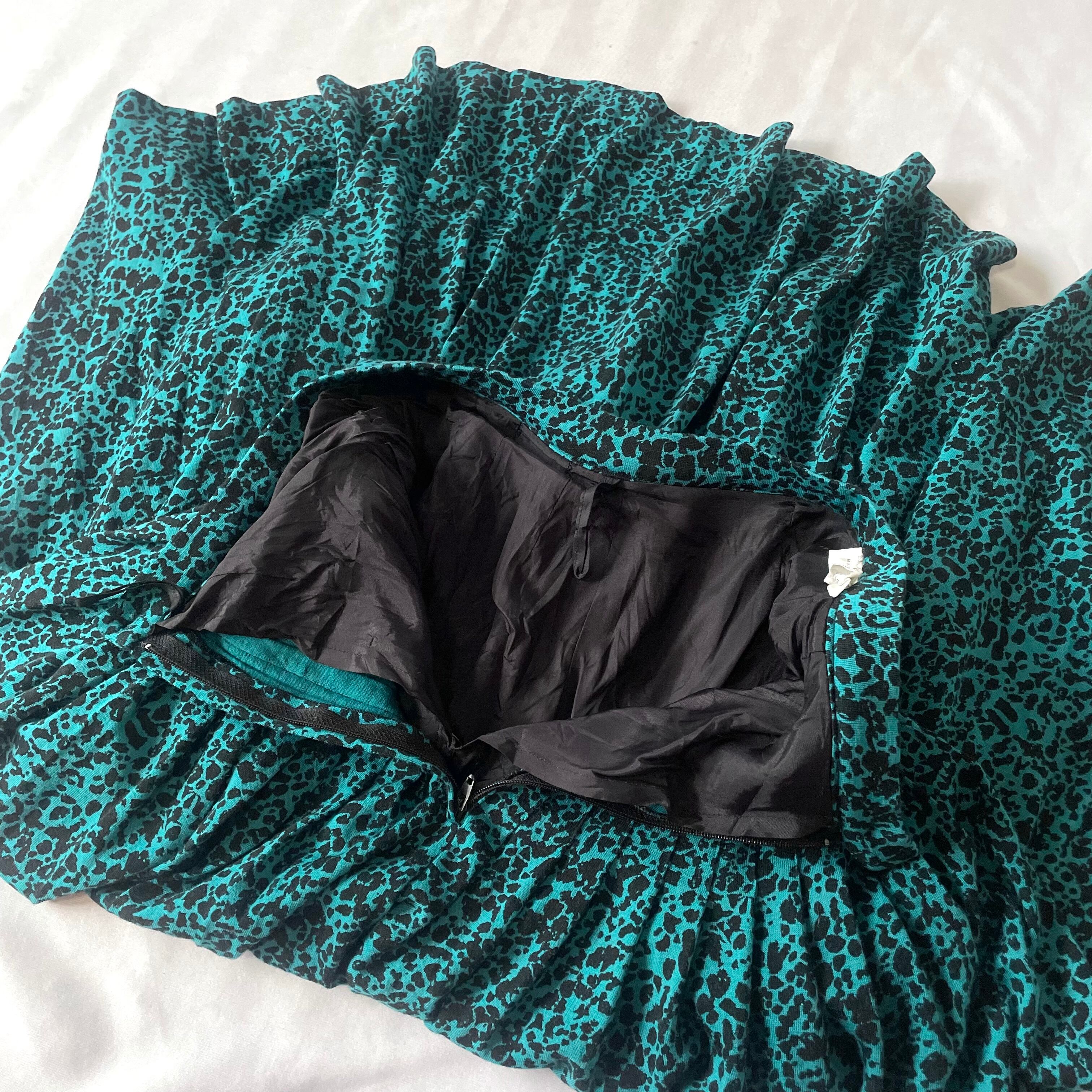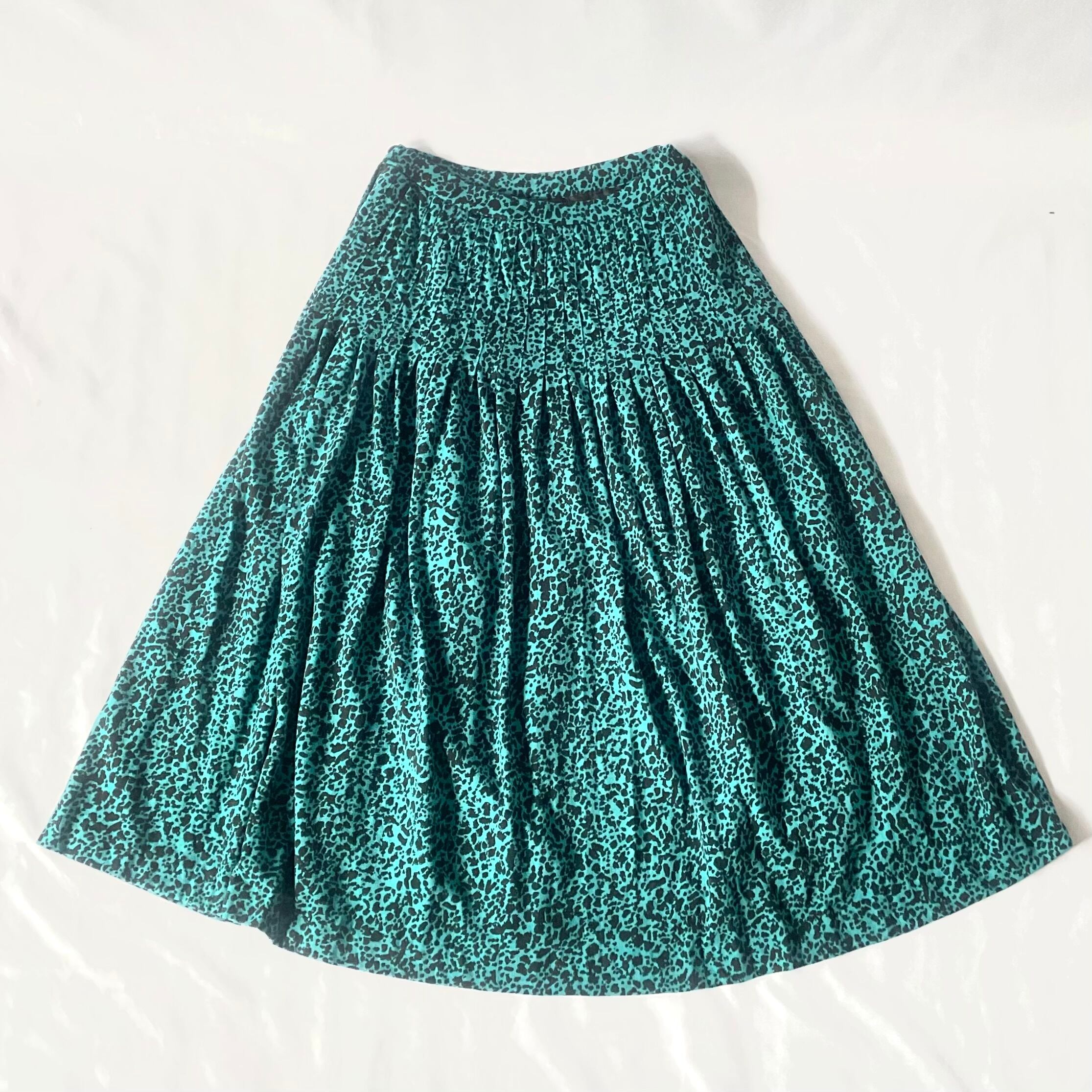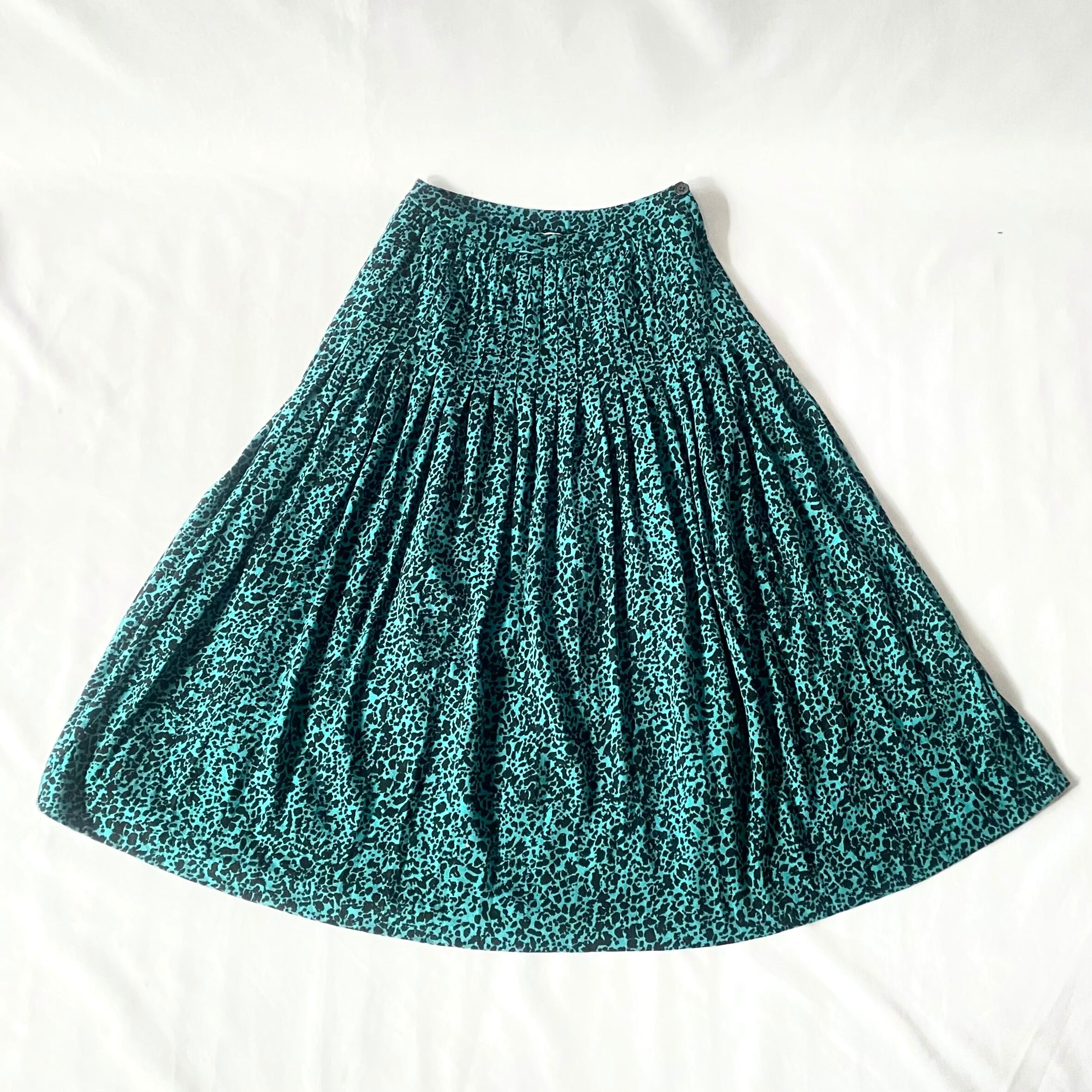 グリーンのレオパード柄でウエストと袖口にリブ入りが可愛いトップスと、プリーツ入りライナー付きのフレアスカートのセットとなります。