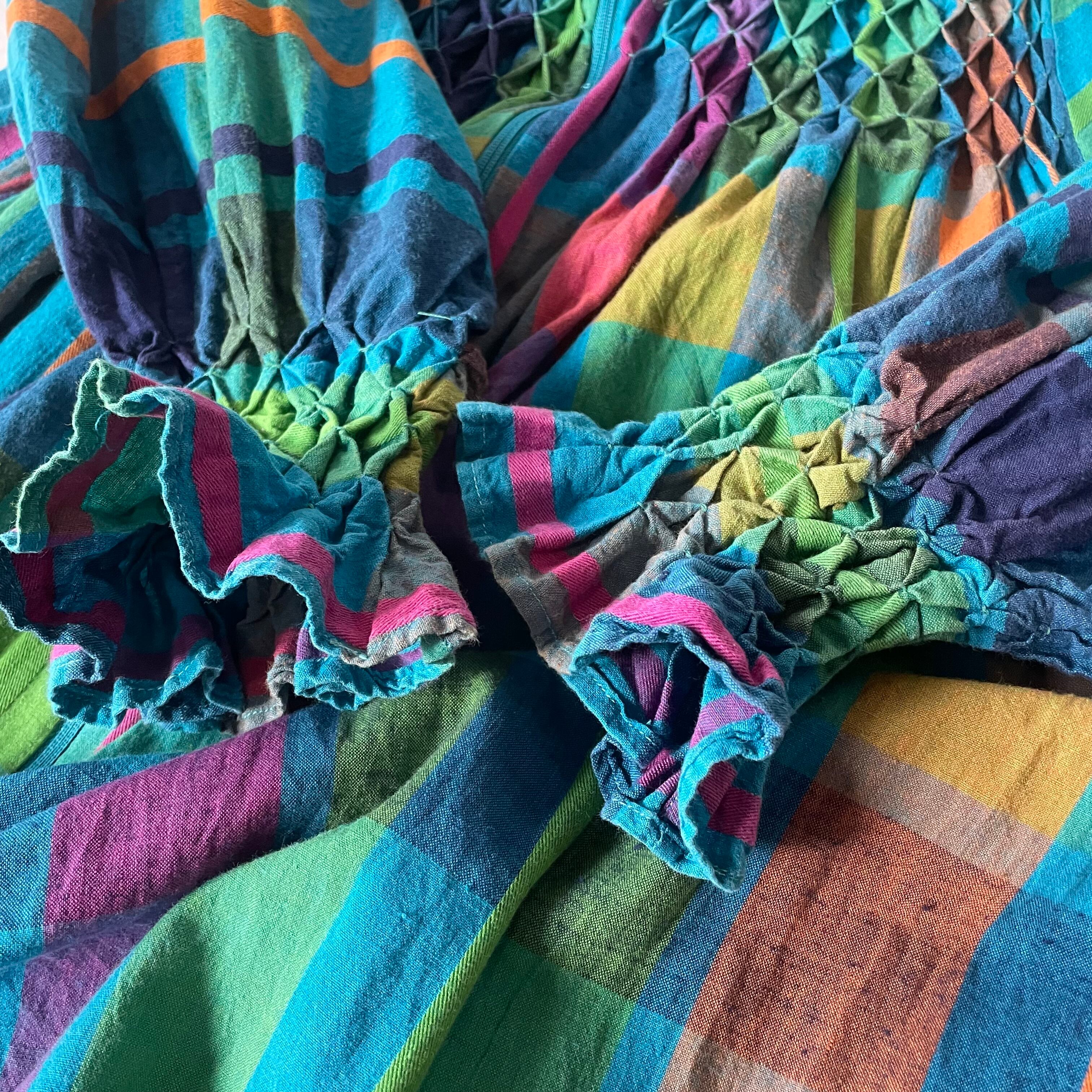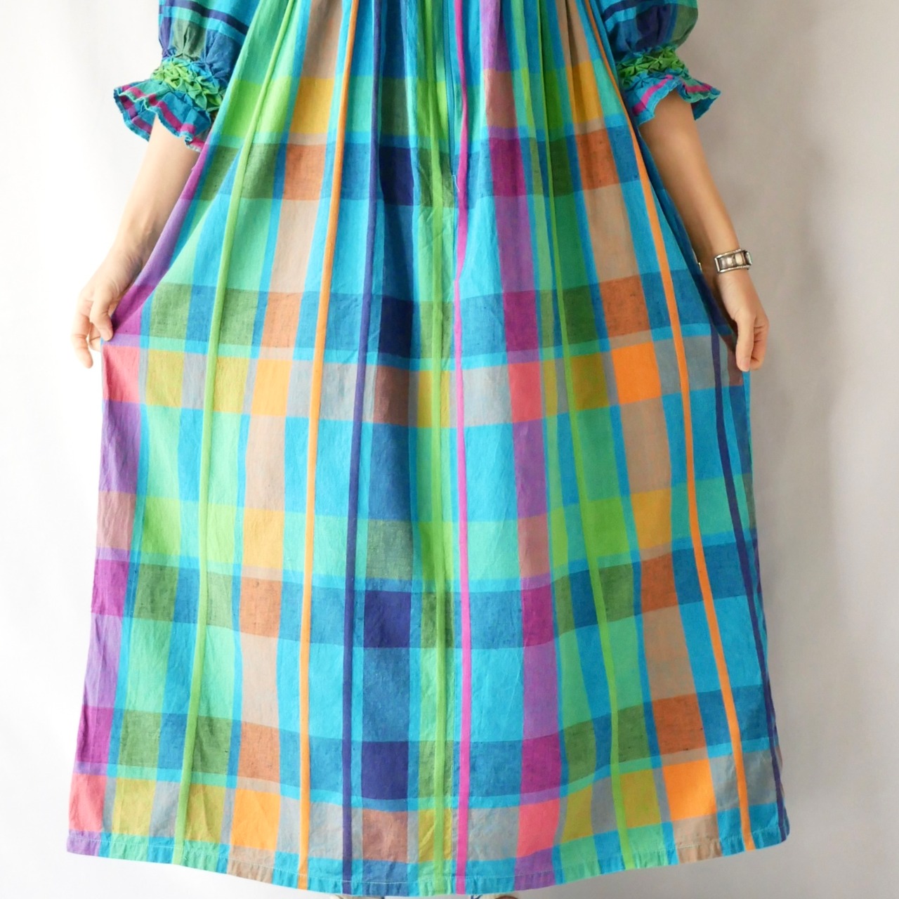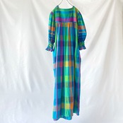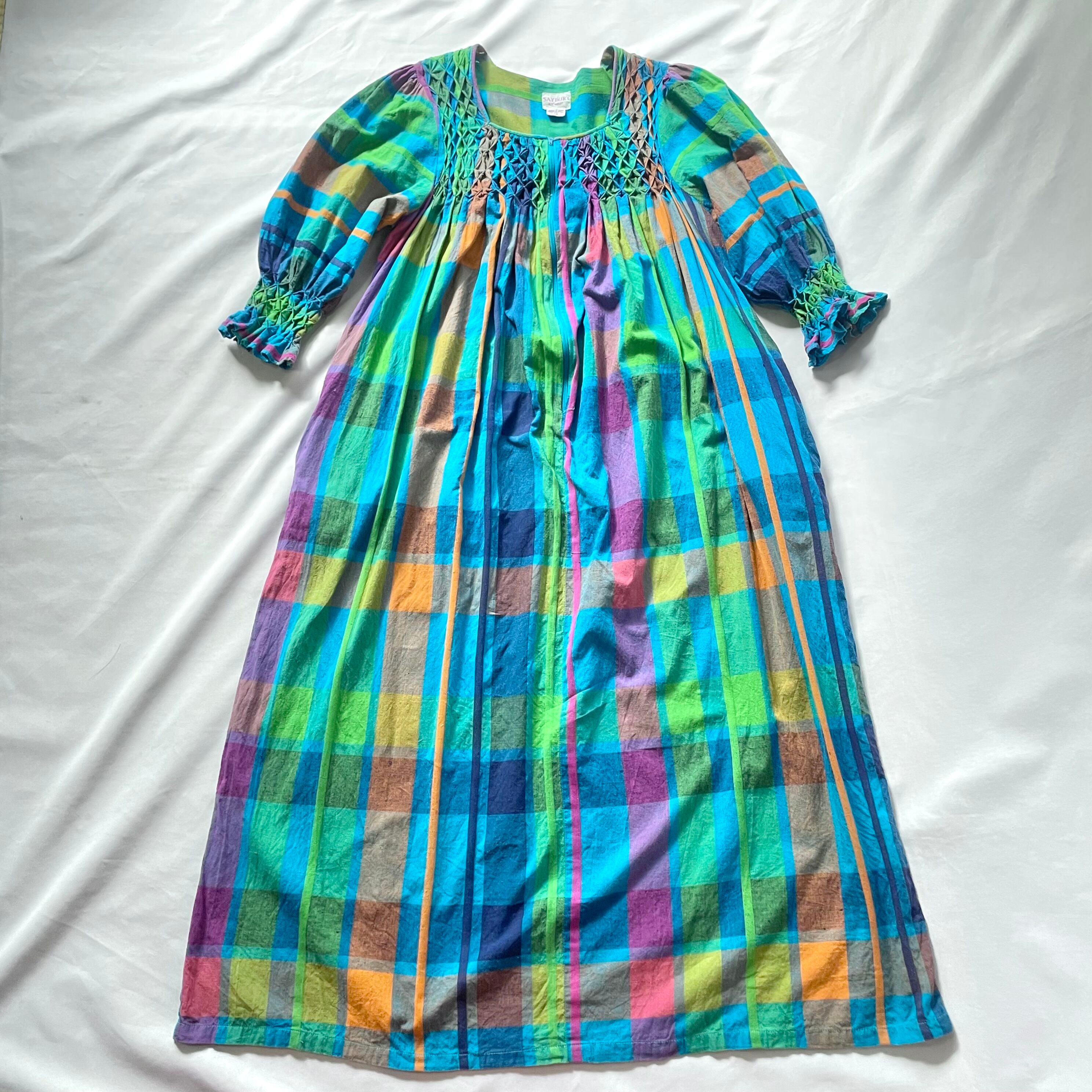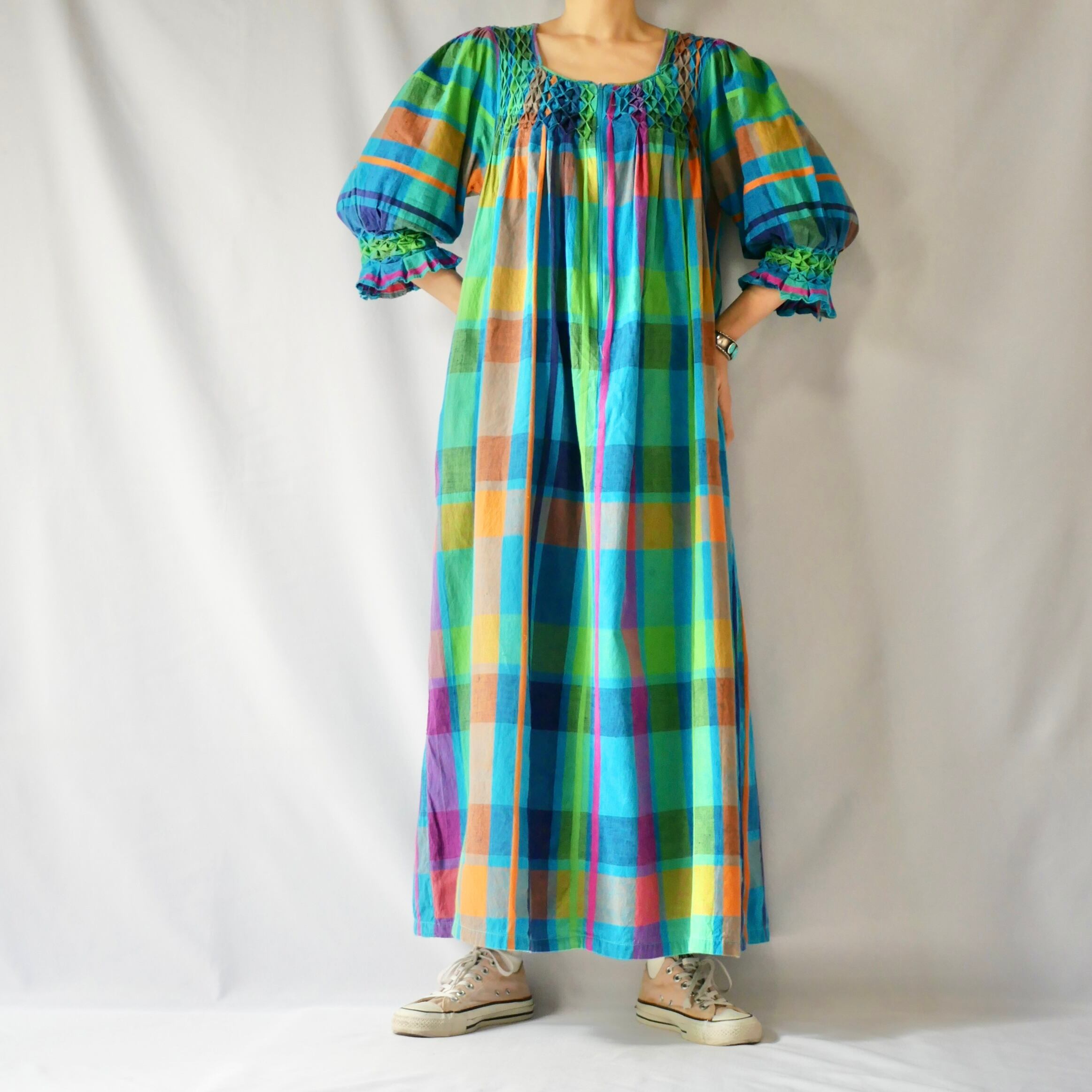菱形のシャーリング加工と鮮やかなマドラスチェックのとても可愛いマキシ丈ヴィンテージインド綿ワンピースです。