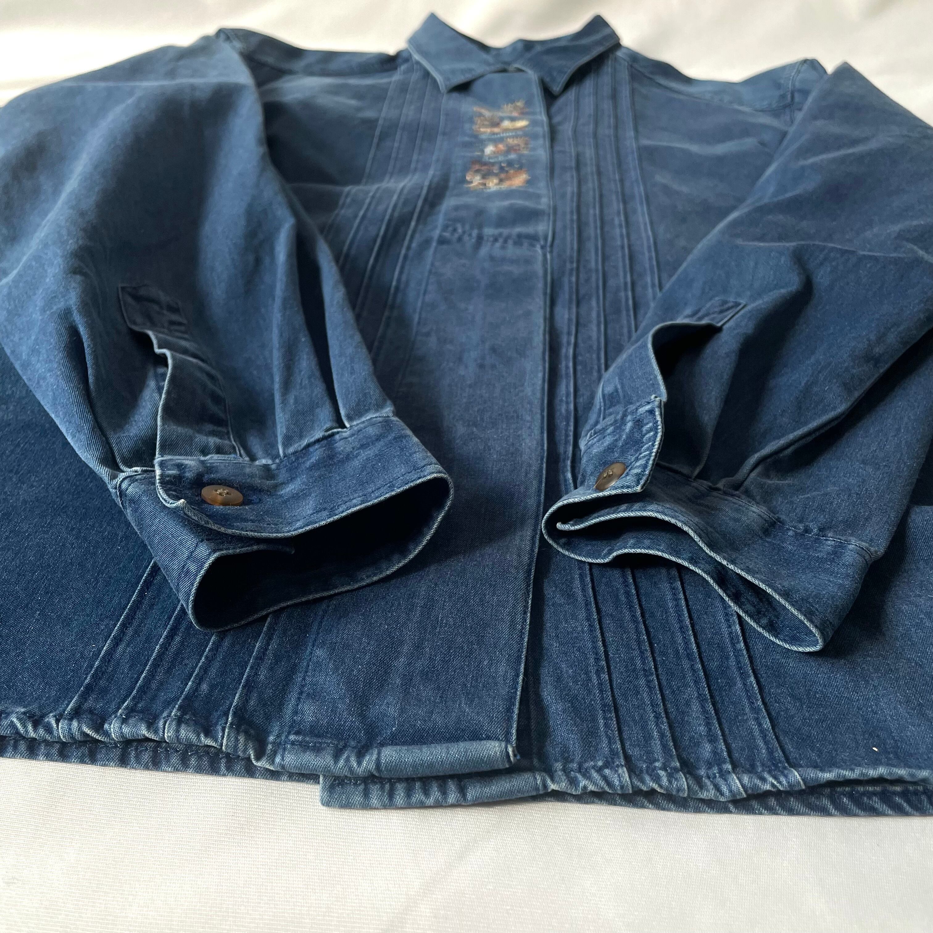 胸元の細やかな刺繍が素敵なヨーロッパヴィンテージ インディゴブルー長袖ブラウスです。しっかりとしつつ柔らかくしなやかなコットン100%生地で、長くお使い頂けそうです。