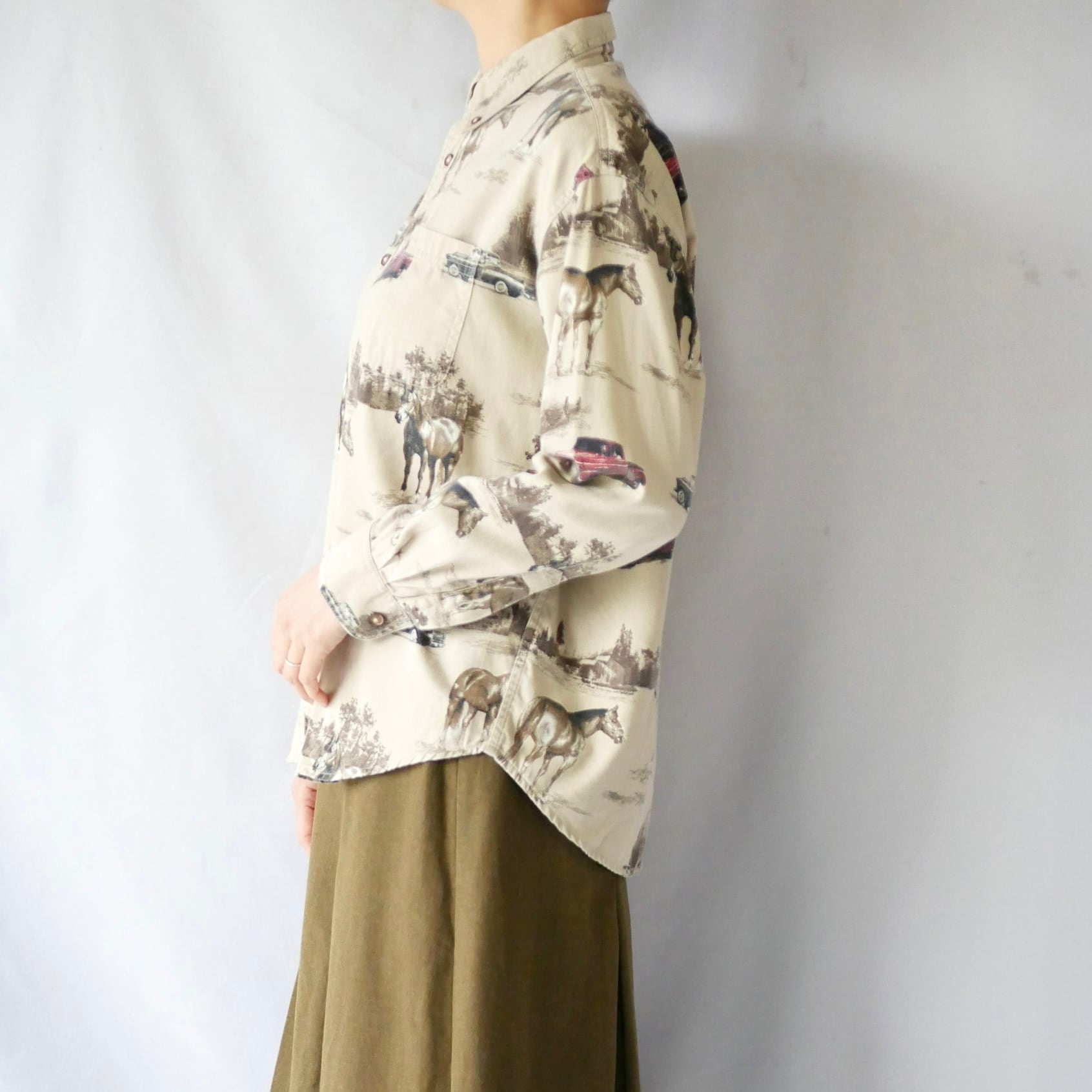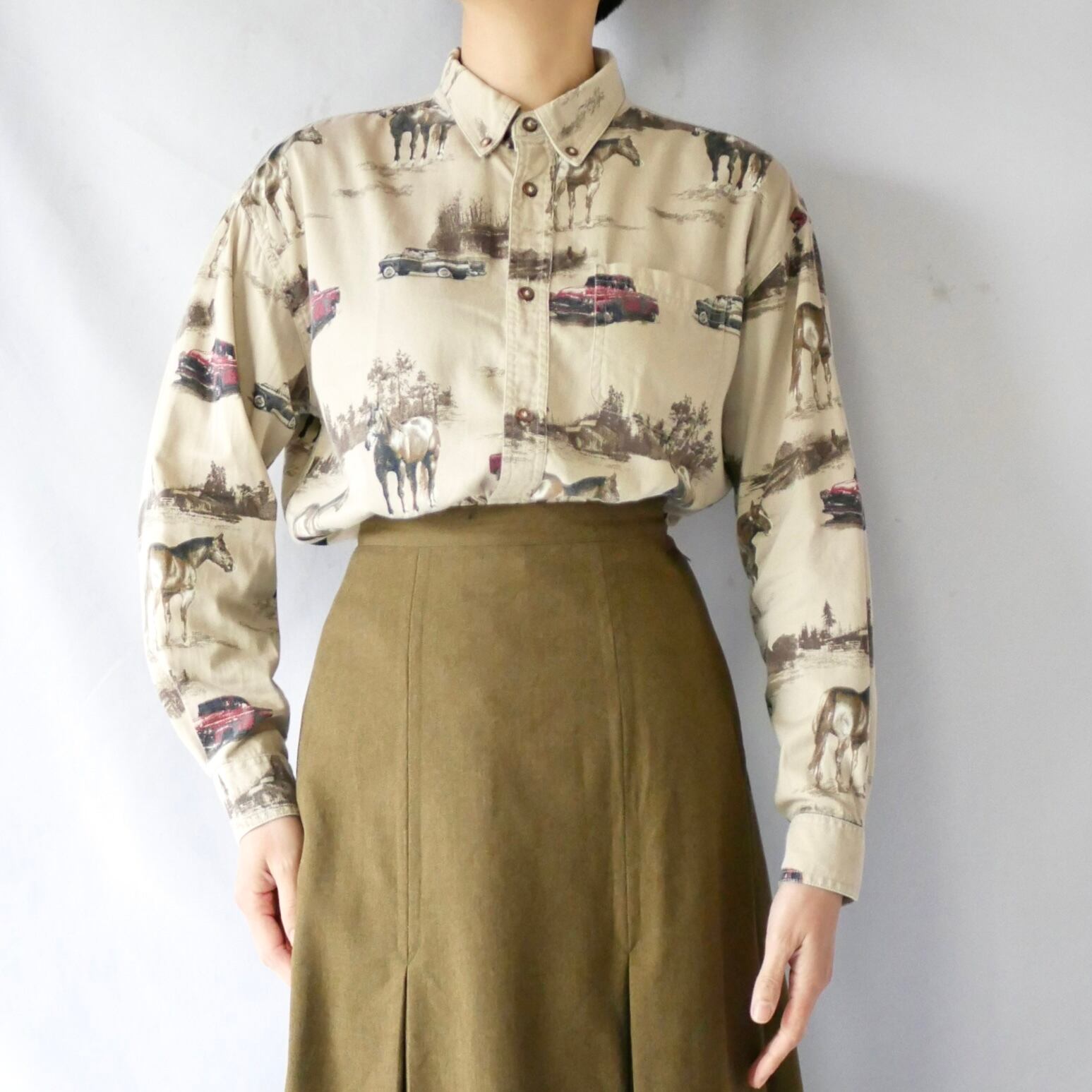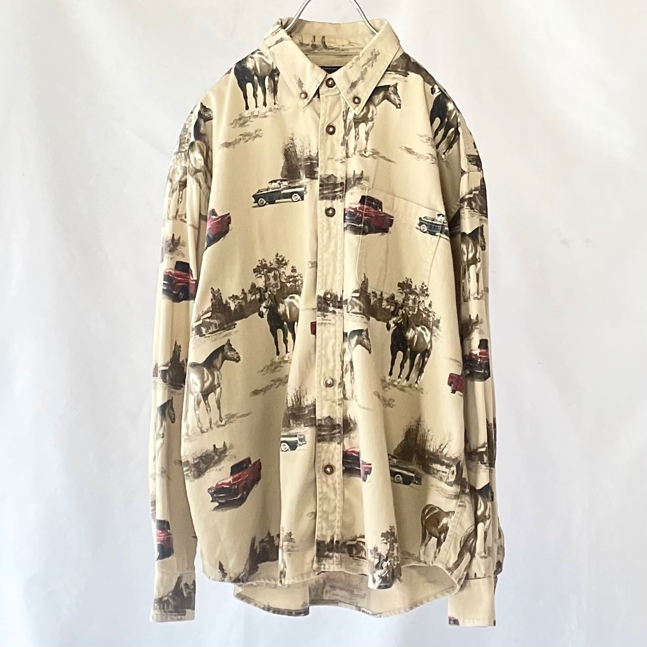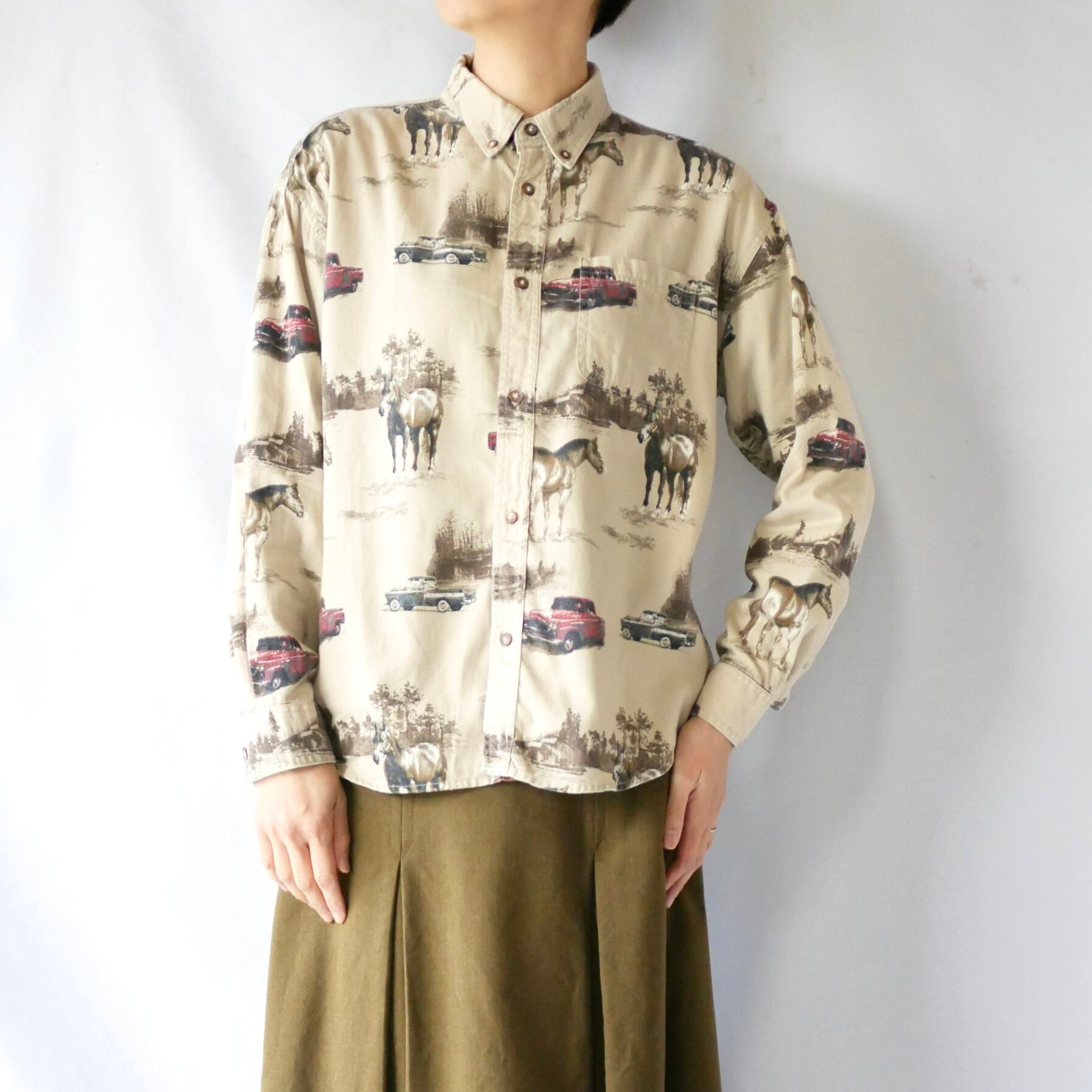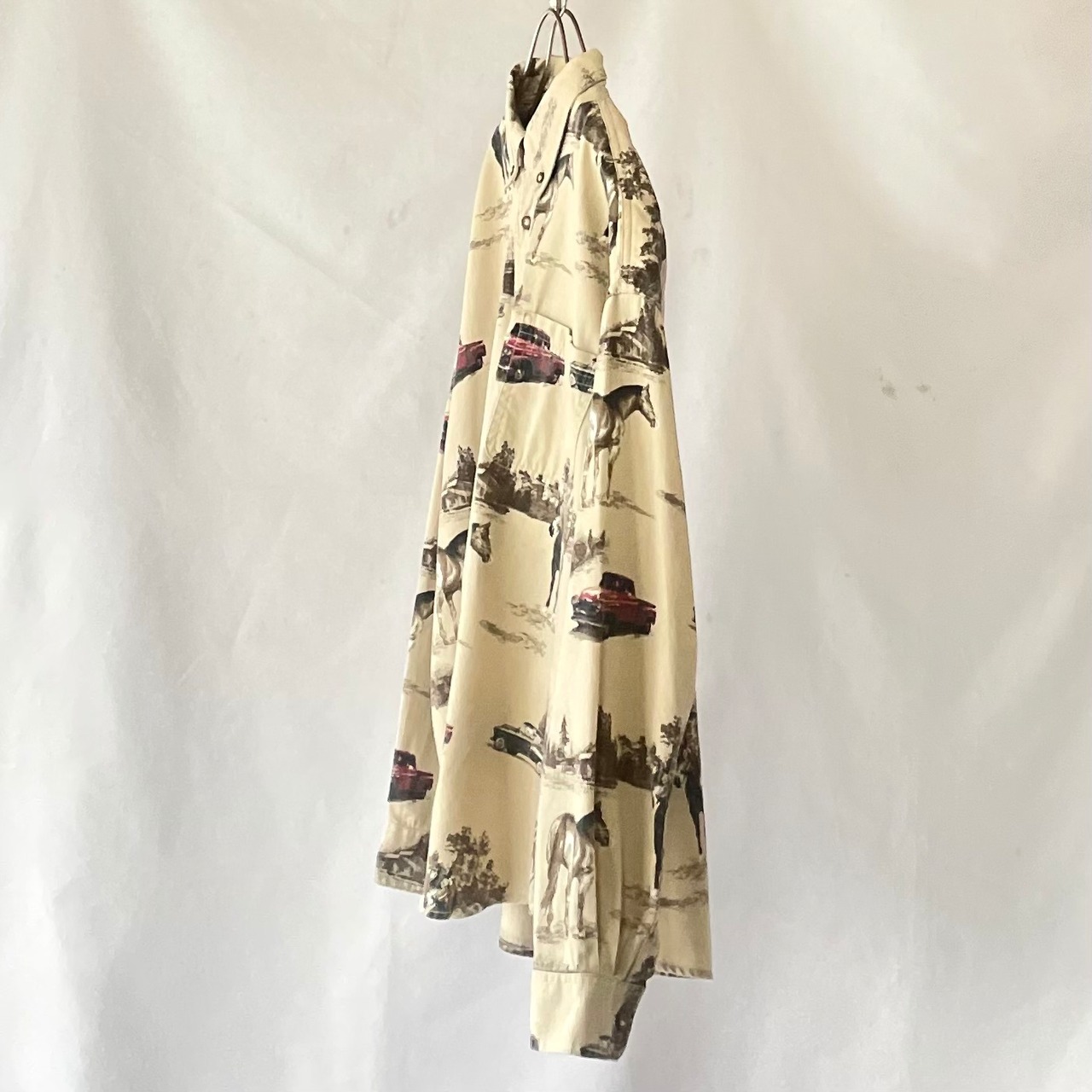 Made in India horse&car B.D shirt 馬と車柄長袖ボタンダウンシャツ