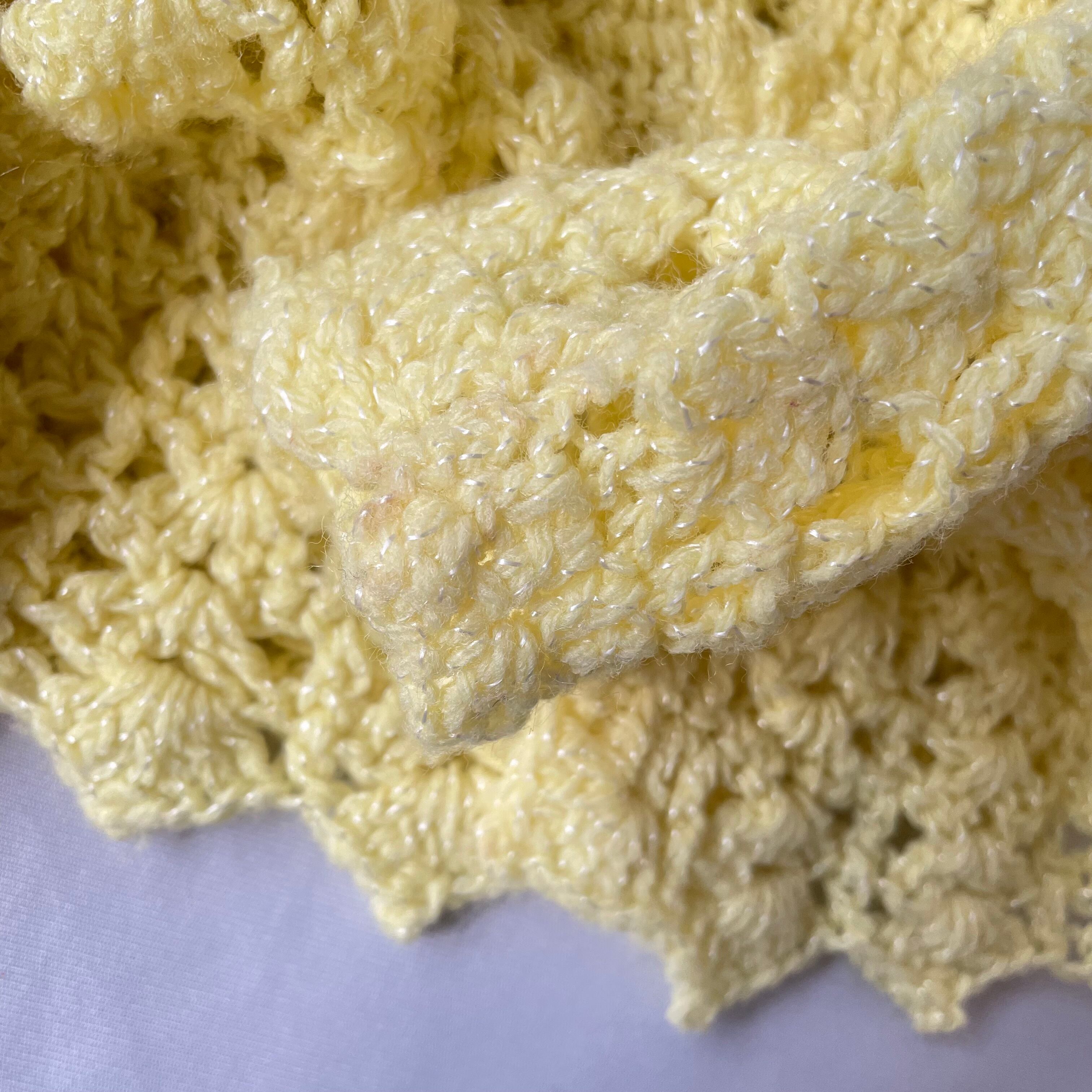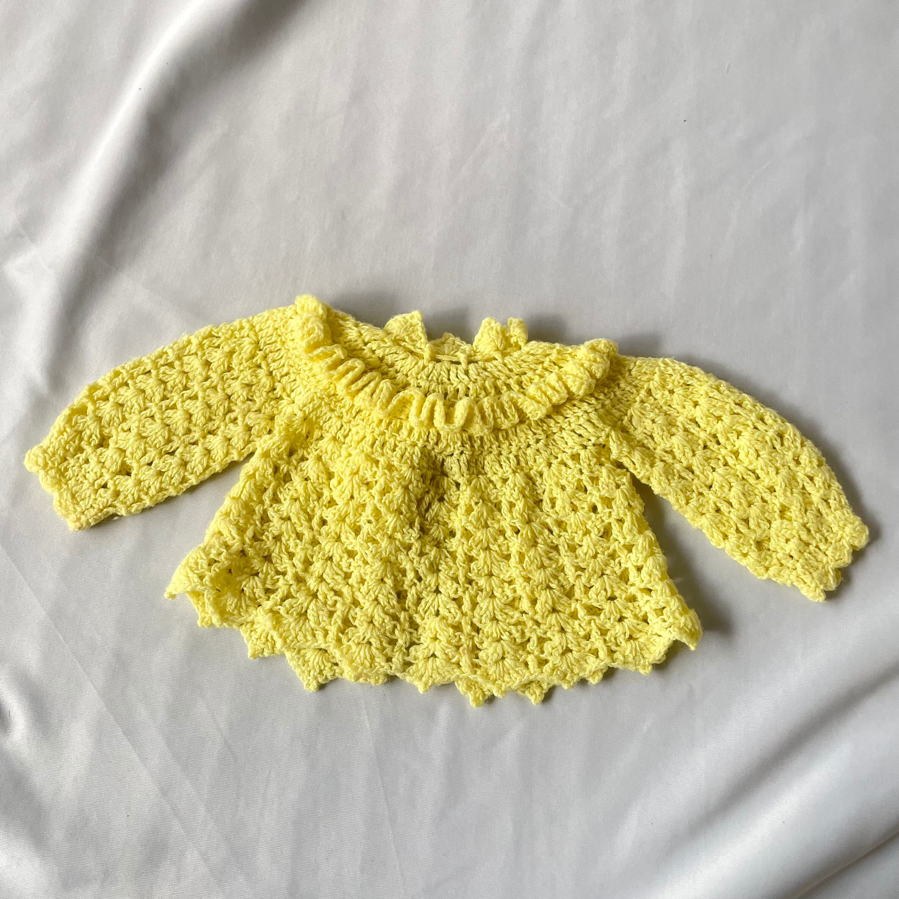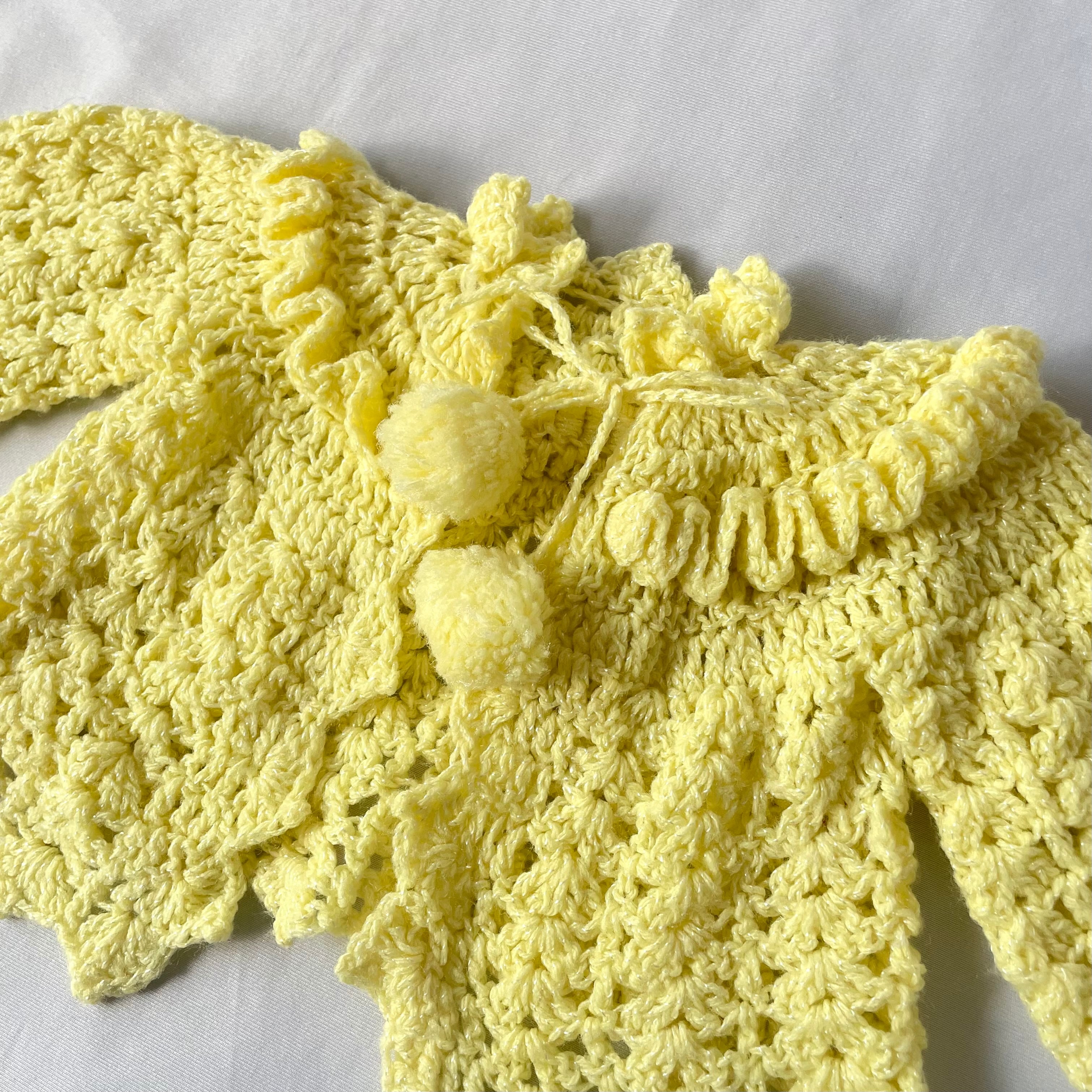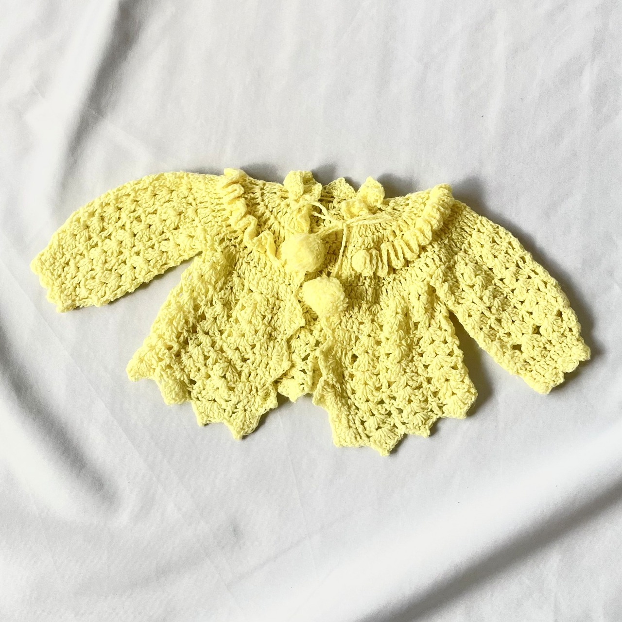 ふんわり可愛いイエローカラーの鍵編み約3ヶ月〜6ヶ月児用 ニットカーディガンです。