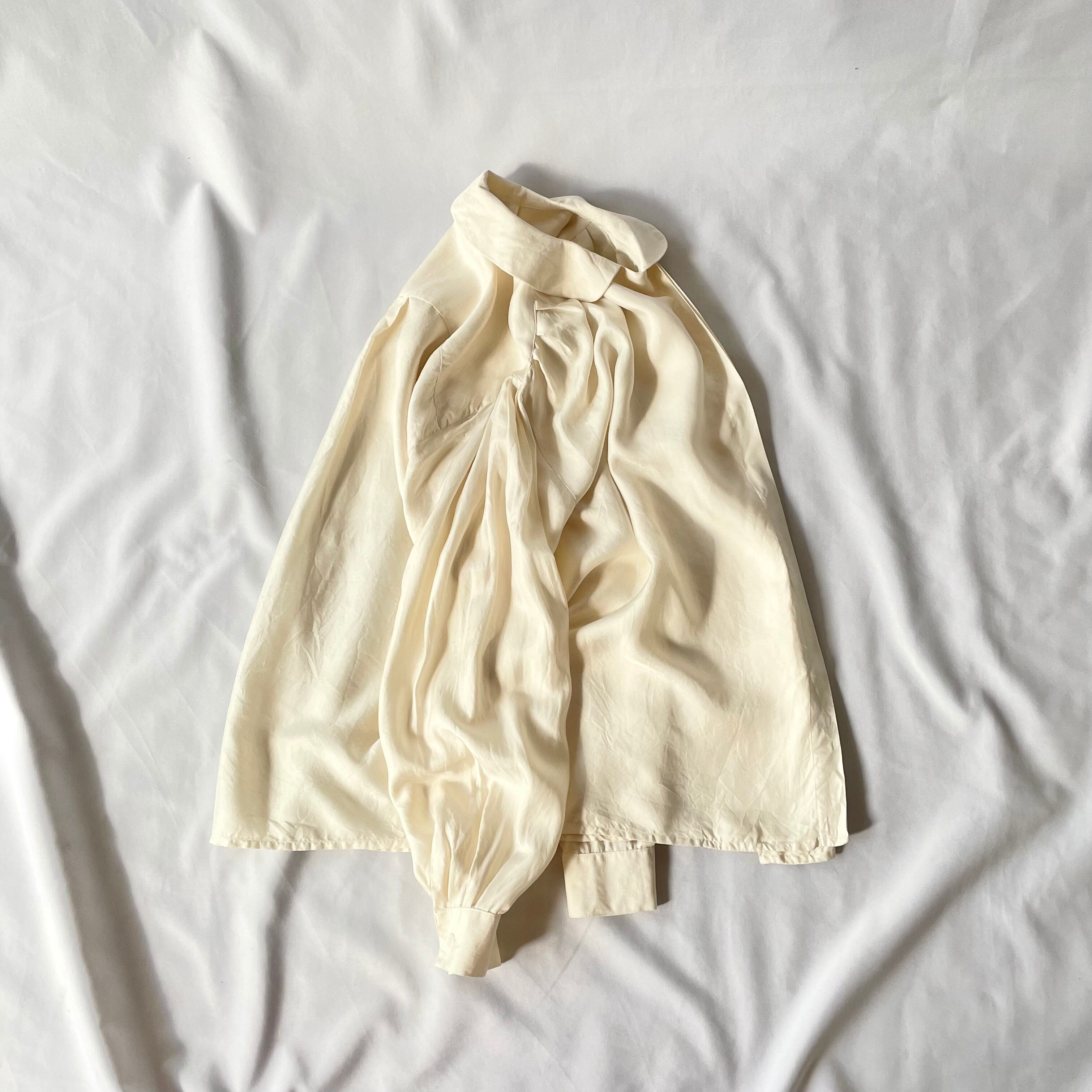 なめらかなアイボリーシルク100%生地に丸襟、ボタンが見えない様に多めに重なった造りも上品な長袖ブラウスです。