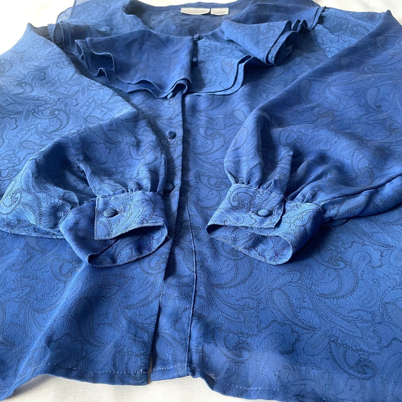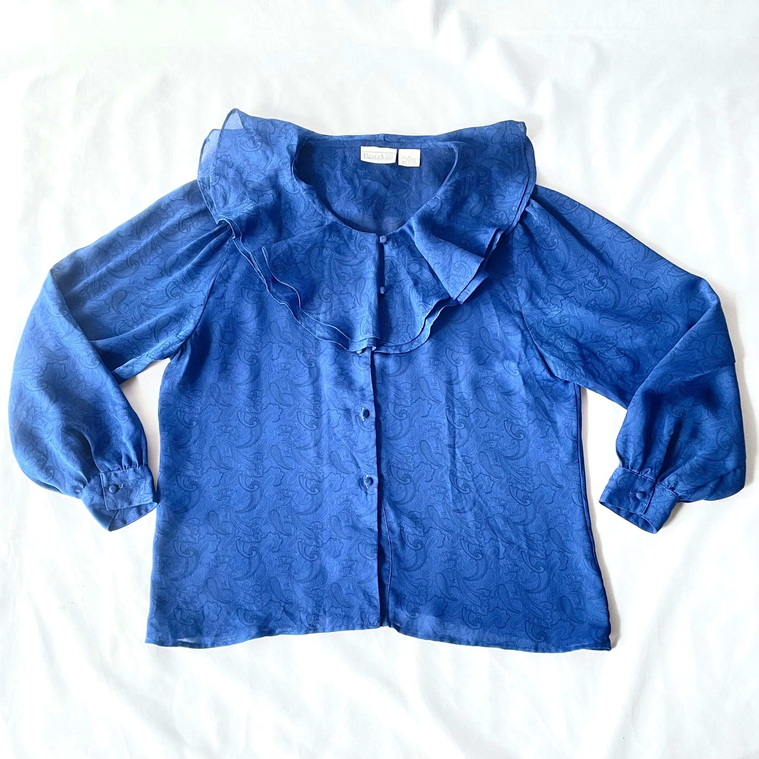 ブルーペイズリー柄ラッフル襟ブラウスです。ゆったりめのサイズ感で、上品にゆるりと着られます。