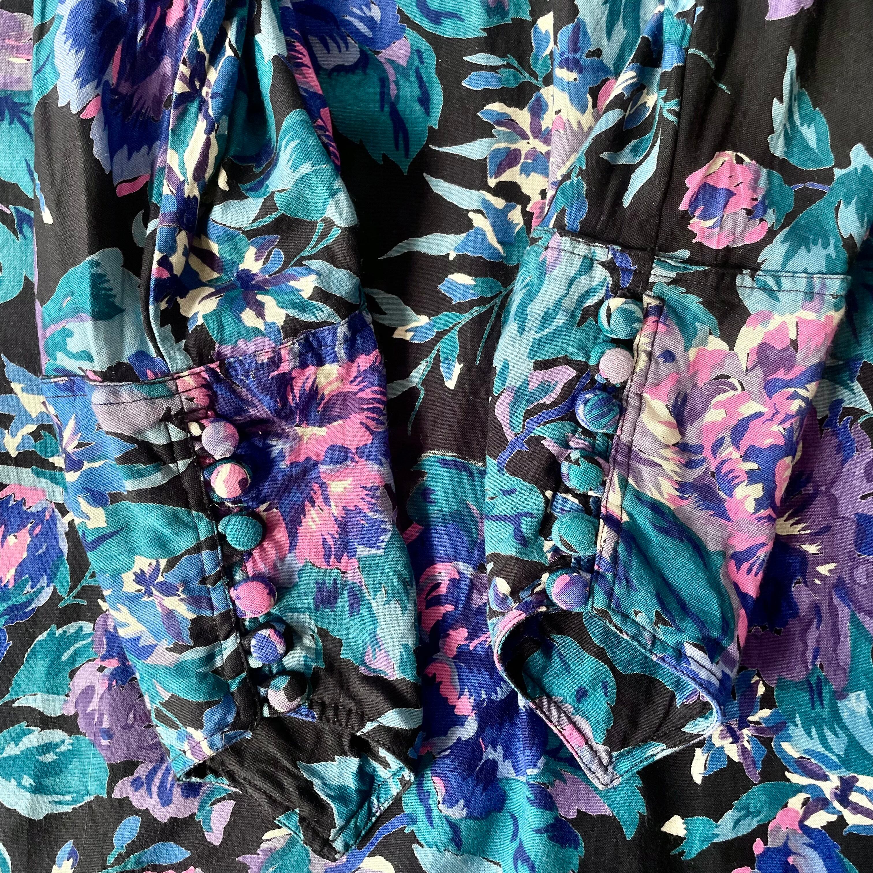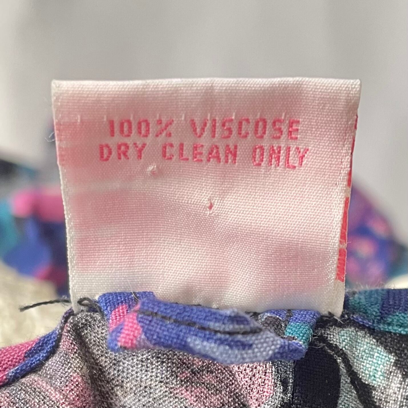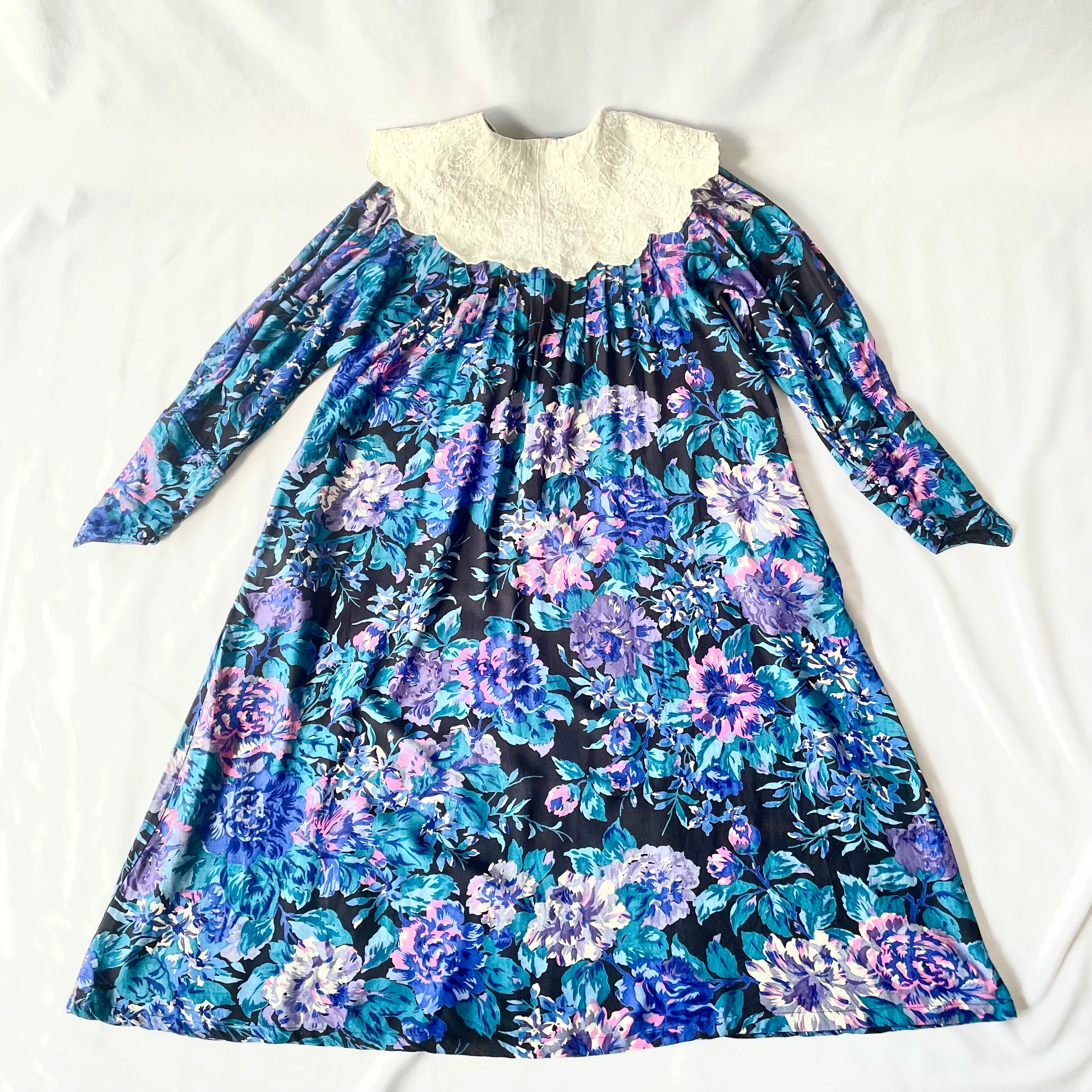 大きなレース襟がとっても可愛い、鮮やかに映える花柄がプリントされた滑らかなビスコース生地のヴィンテージワンピースです。