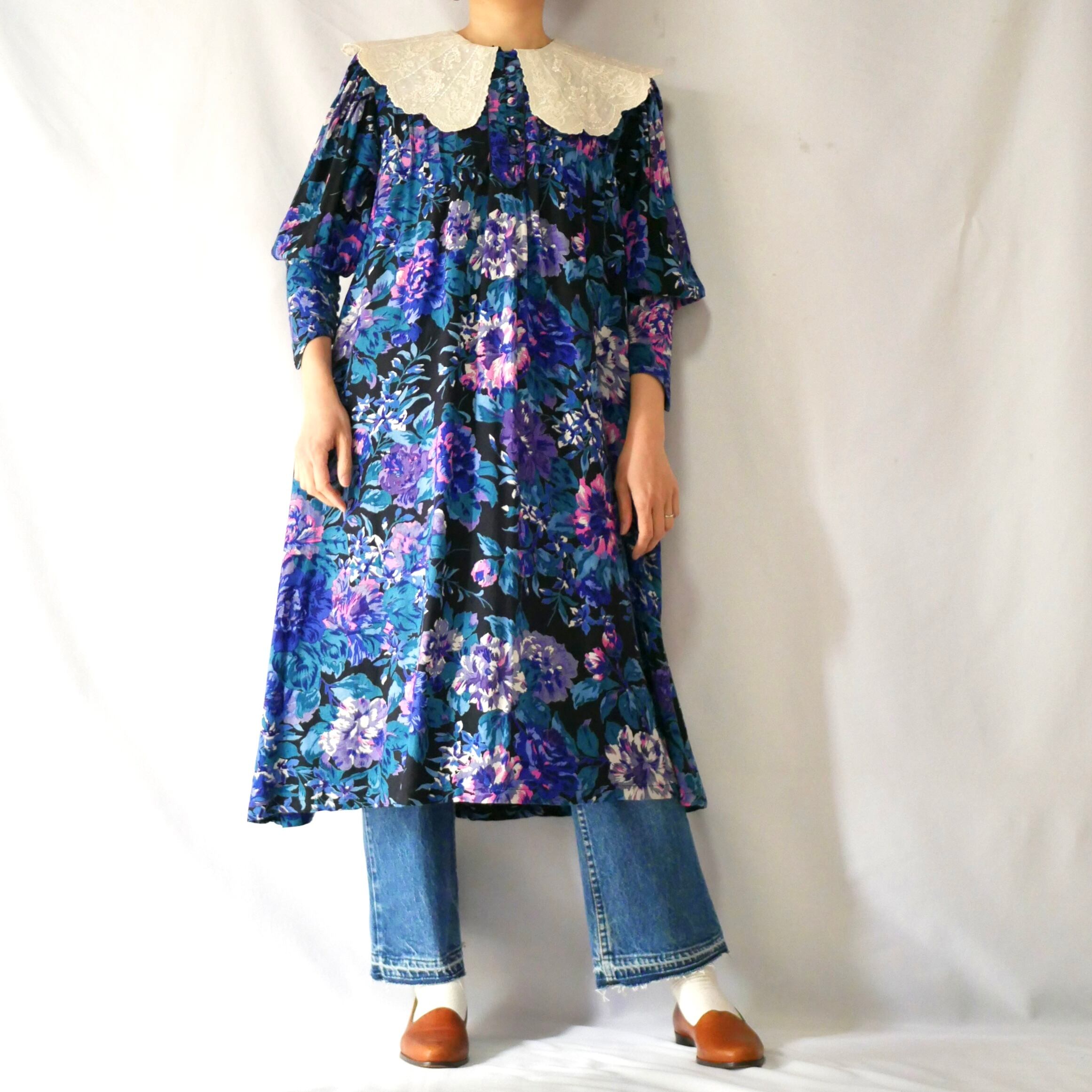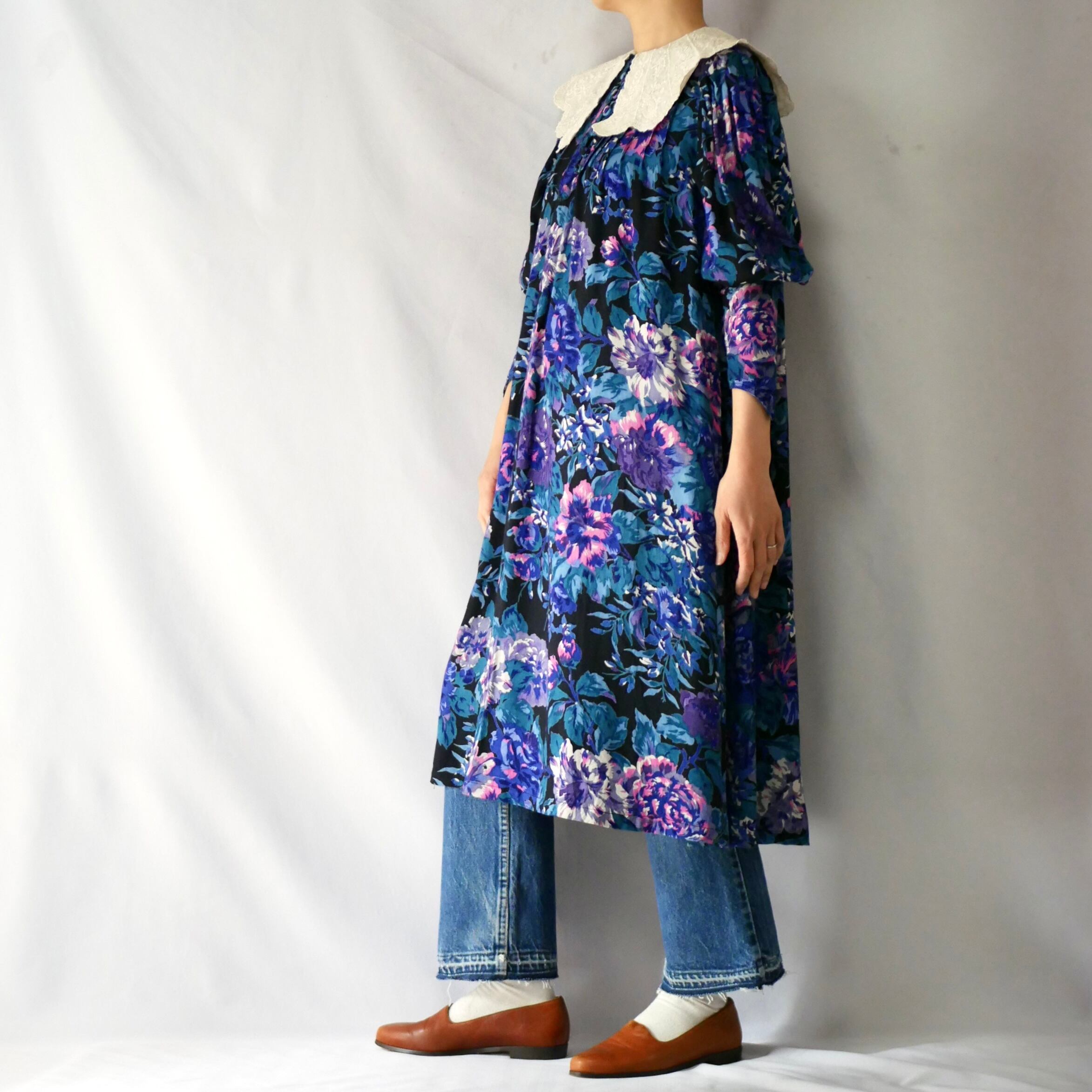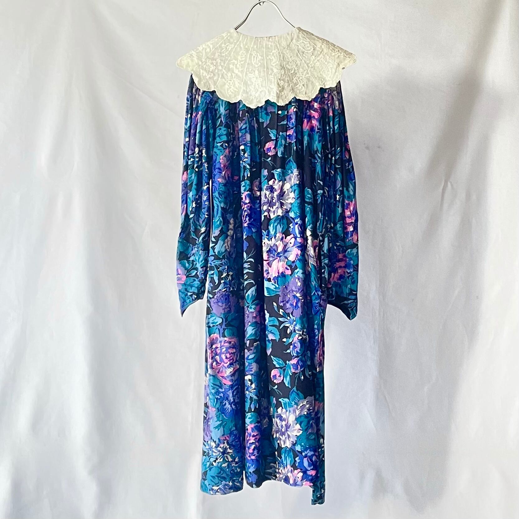 White lace 100%viscose floral onepiece 白レース襟 花柄ワンピース