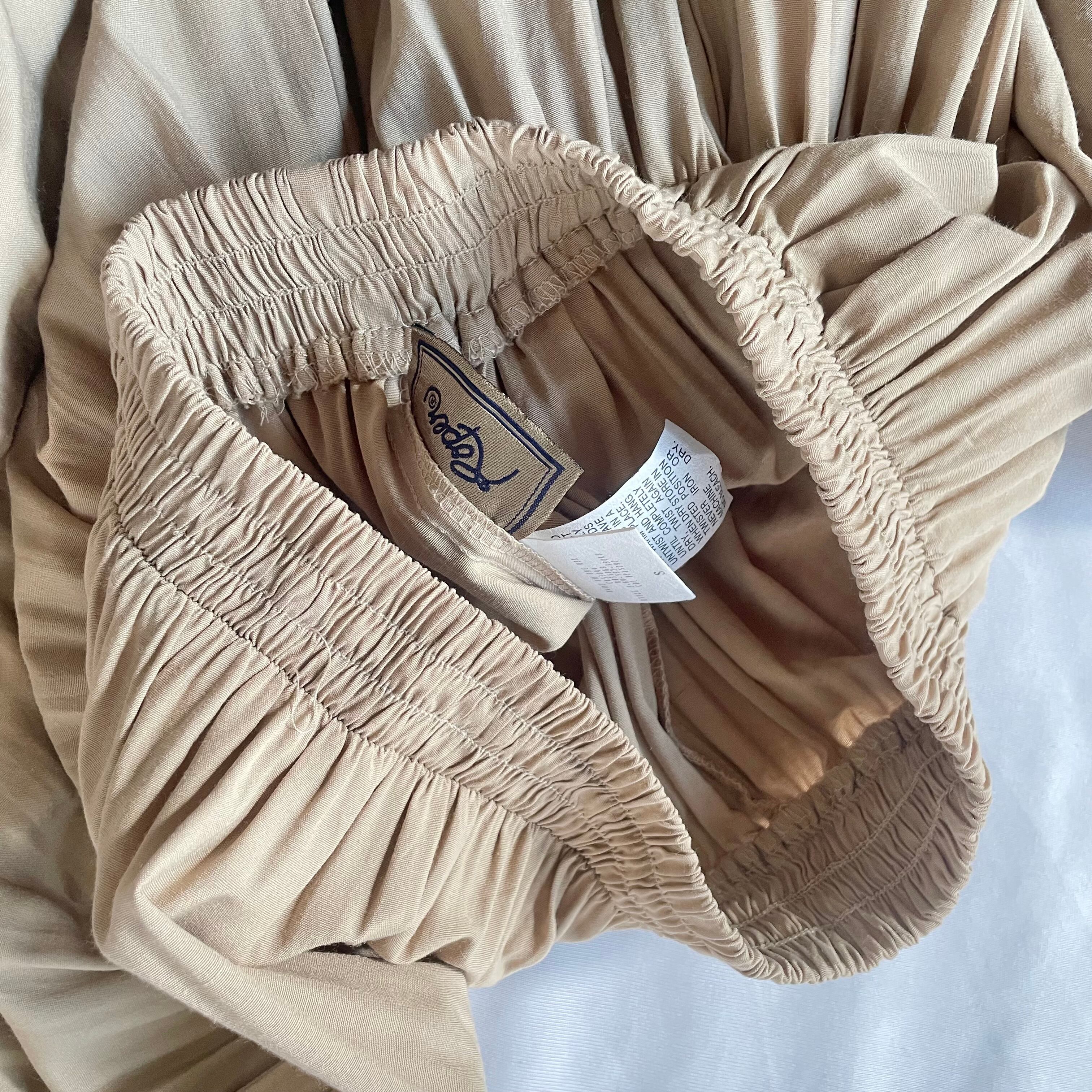 アメリカ製 マキシ丈 ベージュ無地 ティアードスカートです。レーヨン70%ポリエステル30%の少しとろみのある上品な生地がたっぷり使われており、状態も良好。飽きの来ないシンプルなデザインで長くお使い頂けそうです。