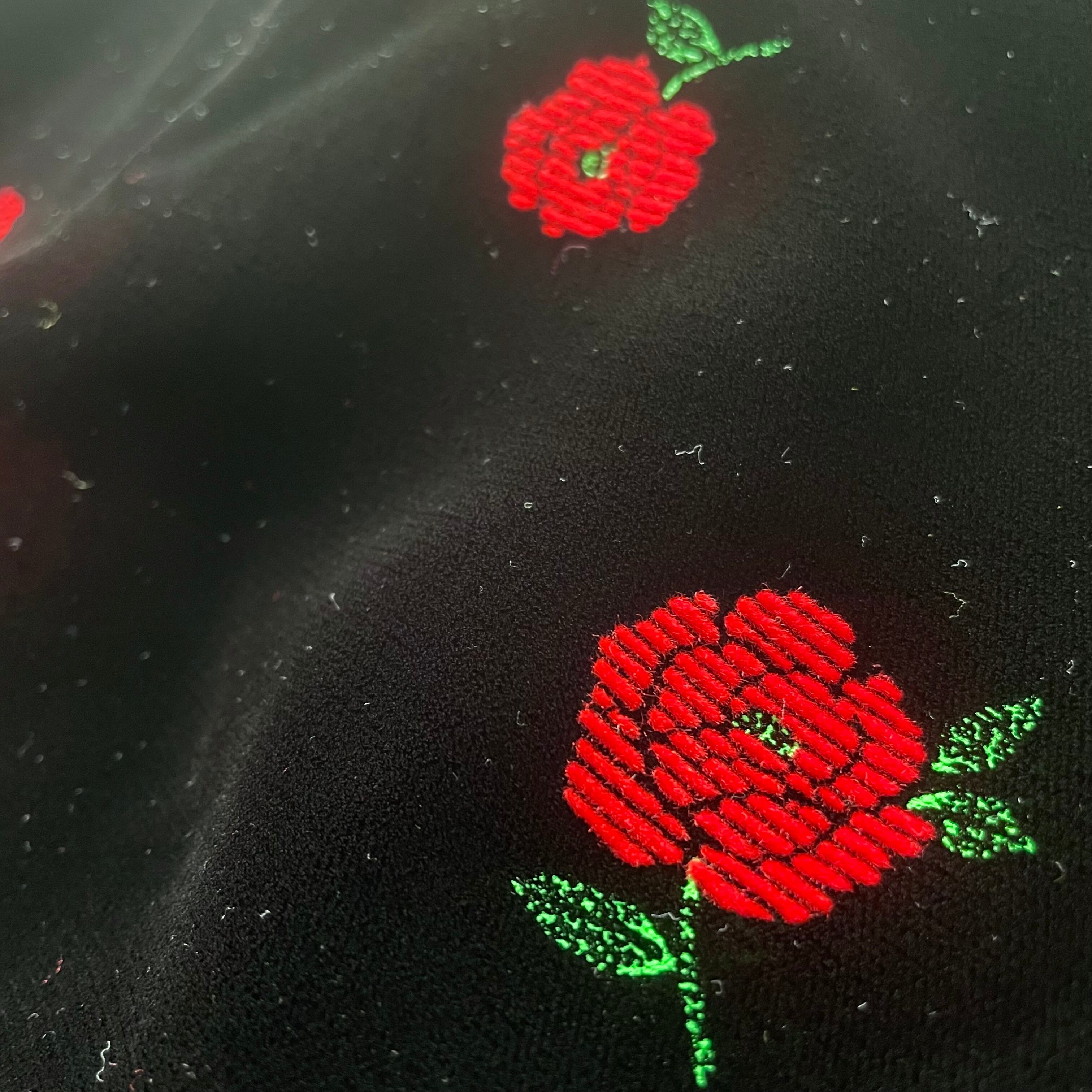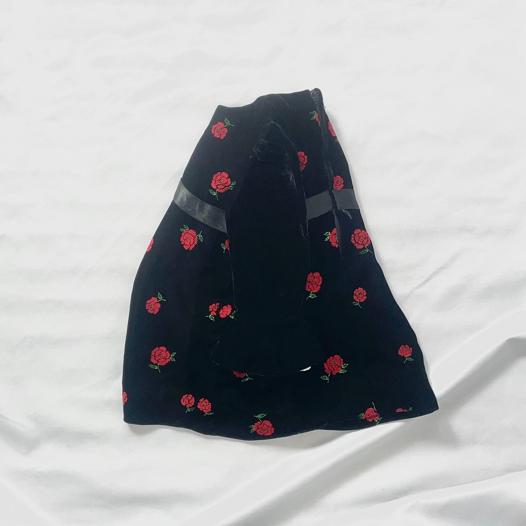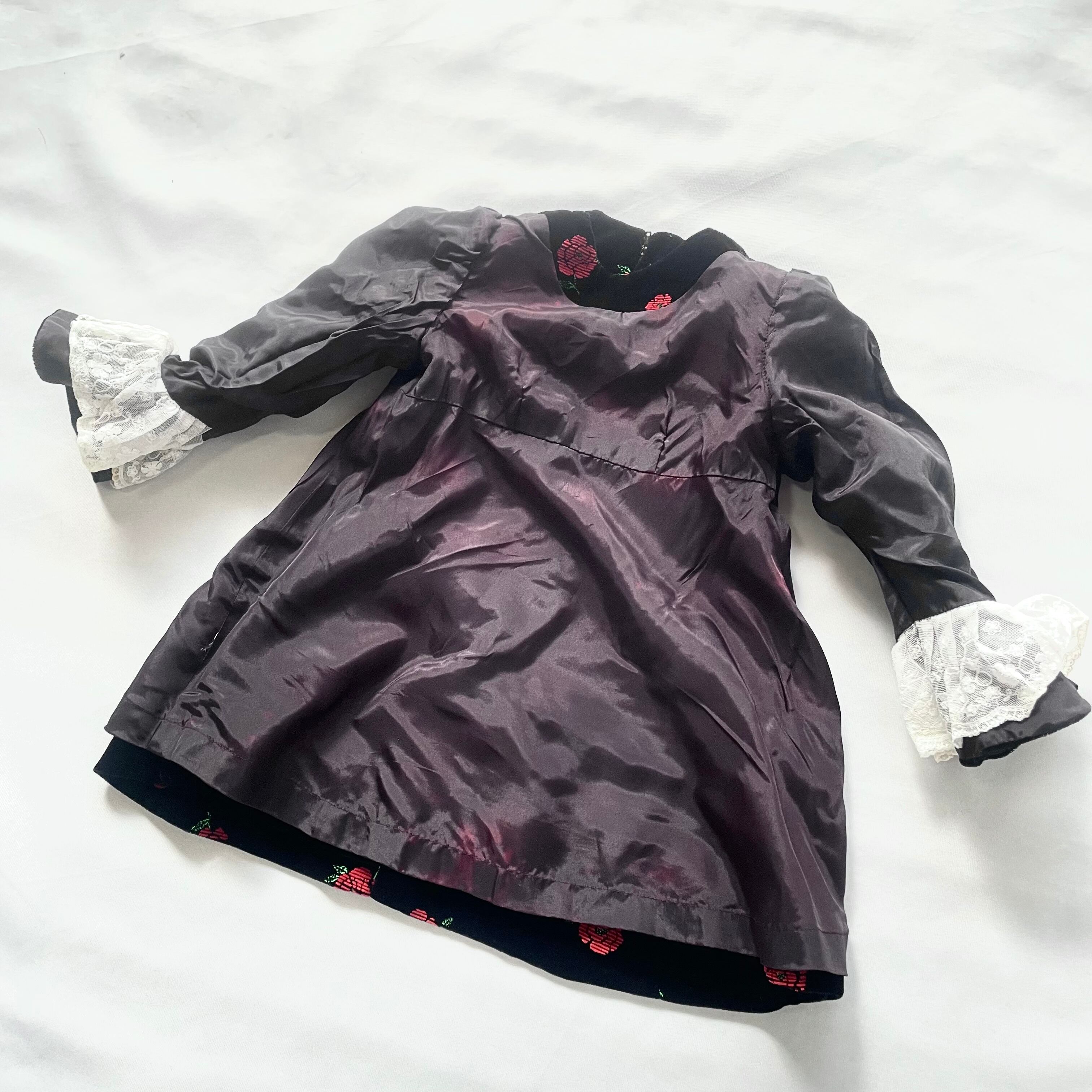 2歳歳児用黒ベロア地花柄ワンピース です。袖口裏にあしらわれた白レースや胸元下のサテンリボンなど大人さながらのデザインが可愛いです。