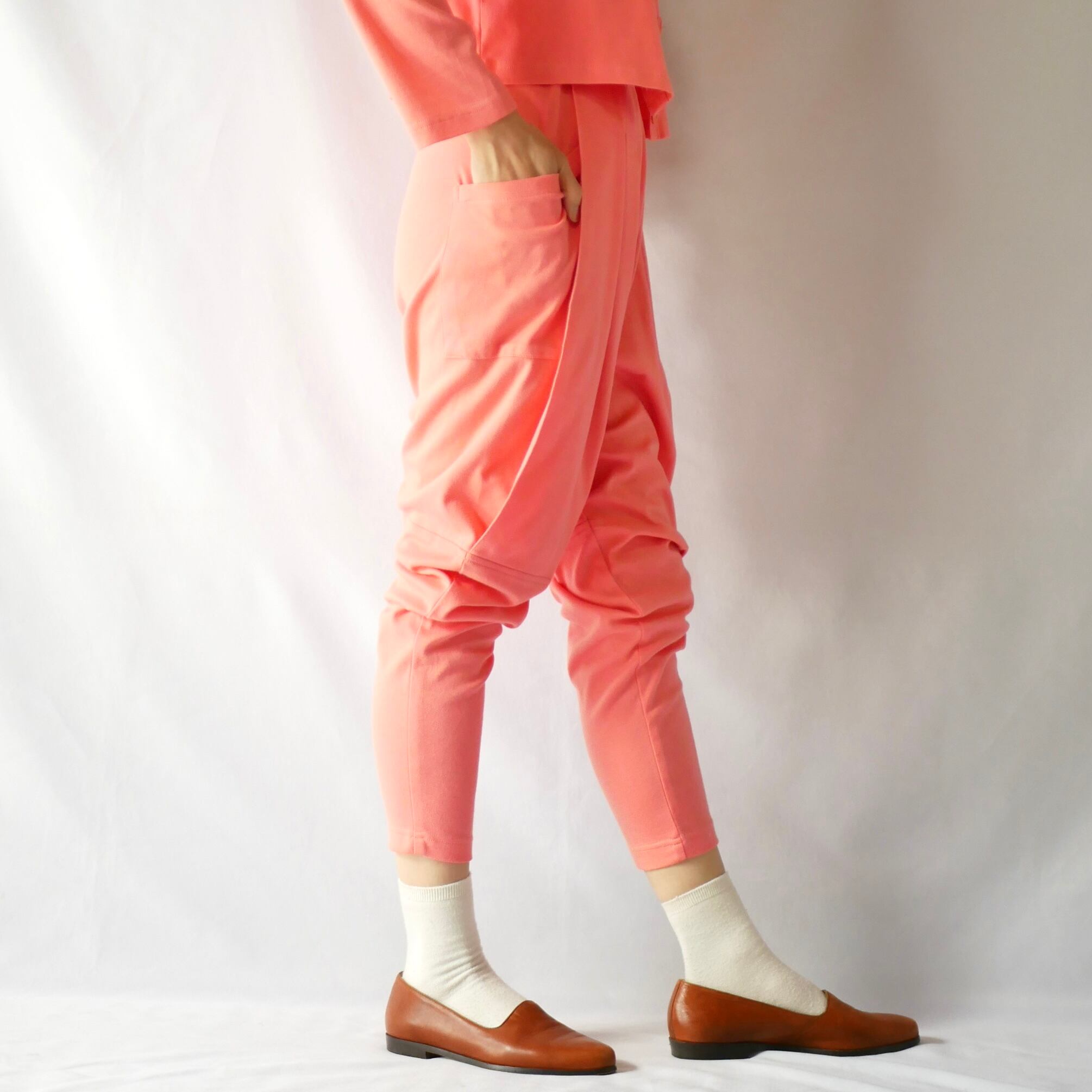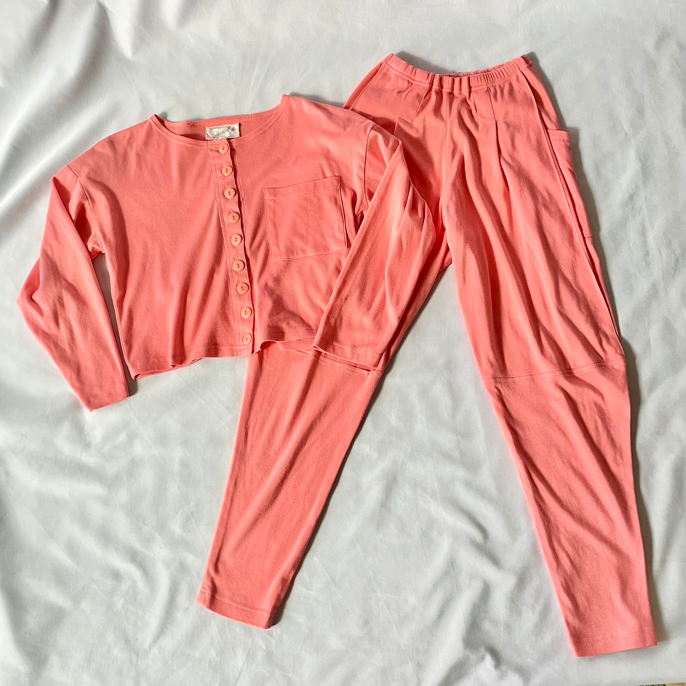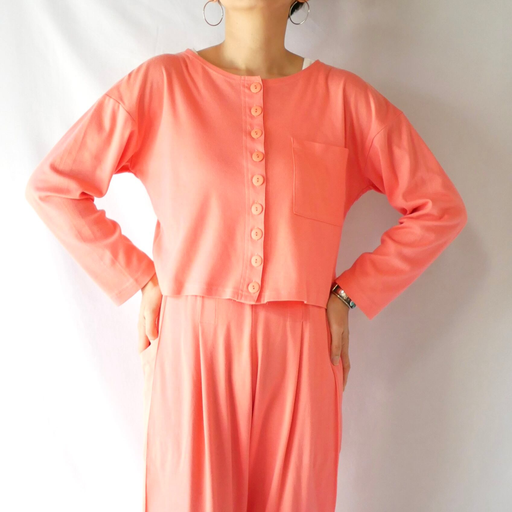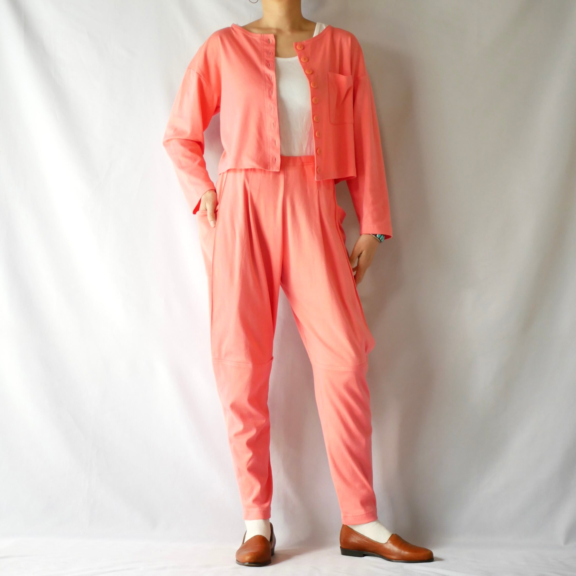 リラックスした雰囲気と明るさが可愛らしいサーモンピンクのカットソー地セットアップです。