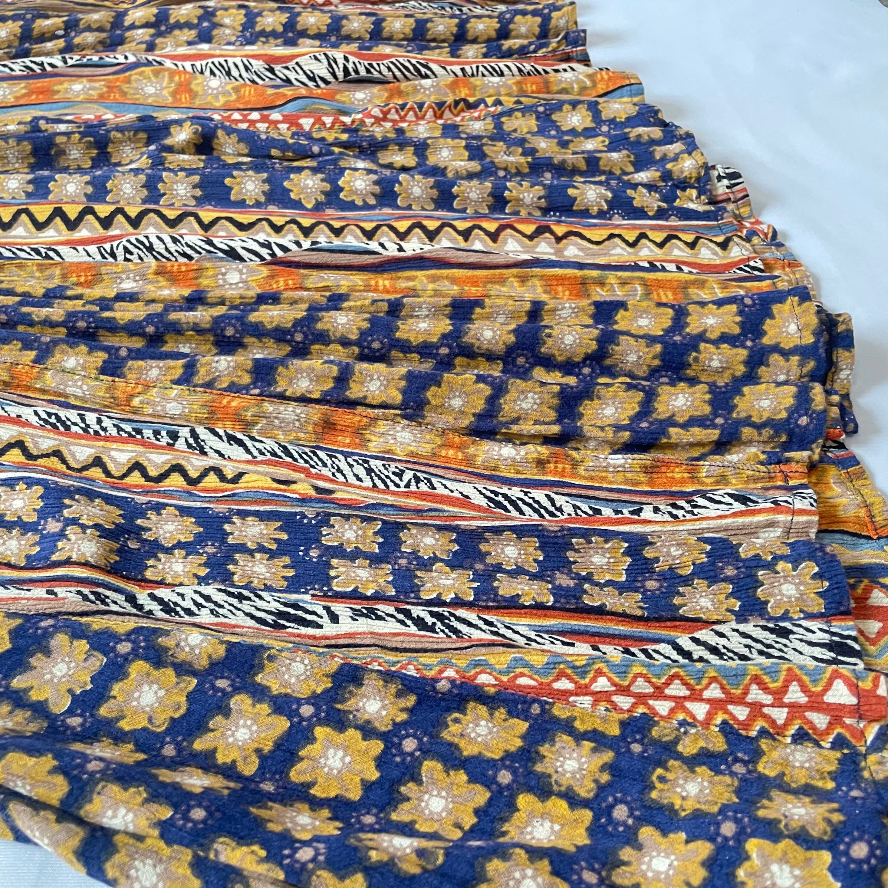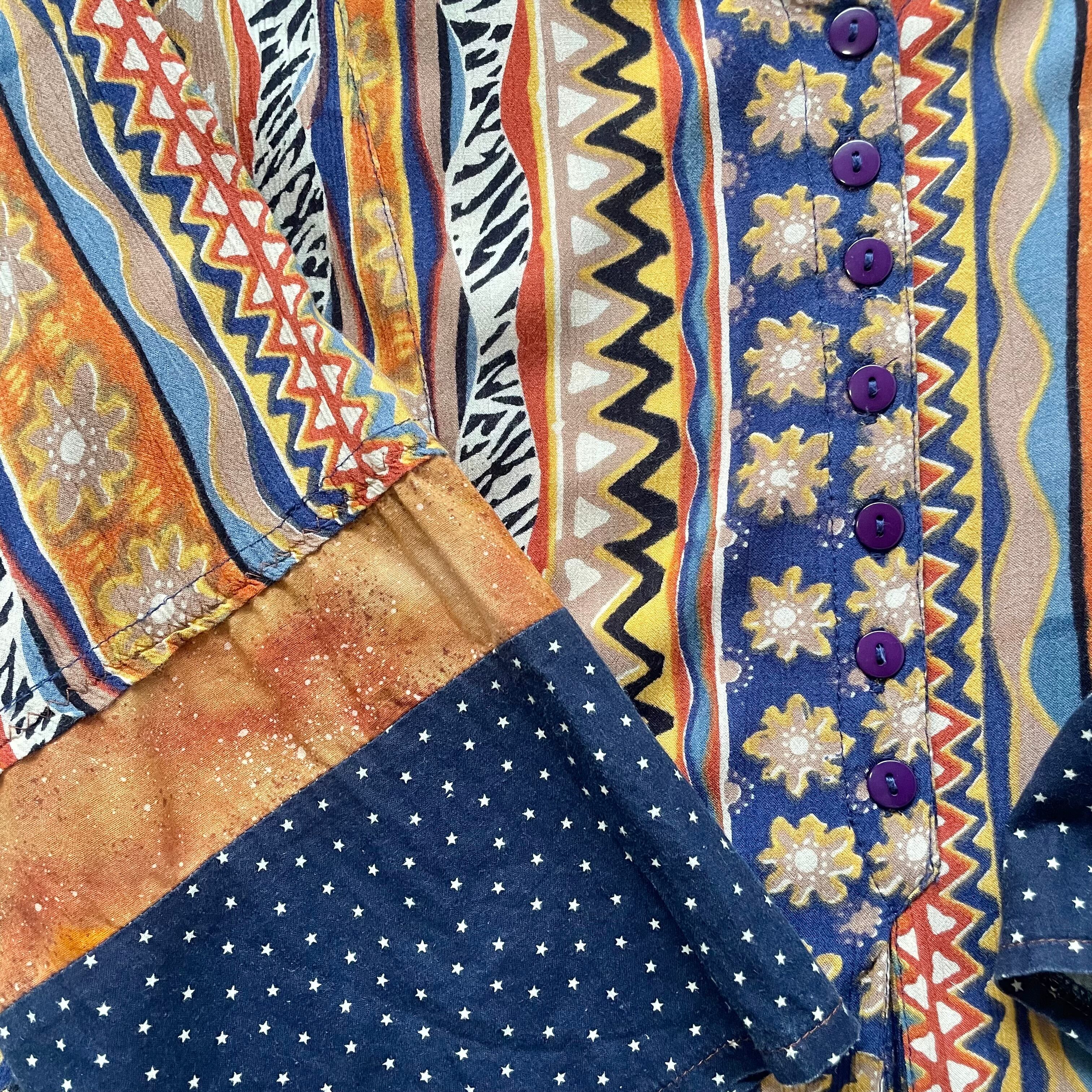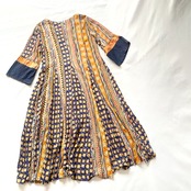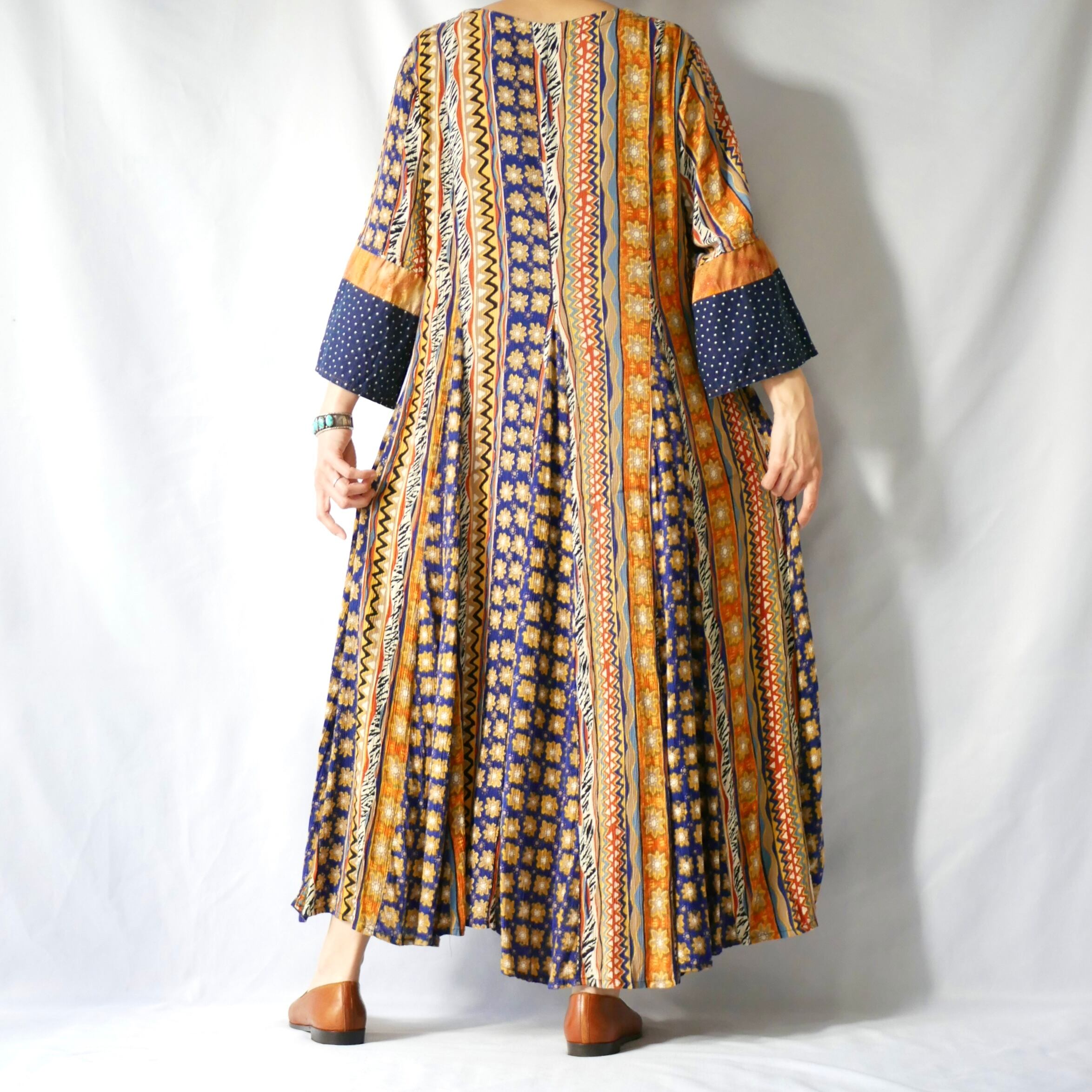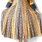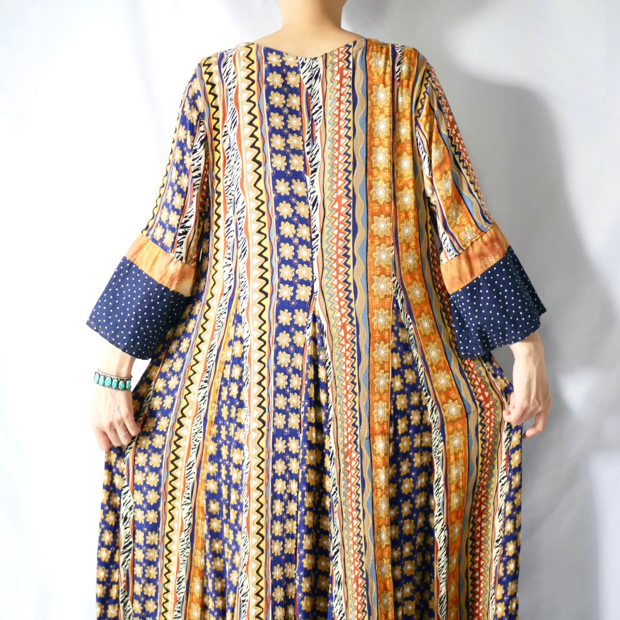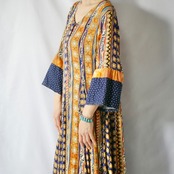 お花や波波、星や三角やゼブラ柄など、沢山の色柄が混じりつつもアフリカンテイストに纏めたようなマキシ丈ワンピースです。