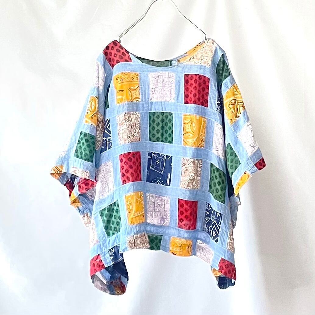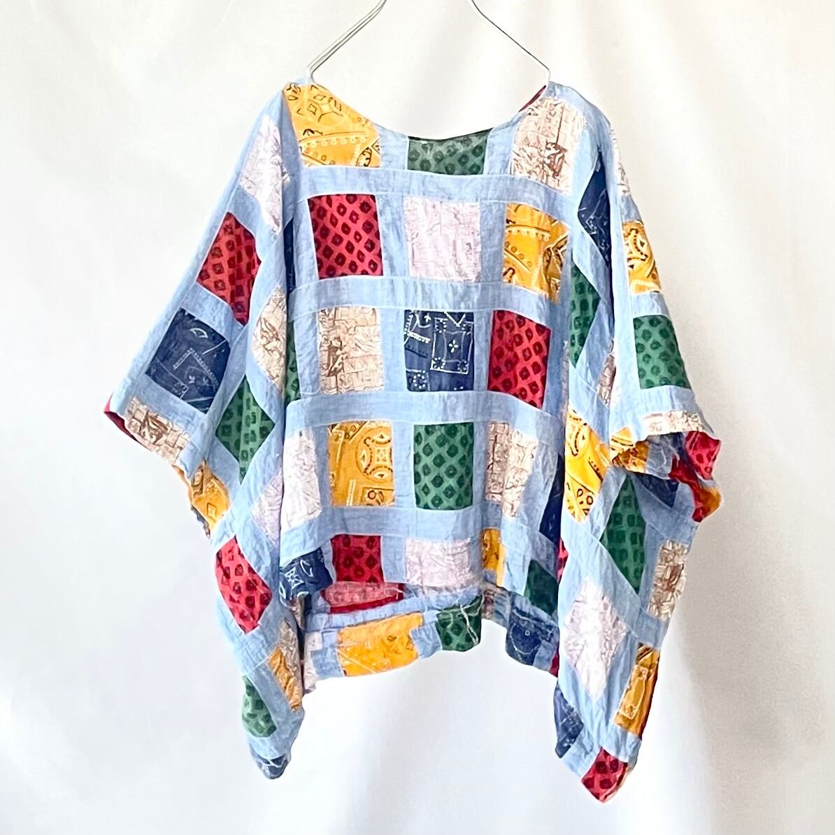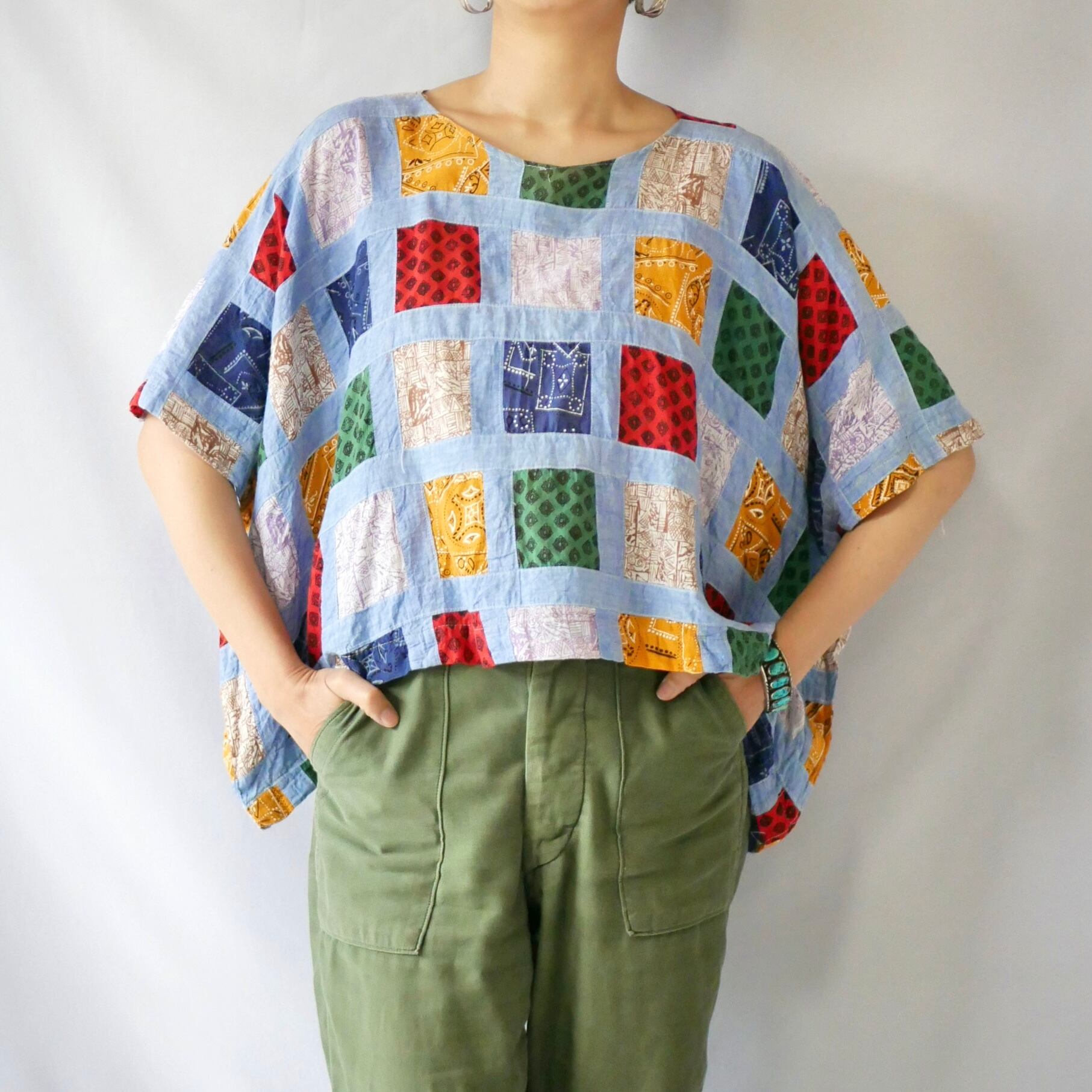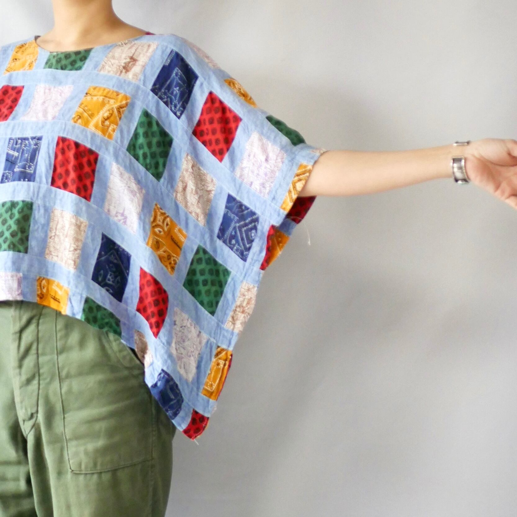 ダンガリーデニム地に、ペイズリー柄やエスニック、バンダナ柄などの様々なカラフル生地のパッチワークが楽しいプルオーバーブラウスです。