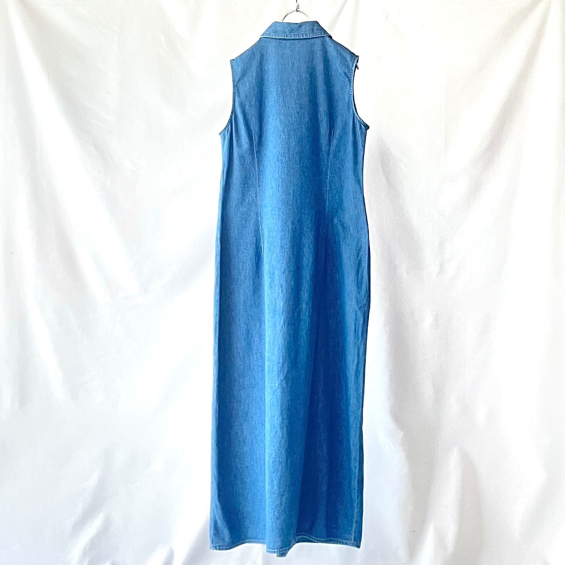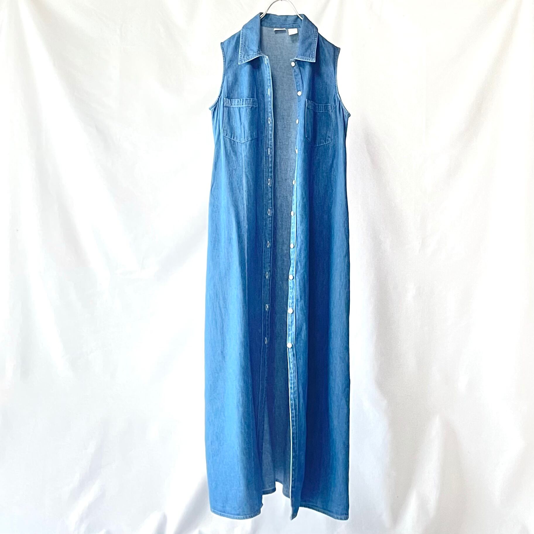 Denim sleeveless maxi shirt onepiece デニムノースリーブマキシ丈前ボタンシャツワンピース