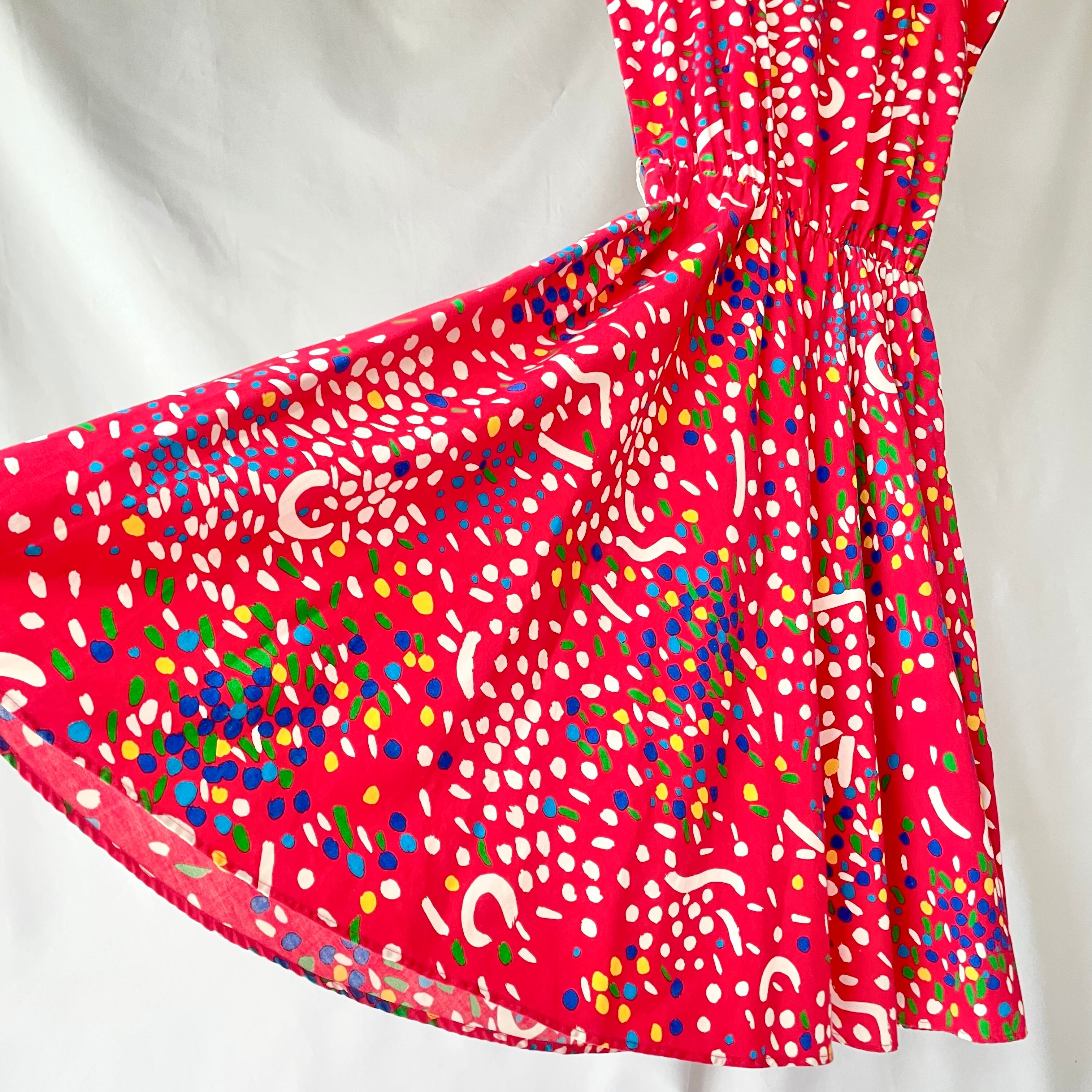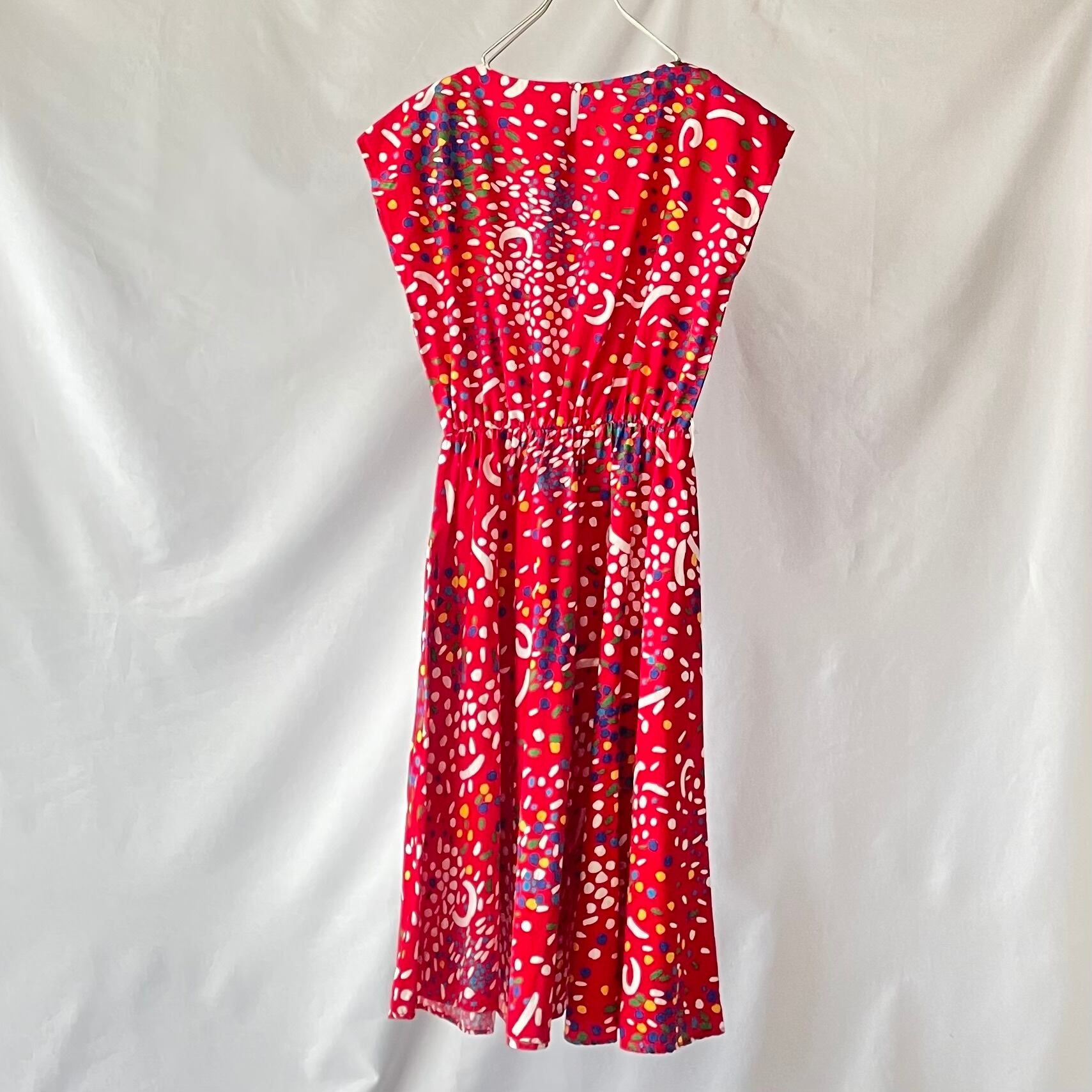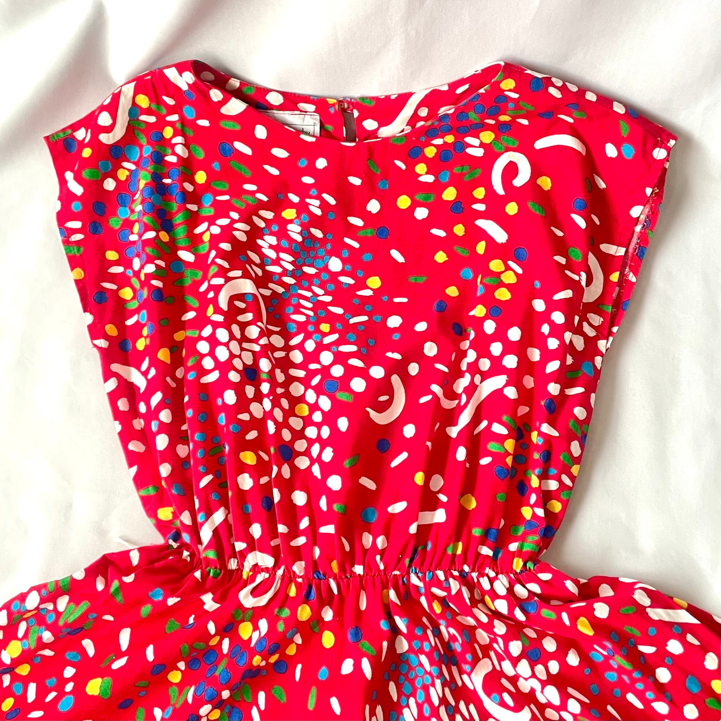 赤地にカラフルで歪な、絵の具を散りばめたような柄のアメリカ製フレンチスリーブワンピースです。