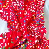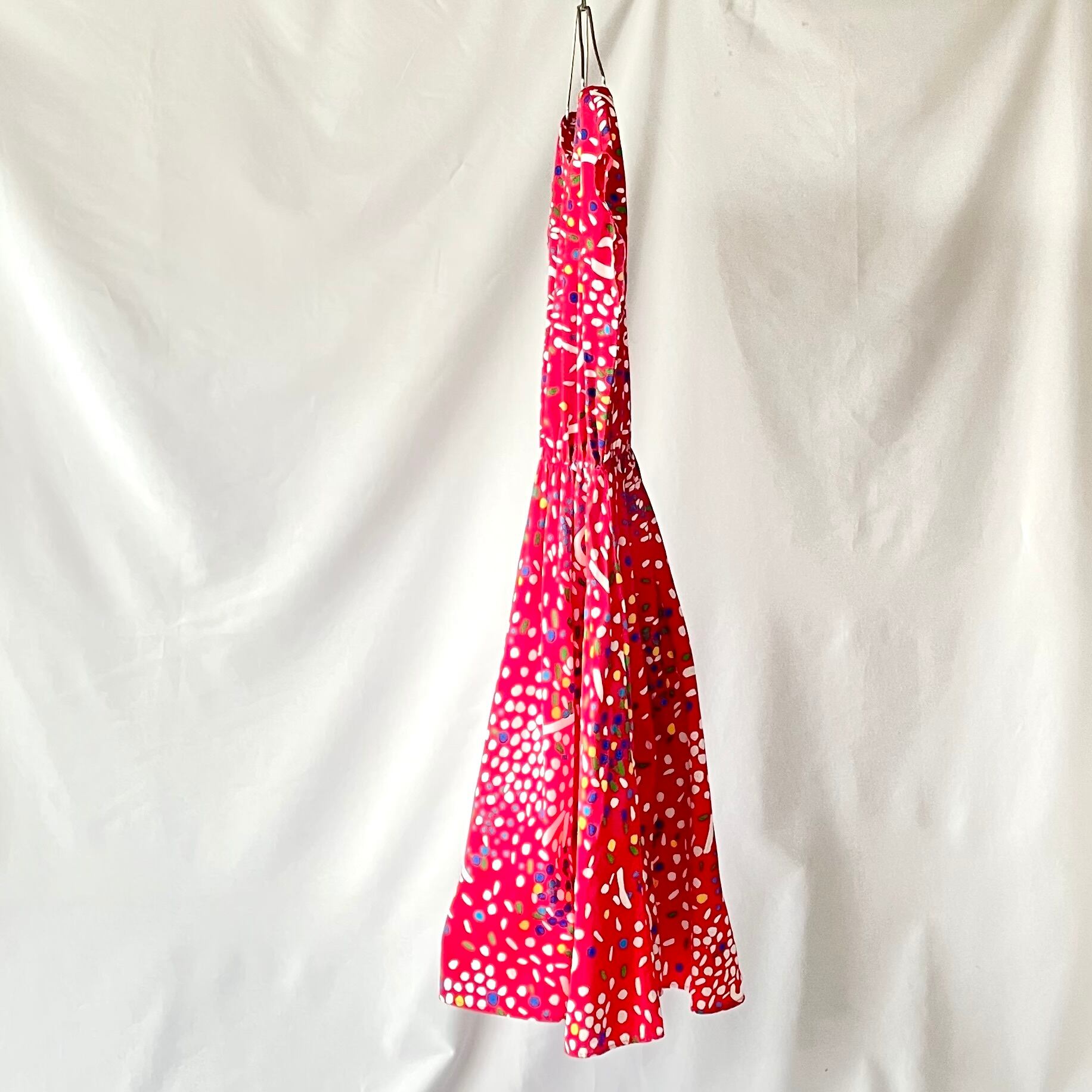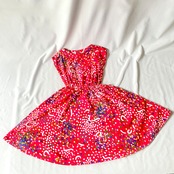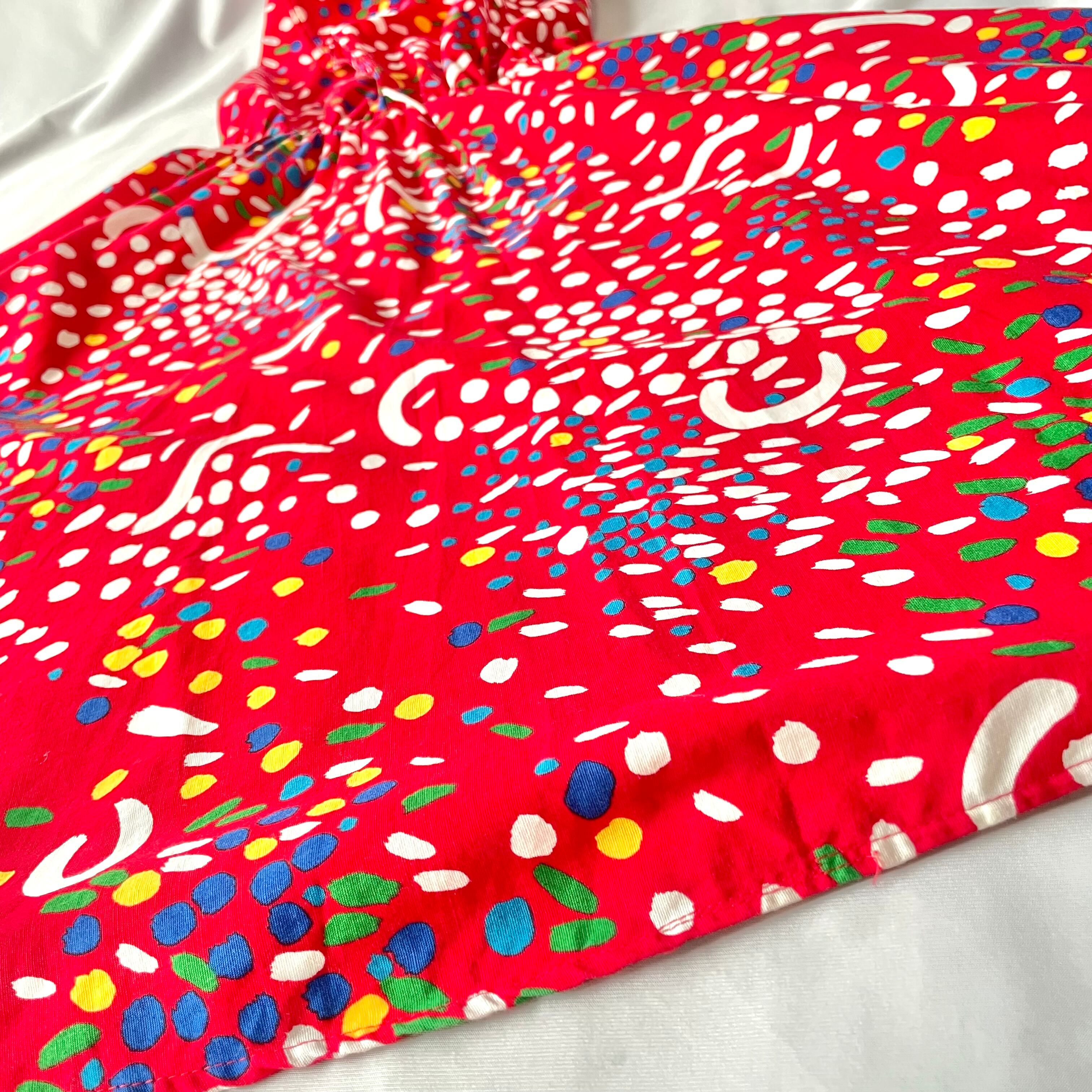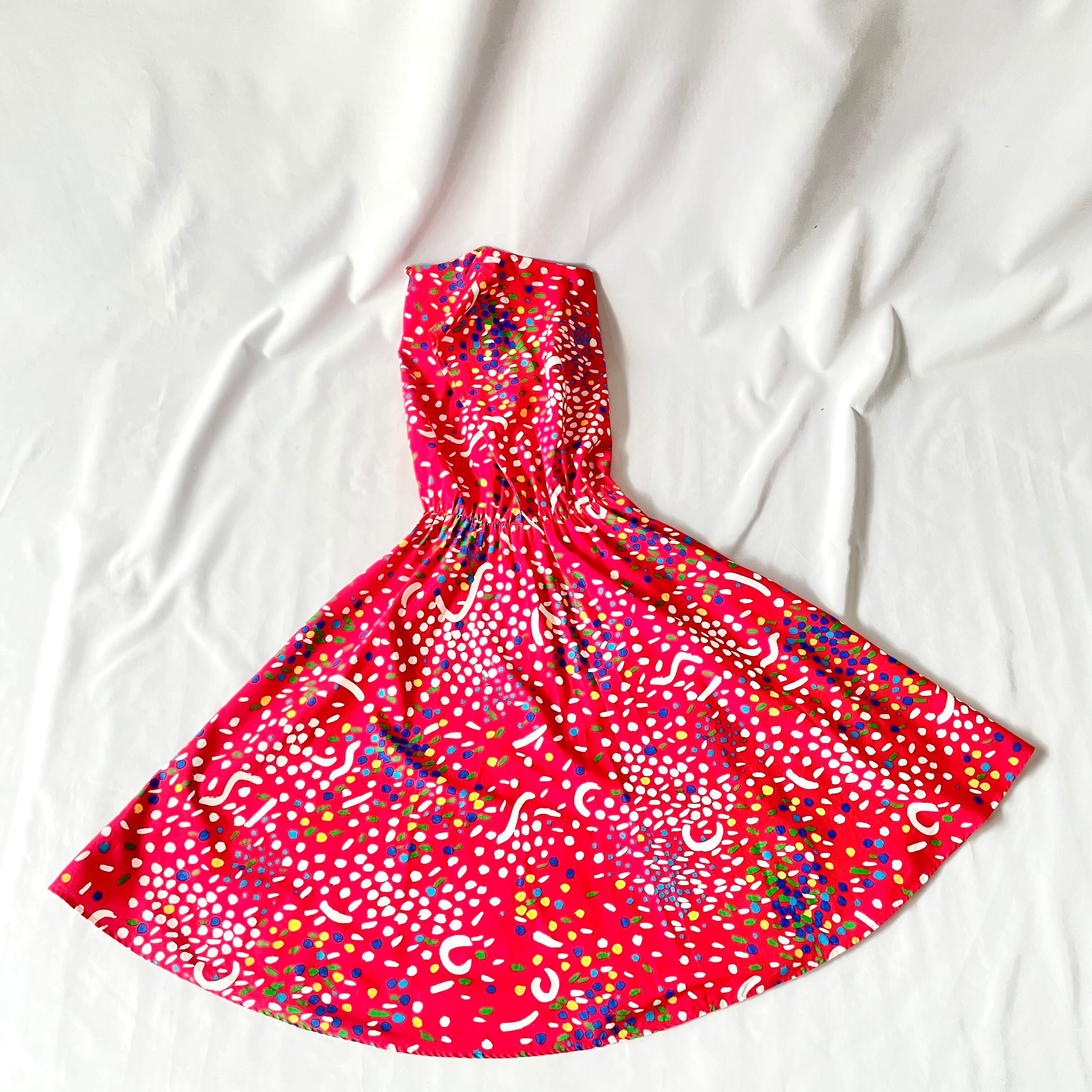 赤地にカラフルで歪な、絵の具を散りばめたような柄のアメリカ製フレンチスリーブワンピースです。