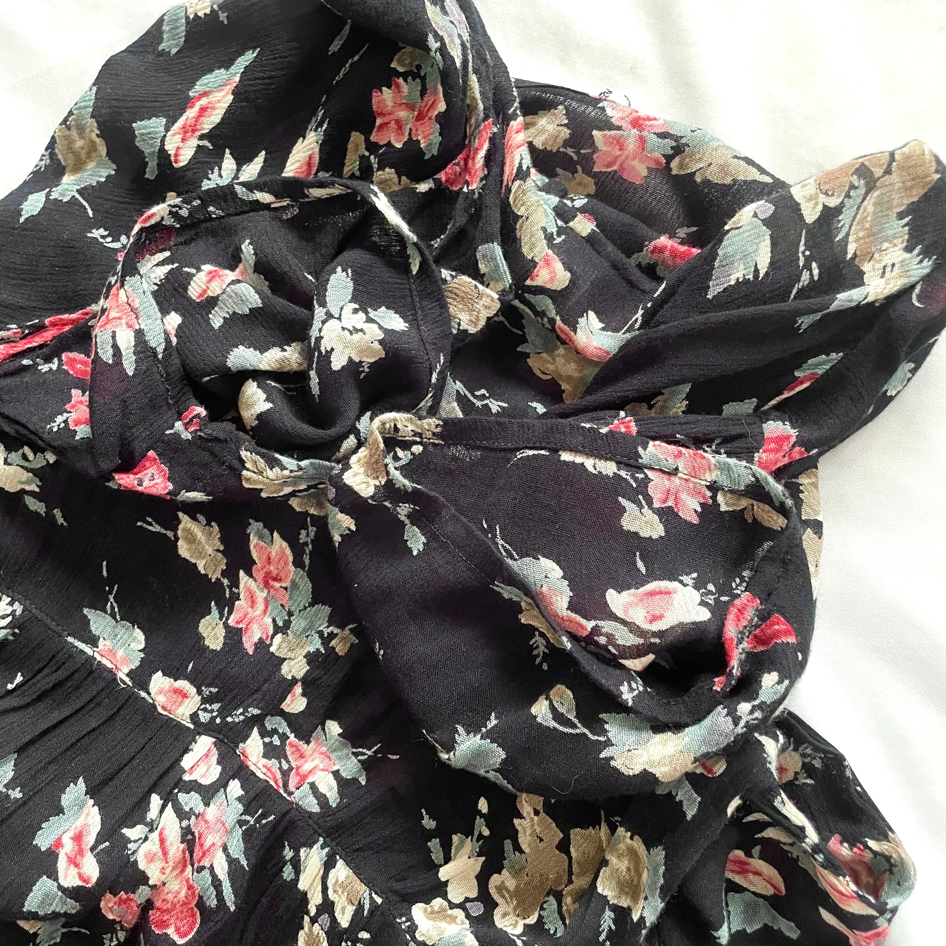 定番で可愛い、黒地に花柄の薄手レーヨン100%半袖マキシ丈ワンピースです。ハイウエスト切替位置に紐付きで、後ろか前で結べます。