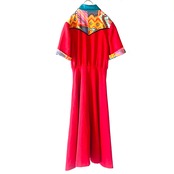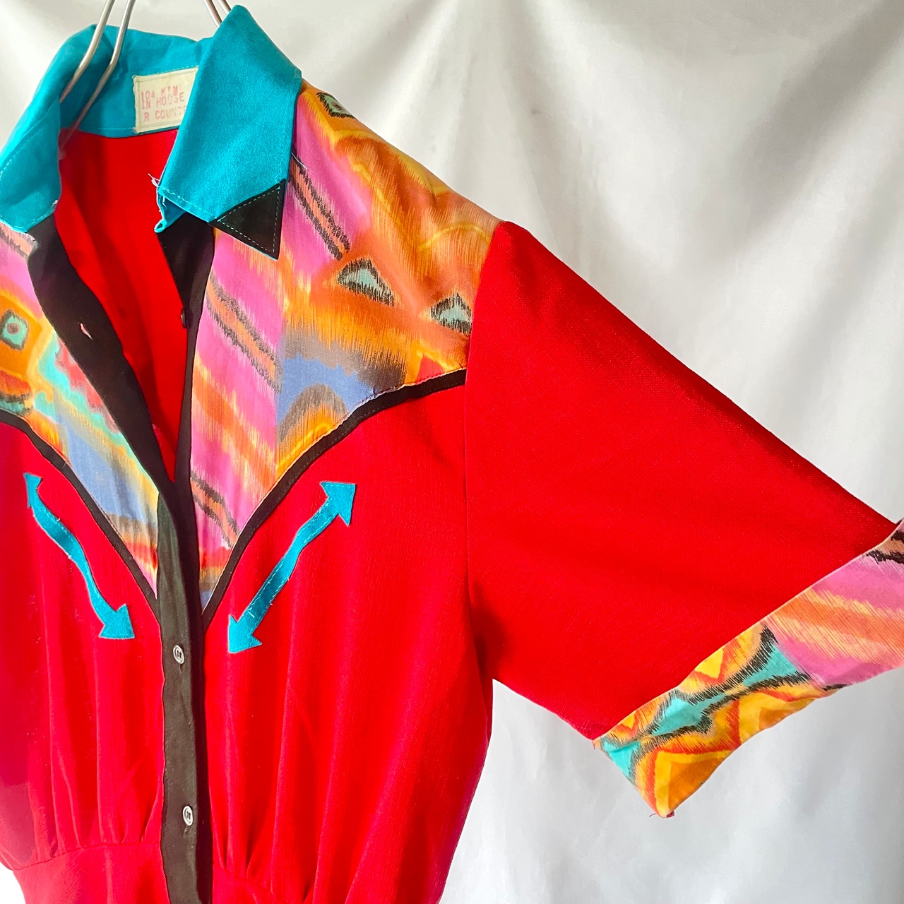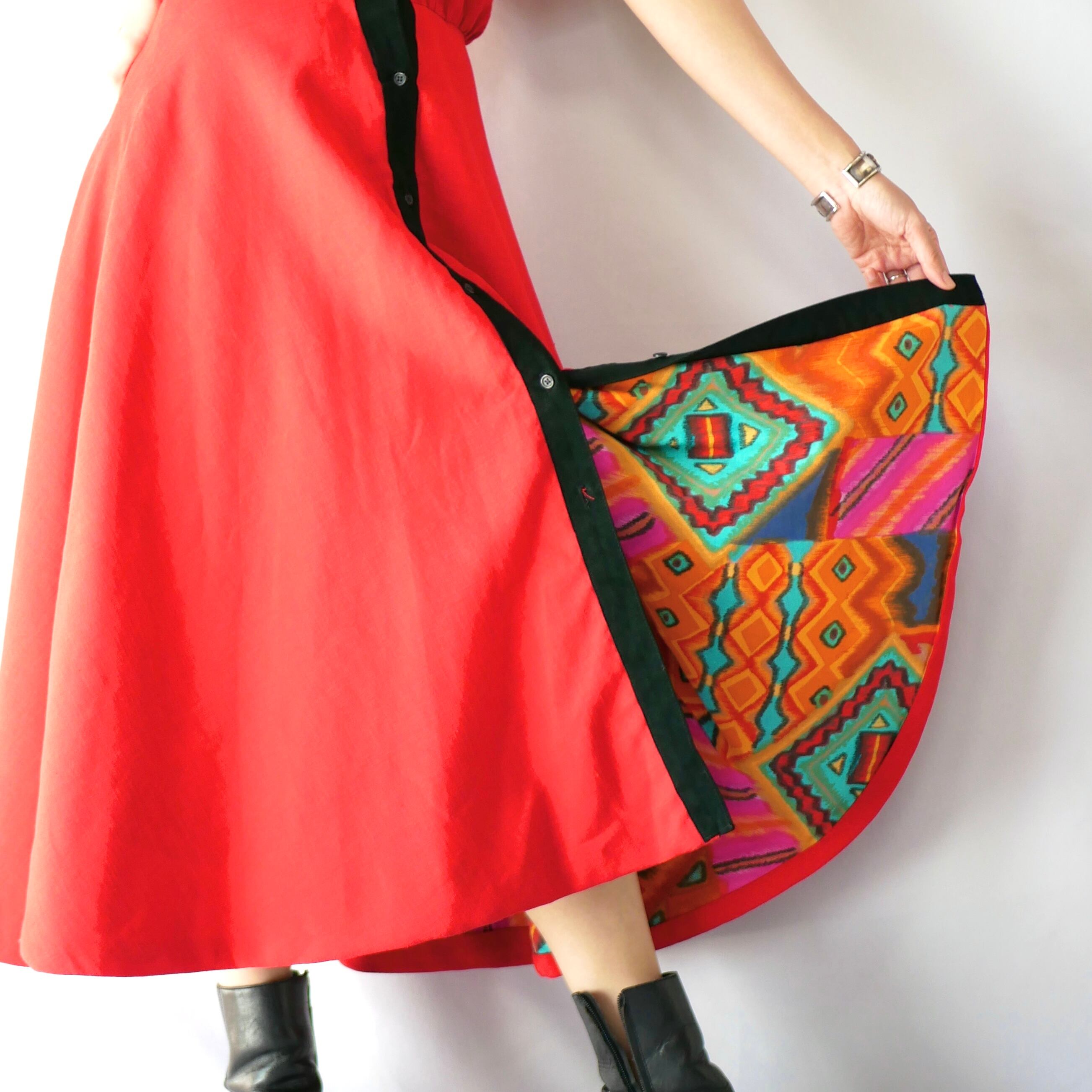 赤地にターコイズの襟が映えるウエスタン調デザインの半袖フレアシルエットワンピースです。裏地に柄生地が貼ってあり、裾がひらりと裏返った時も素敵に見せてくれるデザインです。フロントボタンなので羽織としてもお使いいただけます。