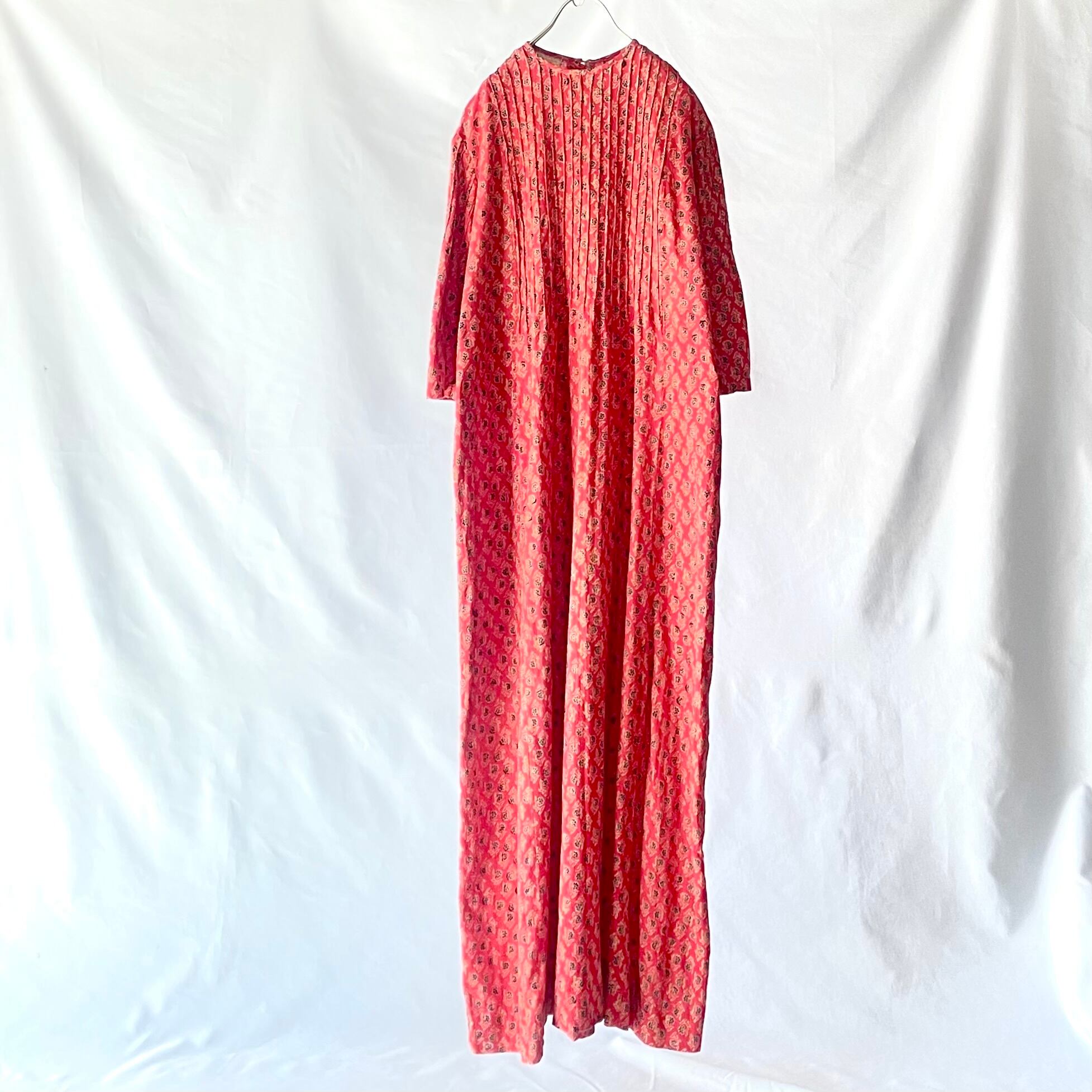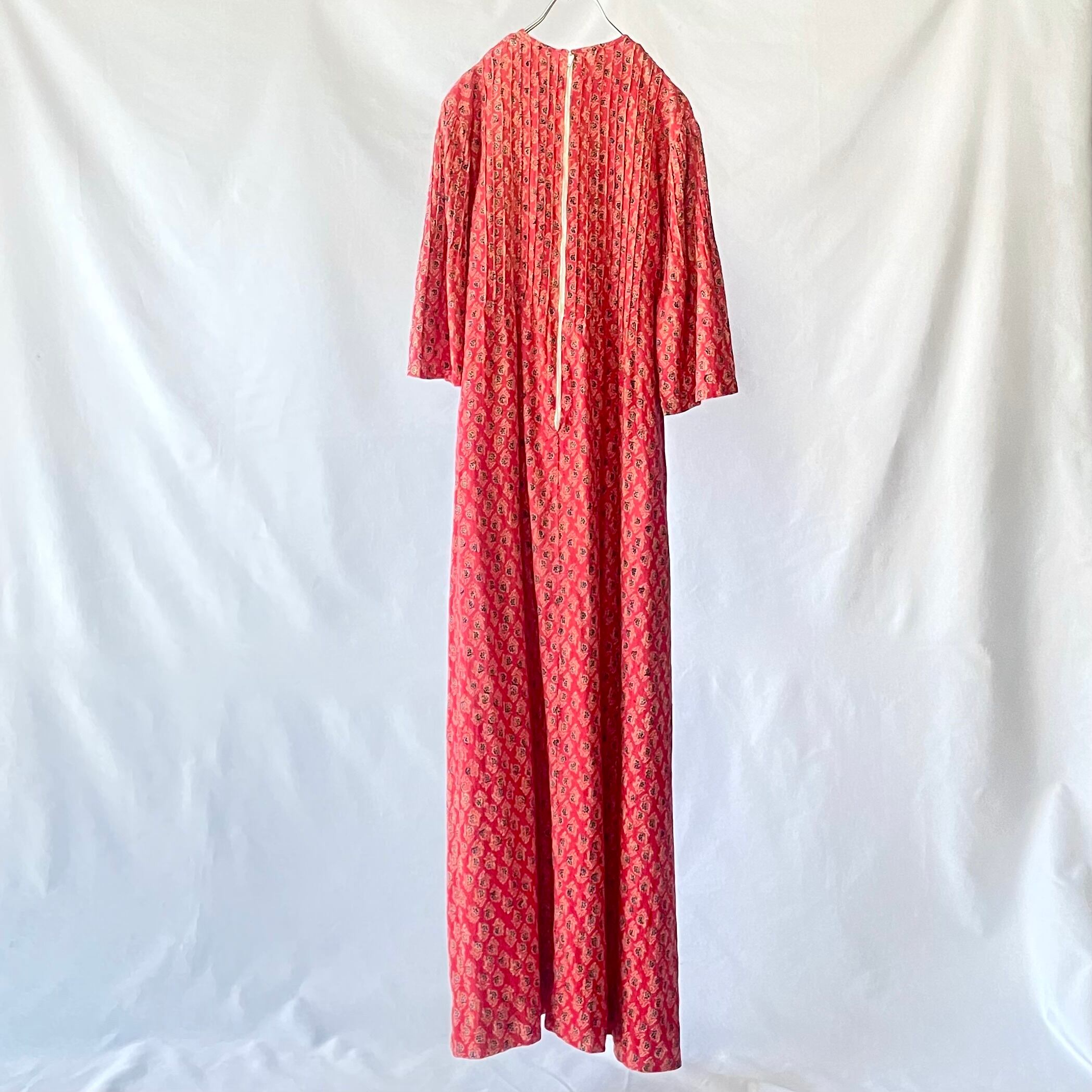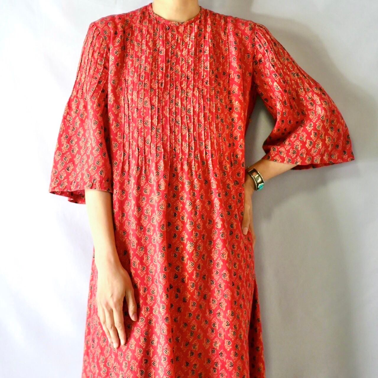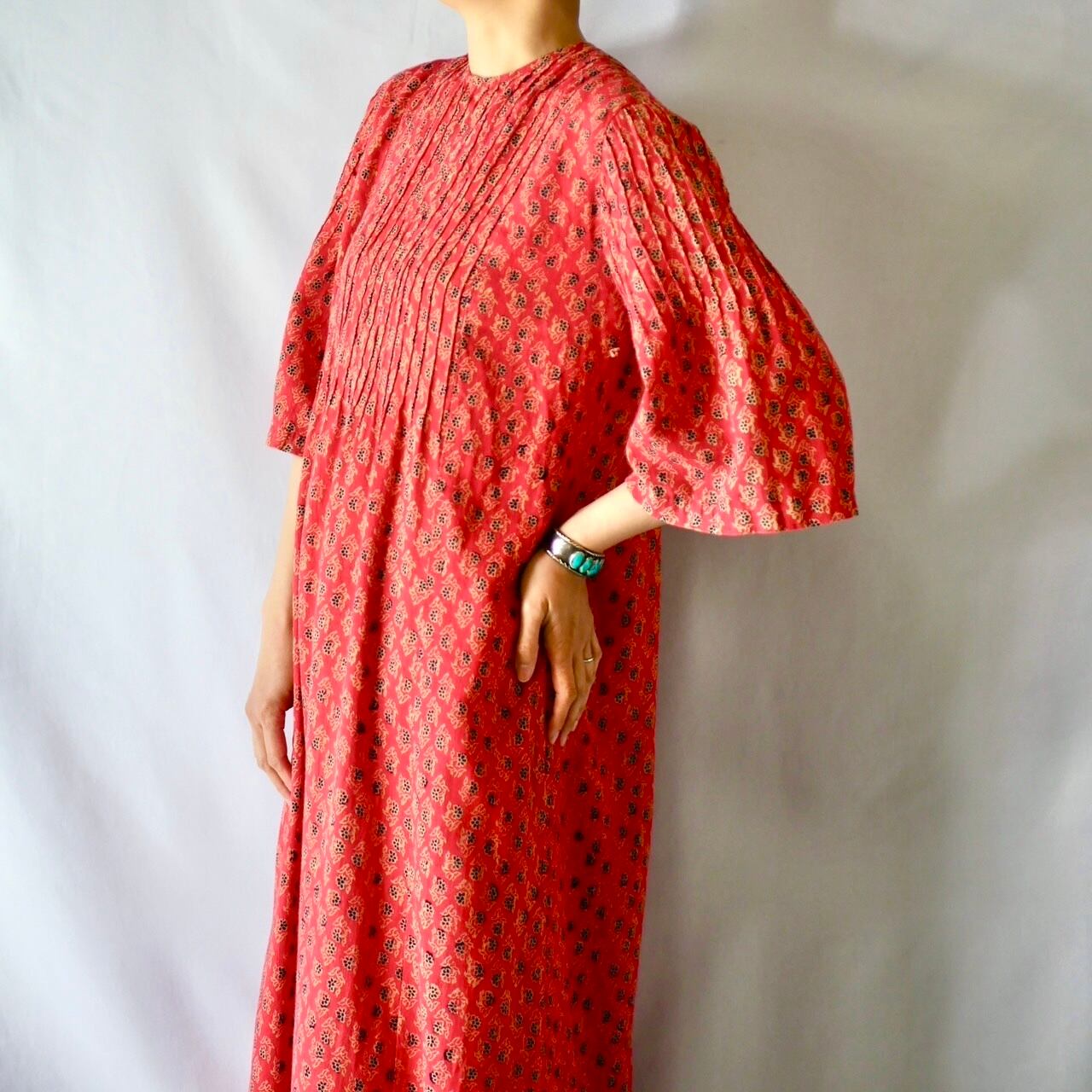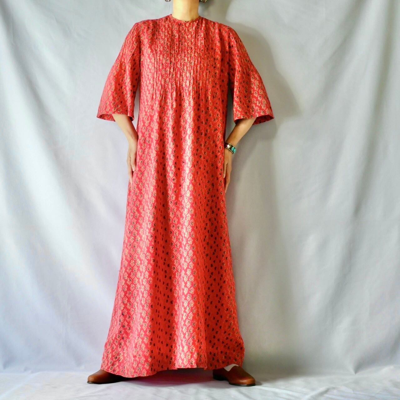 70s vintage indian cotton ethnic maxi onepiece インド綿朱赤花柄フレア袖マキシワンピース