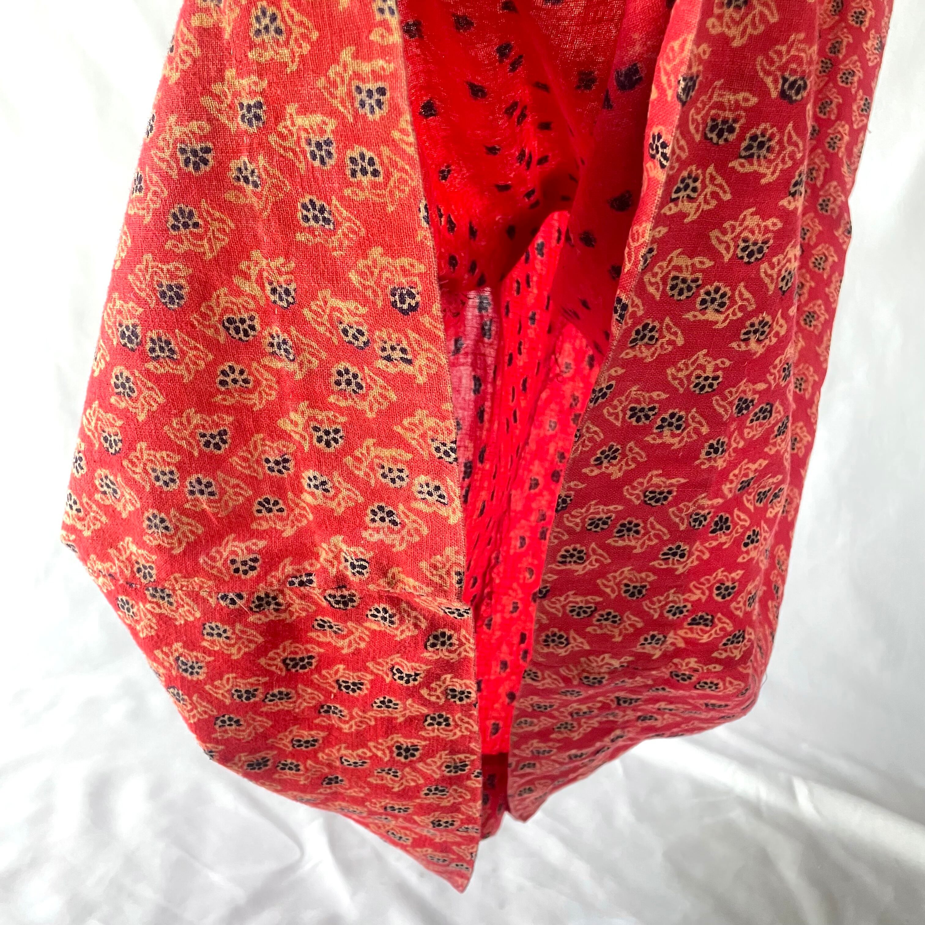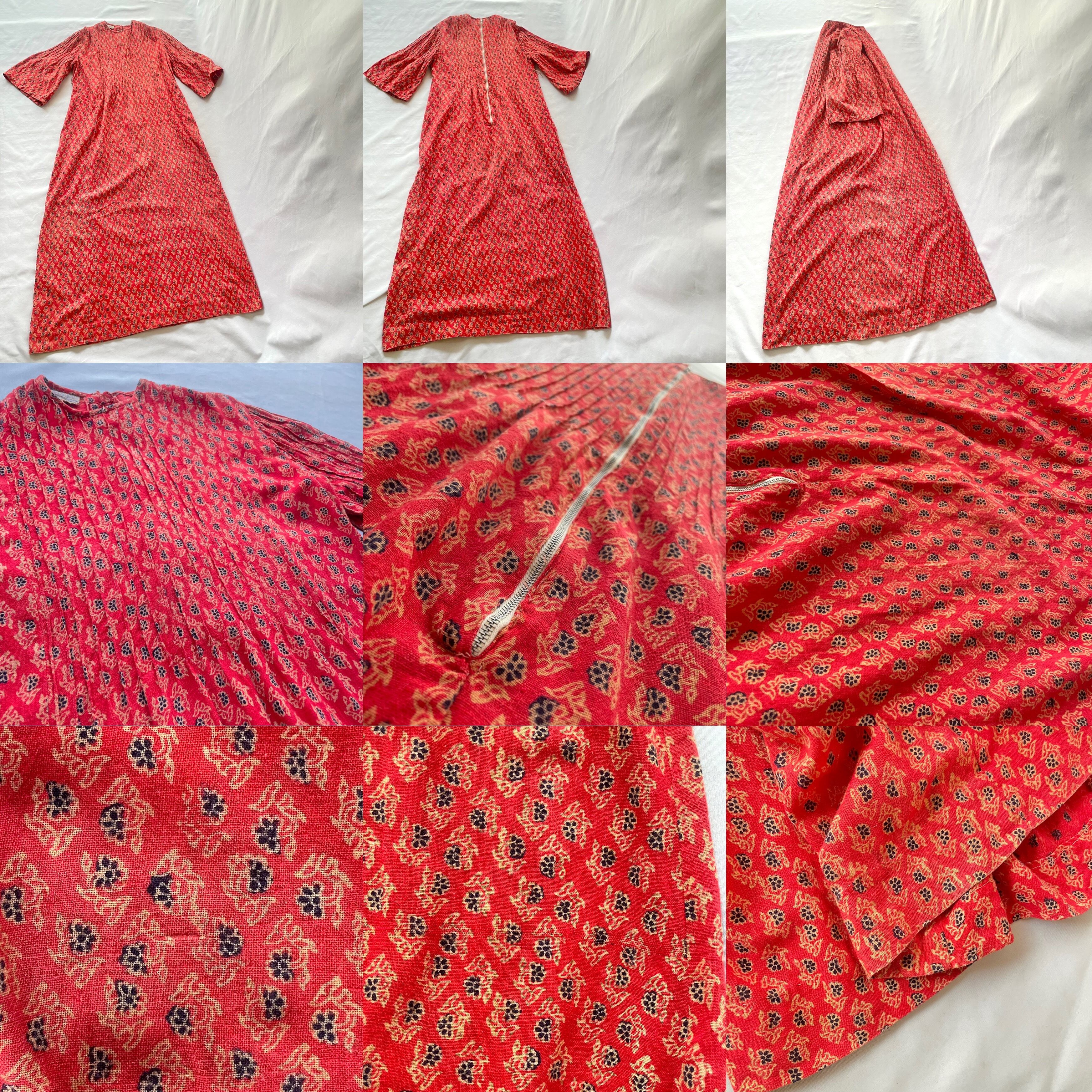 朱色レッドの葡萄のような花柄インド綿生地の70年代ヴィンテージワンピースです。
