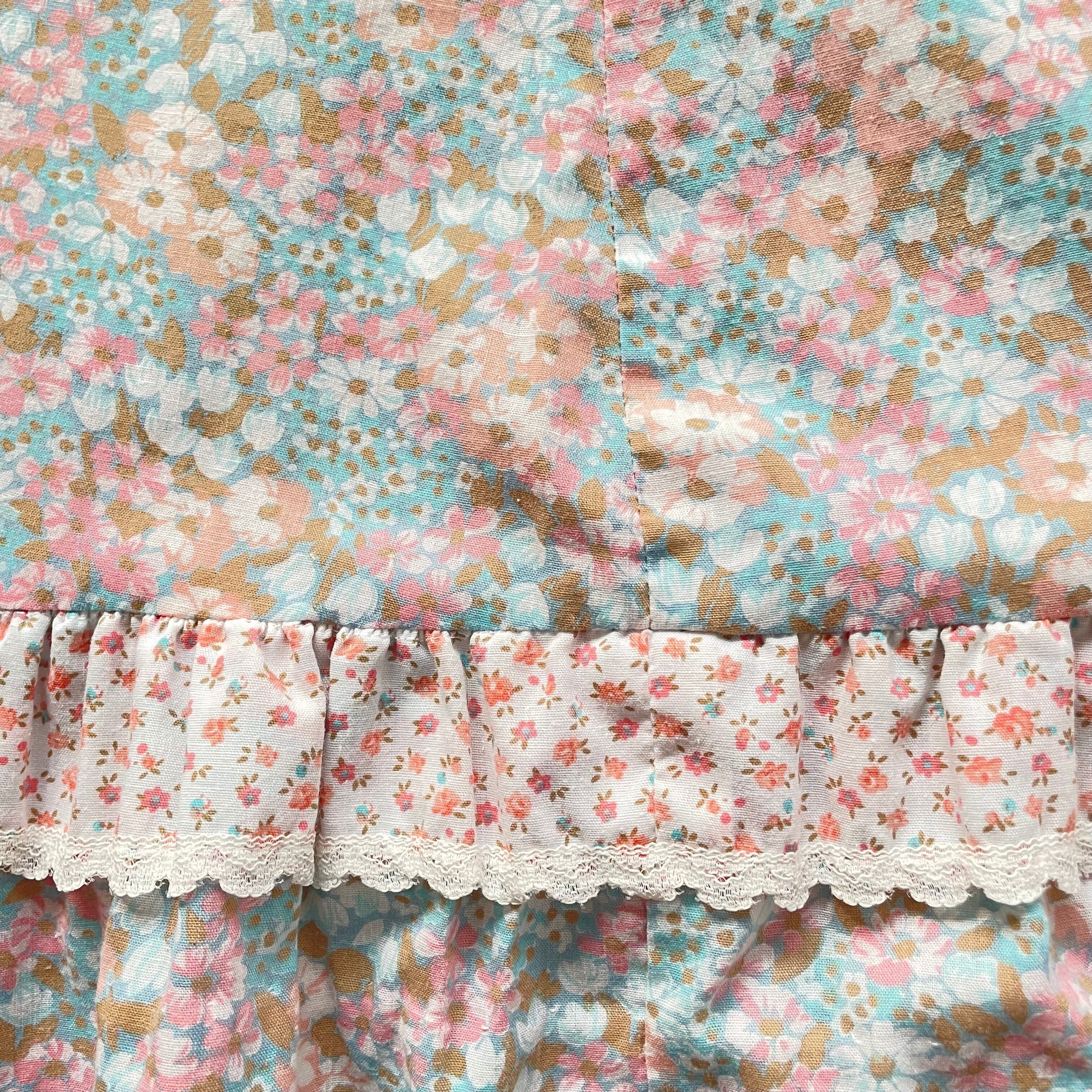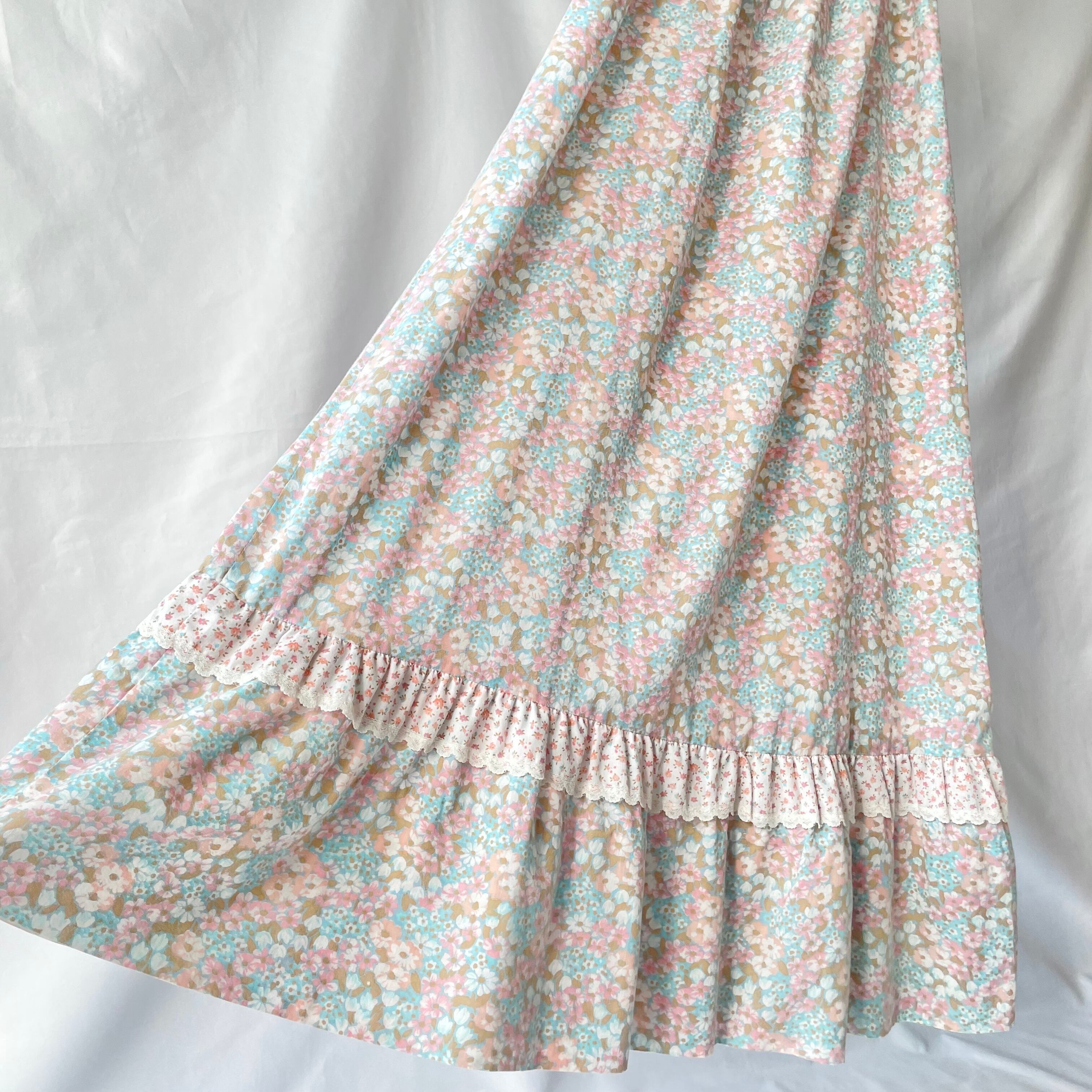 淡いピンクや水色の小花柄生地にレースや一段ティアードの装飾が可憐で素敵です。