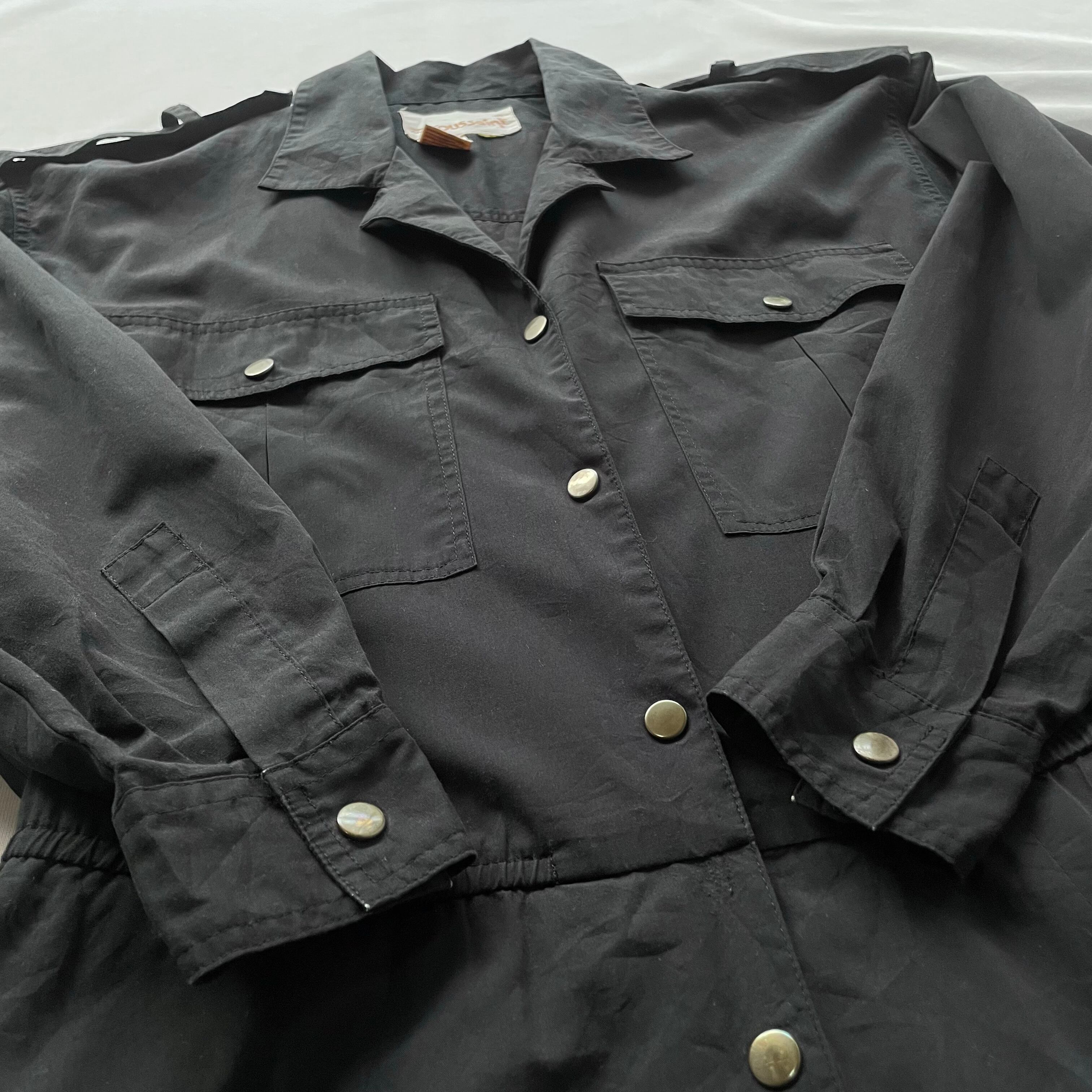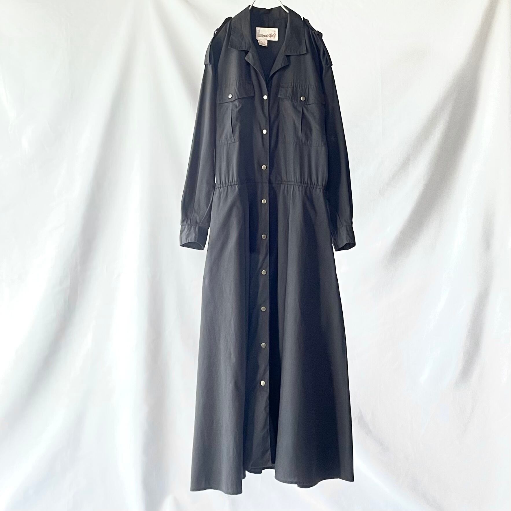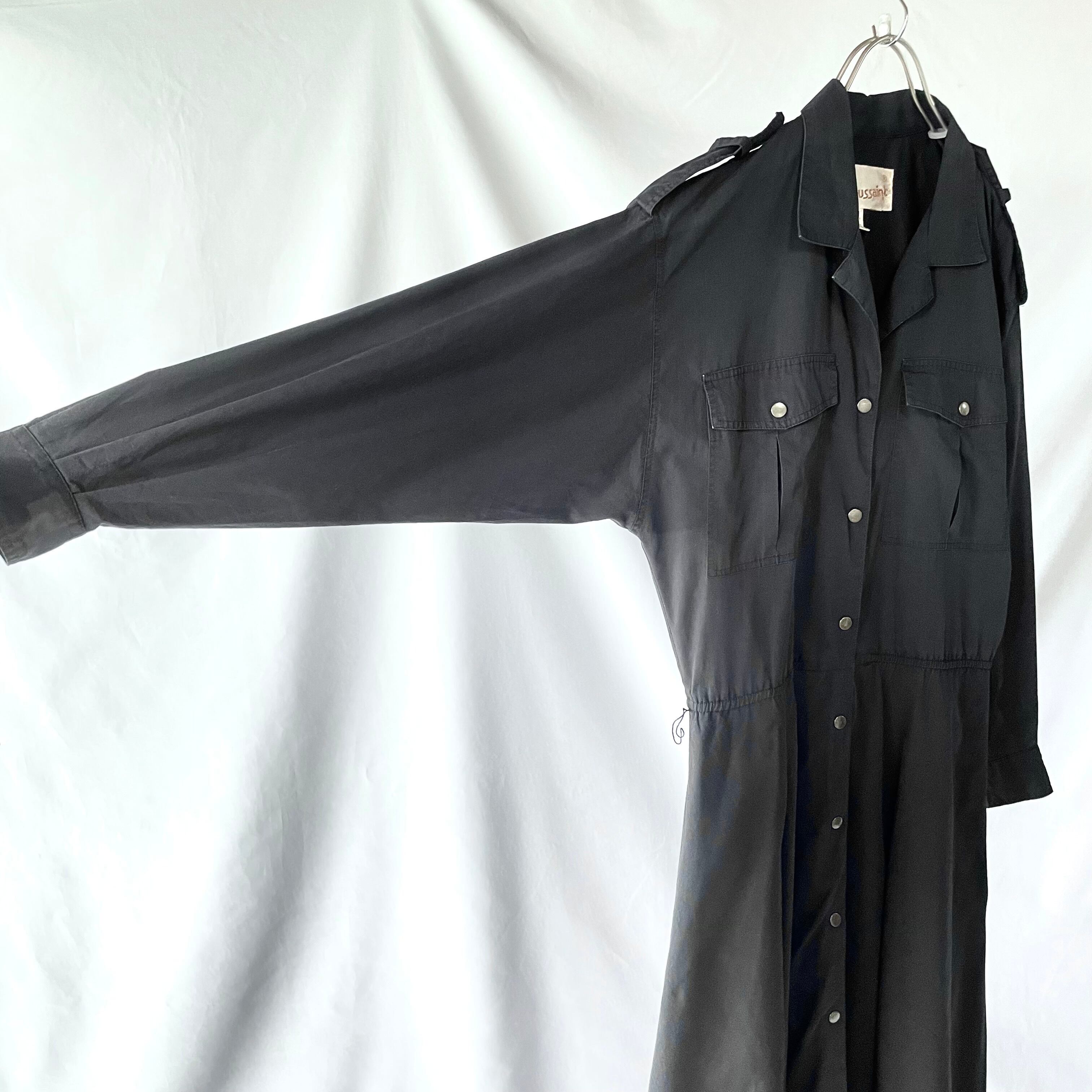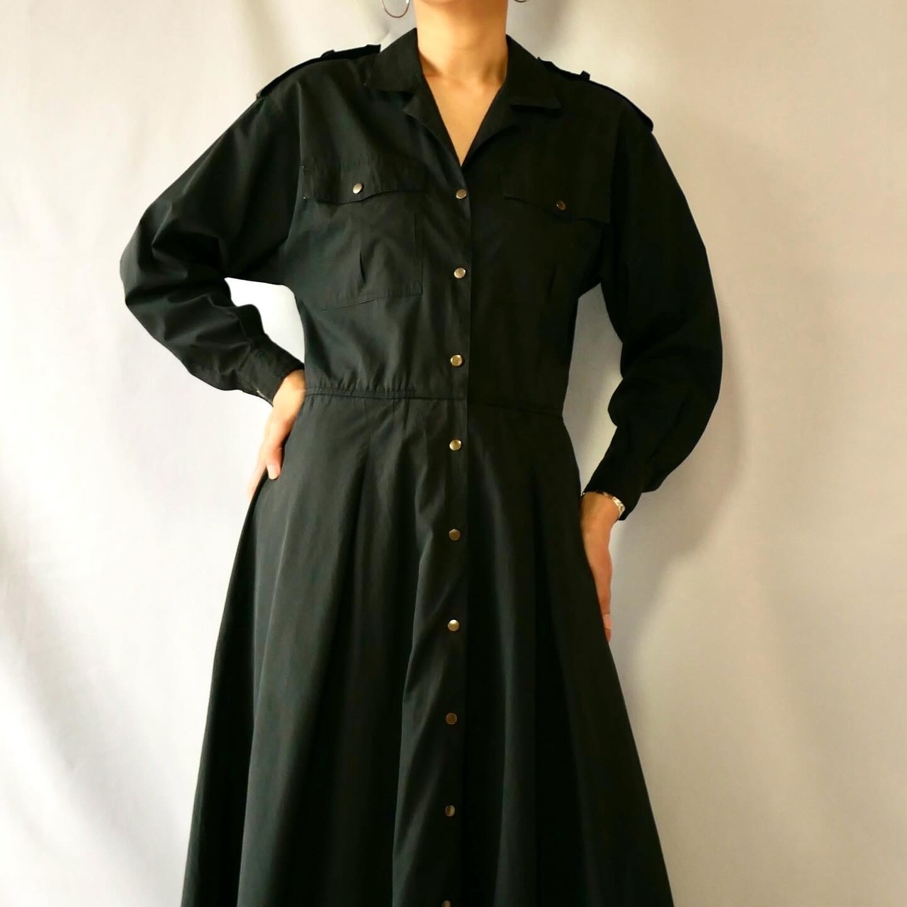 さらりと滑らかなコットンポリエステル素材のヴィンテージ黒シャツワンピースです。肩にエポレット付き、両胸にフラップポケット付きで、シンプルながら飽きの来ないデザインです。ポケット付き