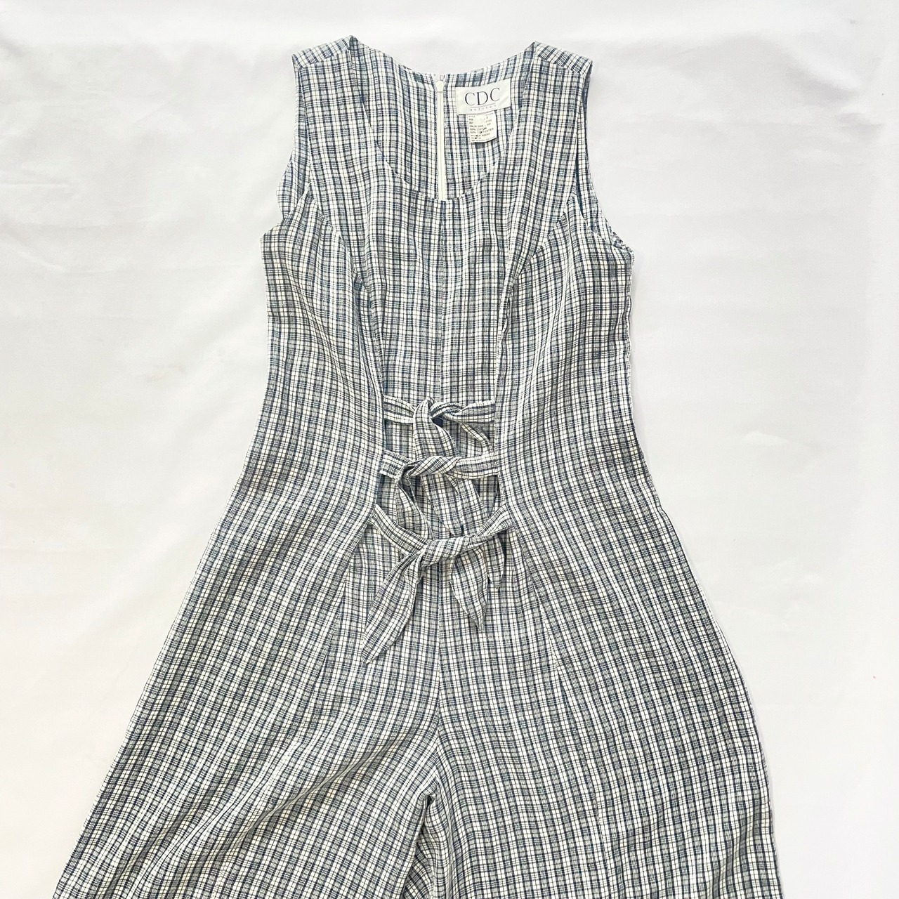 爽やかで涼しげなブルーマドラスチェック柄ノースリーブロンパースです。お腹の3段りぼんでウエストを絞れる可愛いデザインです。