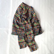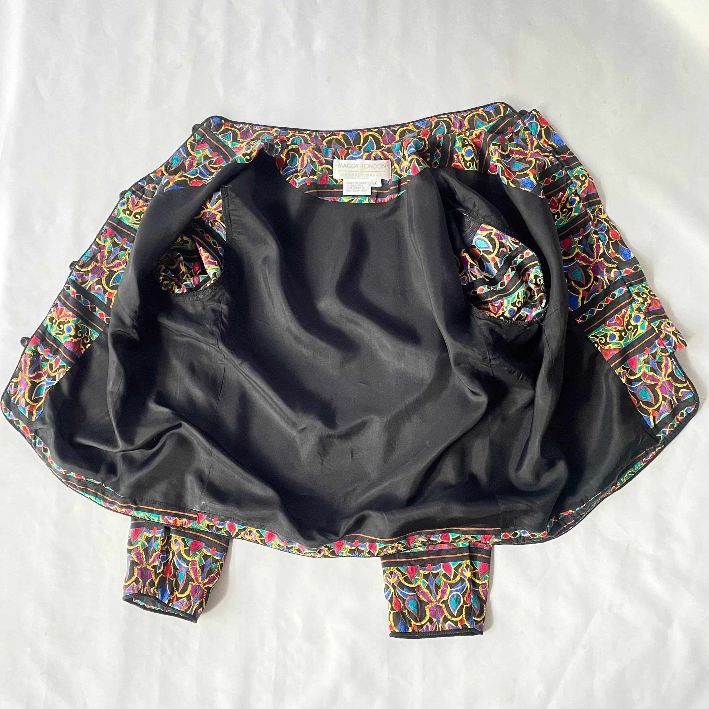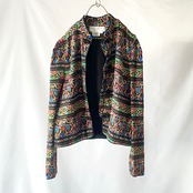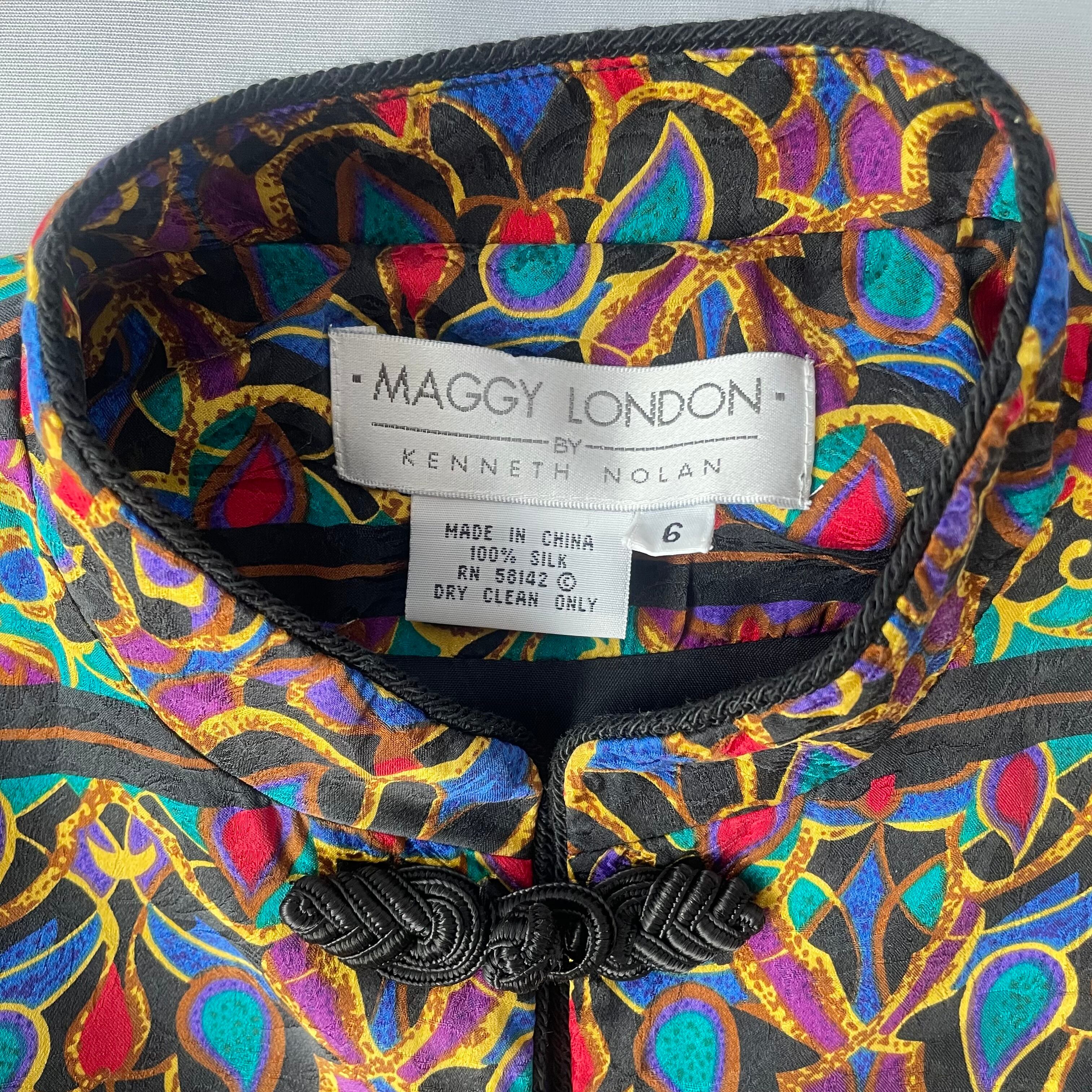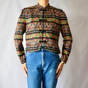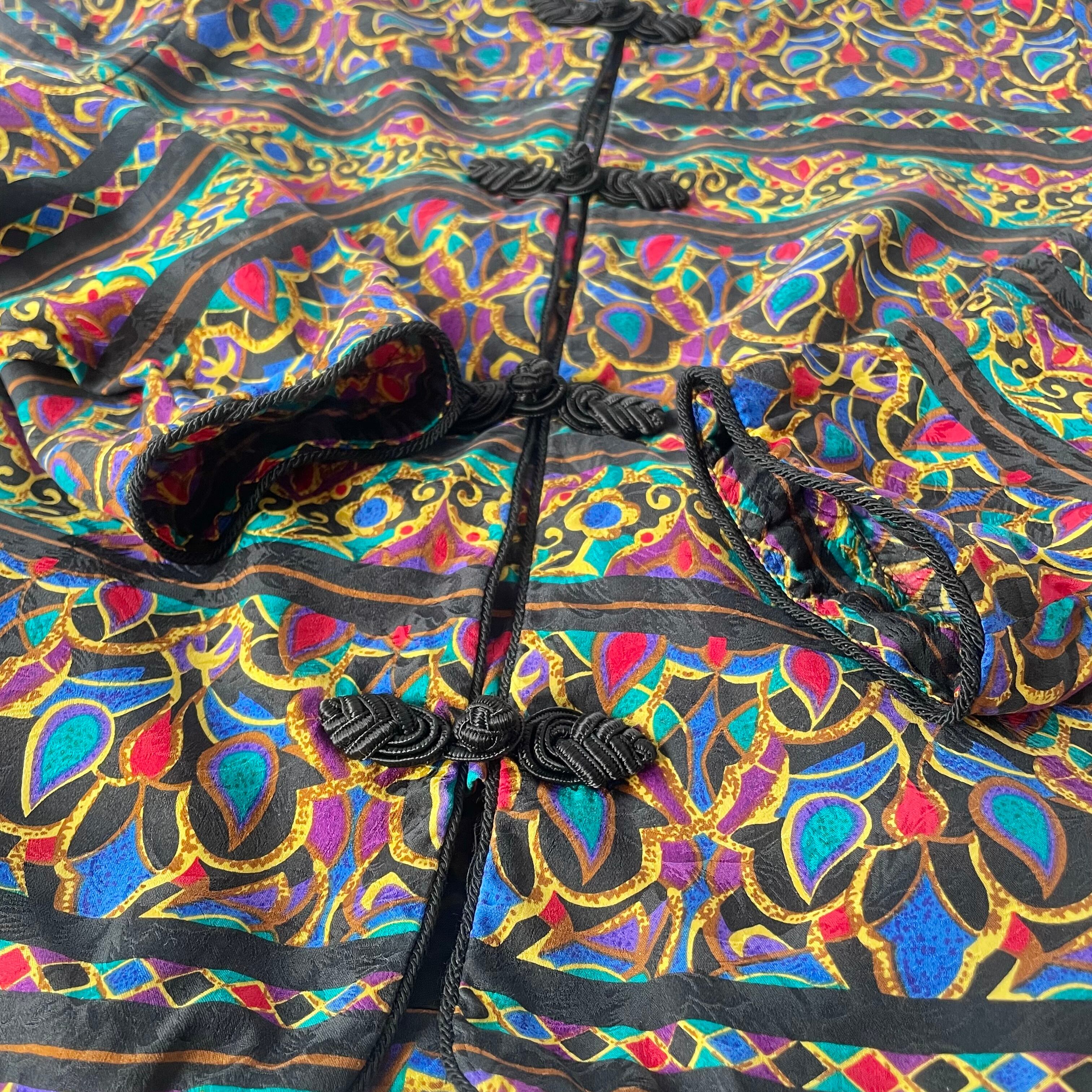 カラフルな柄のシルク100%素材にチャイニーズボタンが可愛い、スタンドカラーショート丈ブラウスです。薄手のジャケットのような使い方もできそうです。