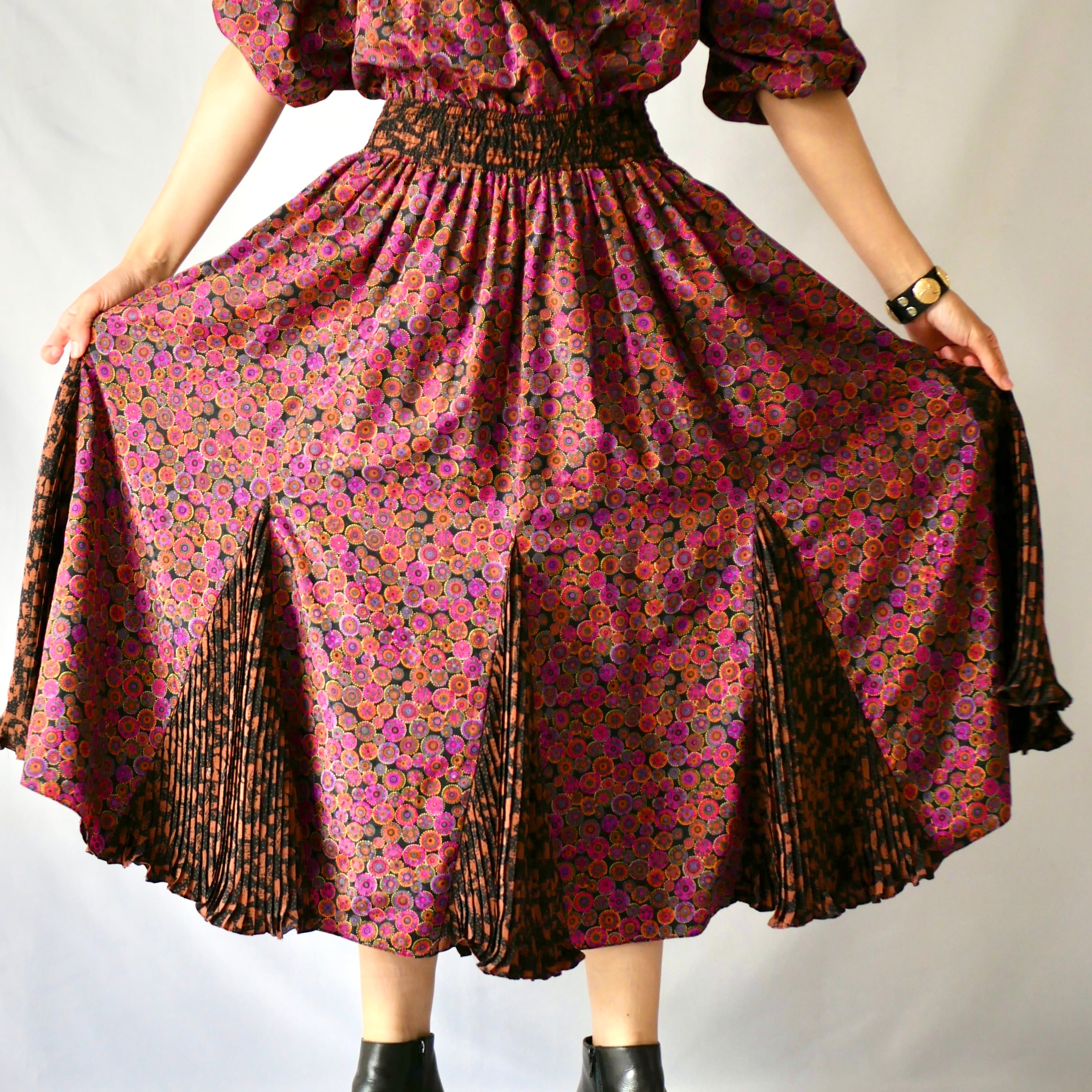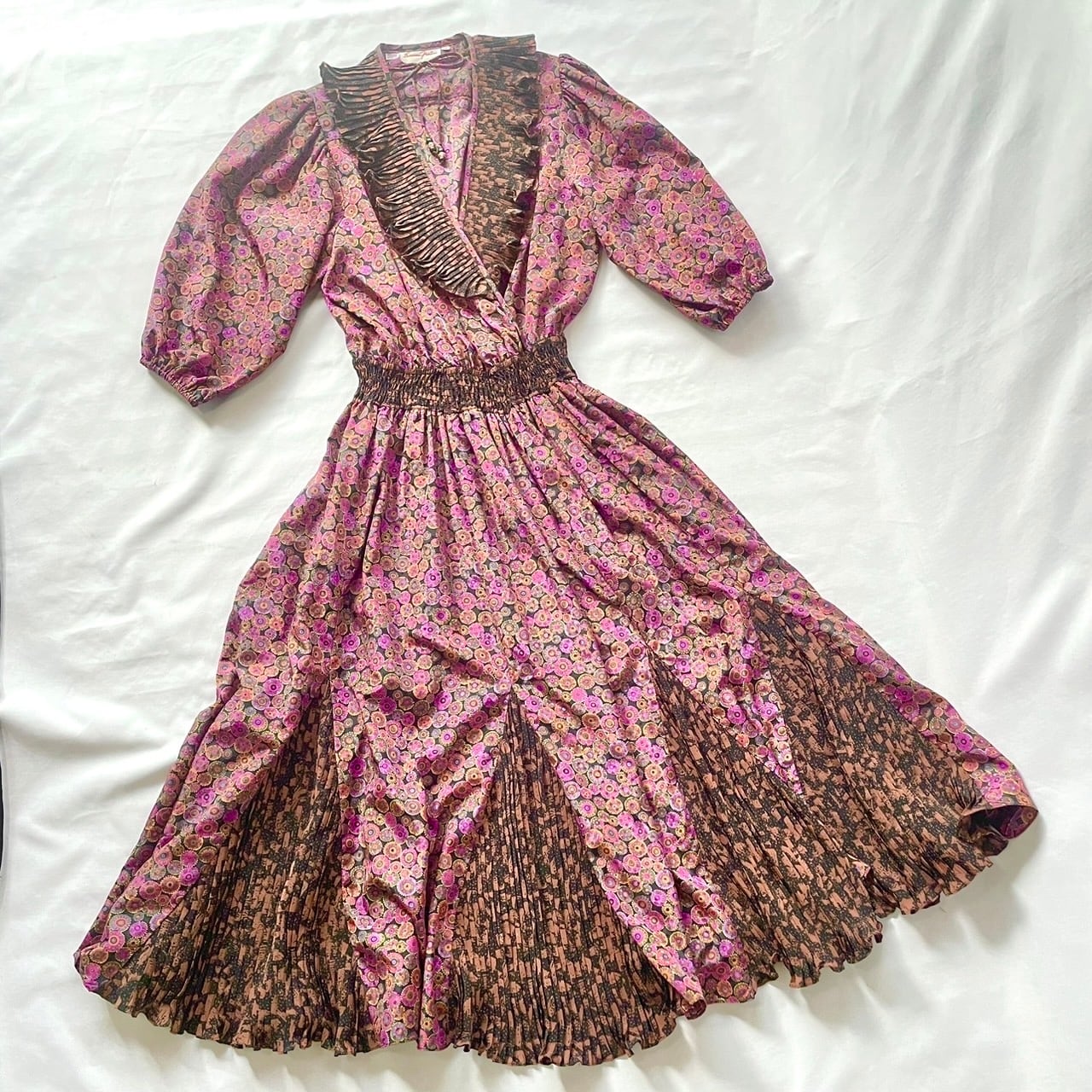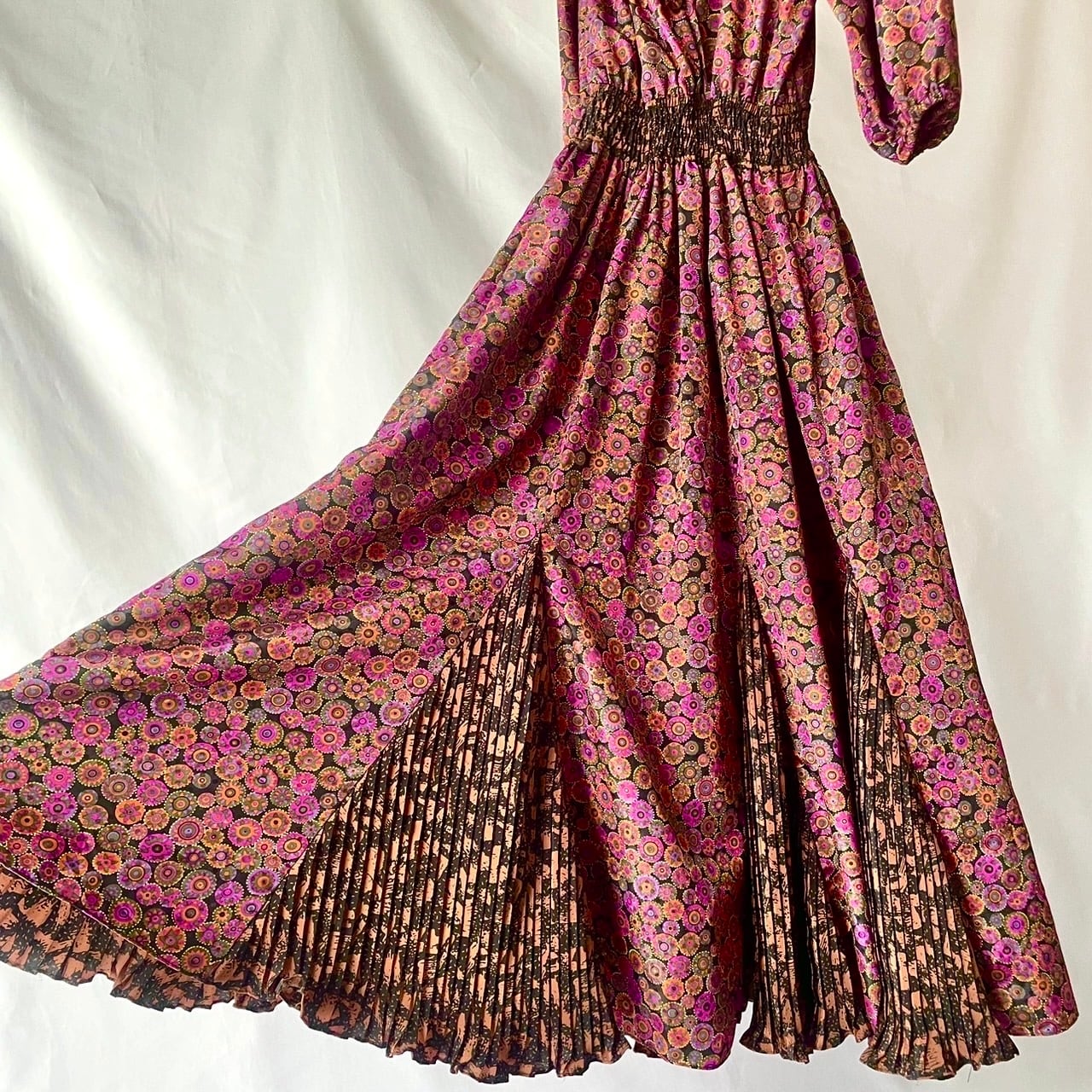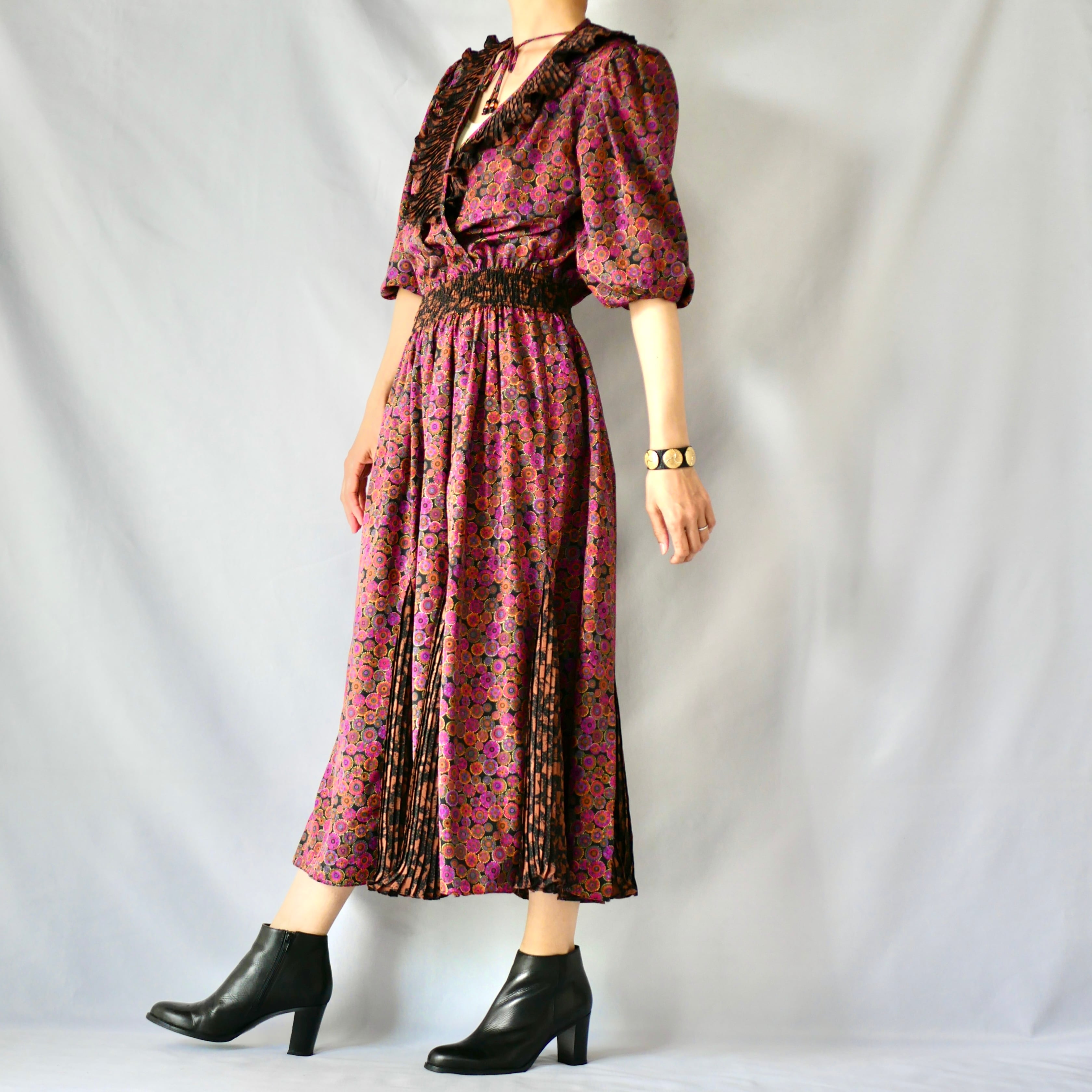 落ち着いたカラーリングながら鮮やかな総柄生地にフリルやシャーリング、プリーツといった華やかなデザイン満載の素敵なドレスです。