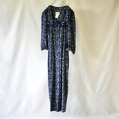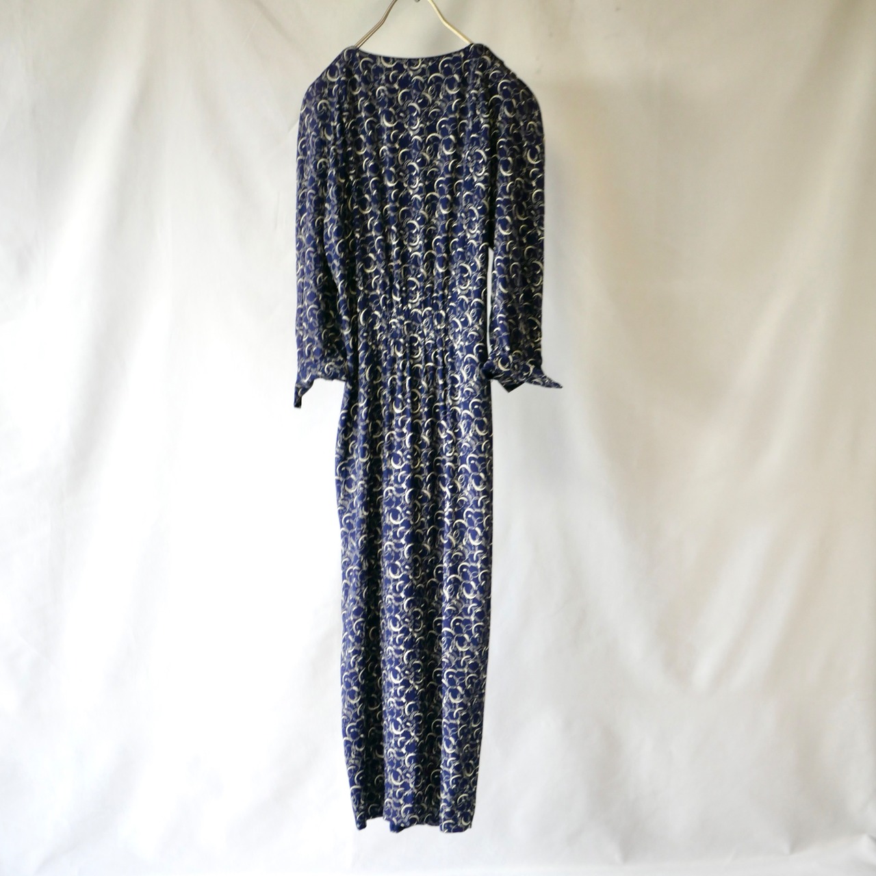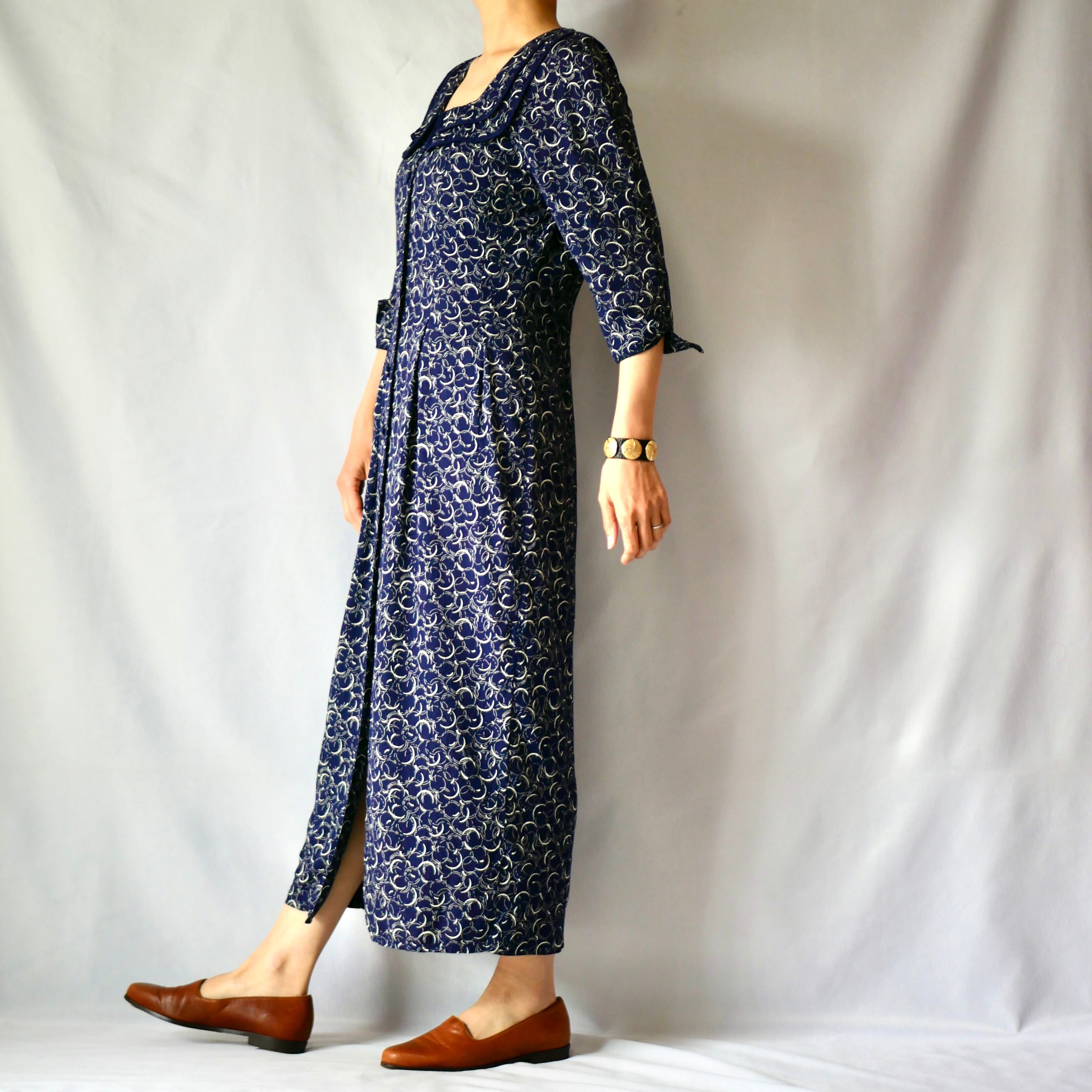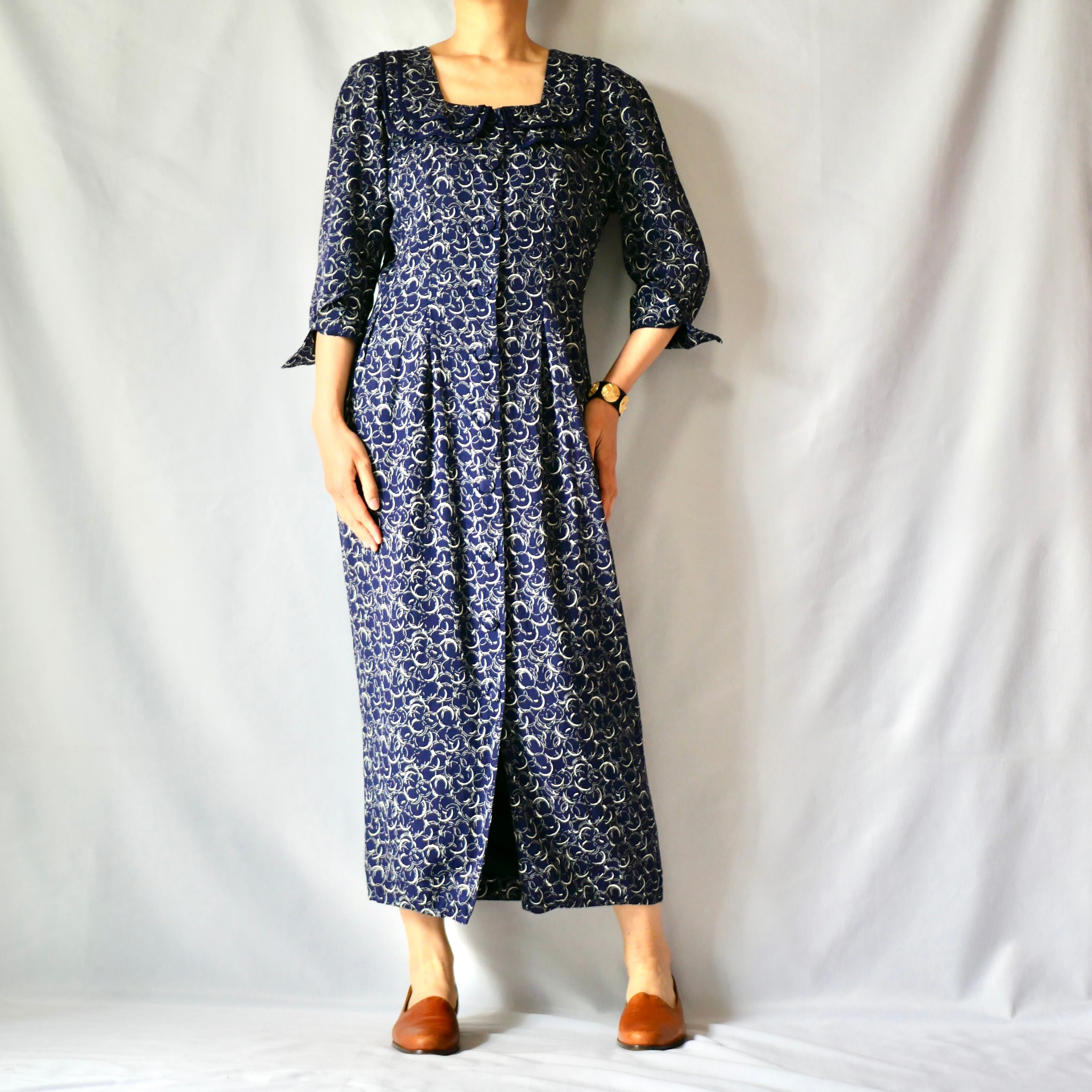 Made in USA navy front button long onepiece アメリカ製 ネイビー手書き風柄 前開きワンピース