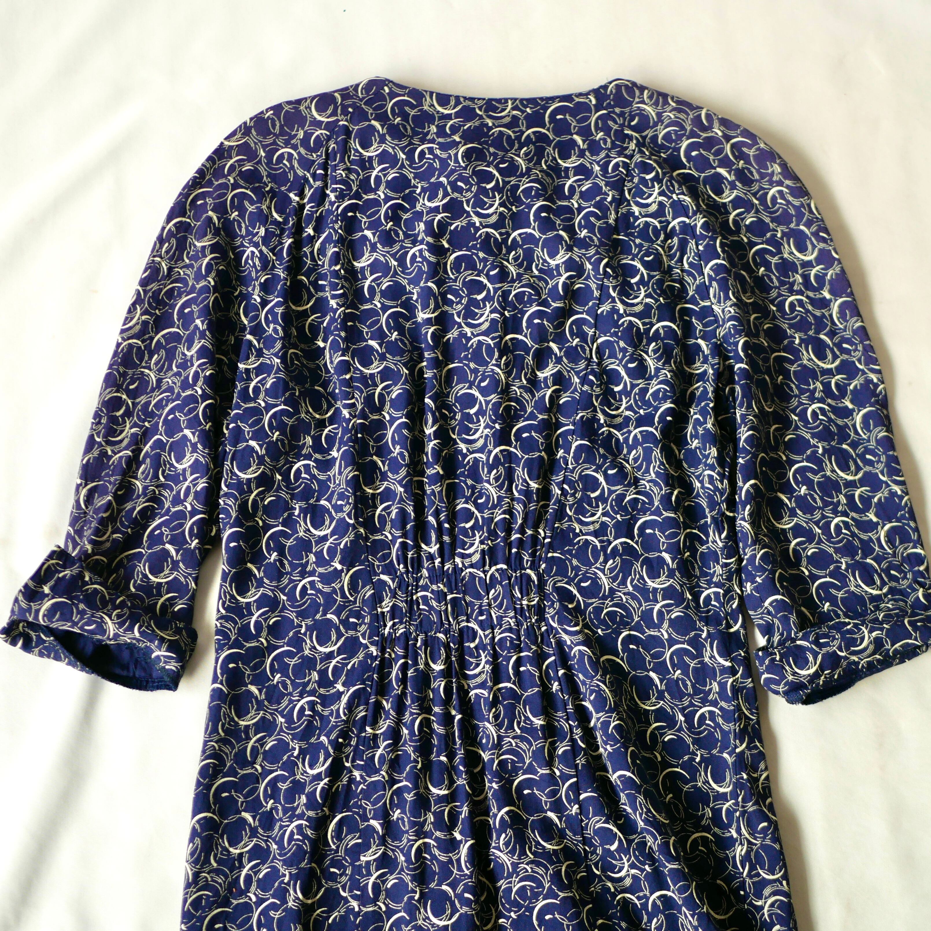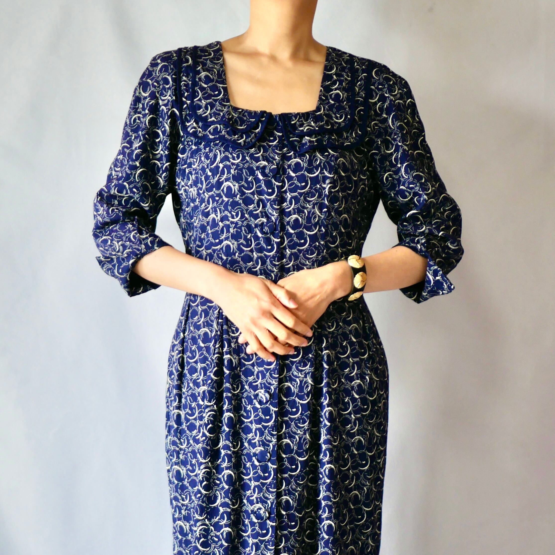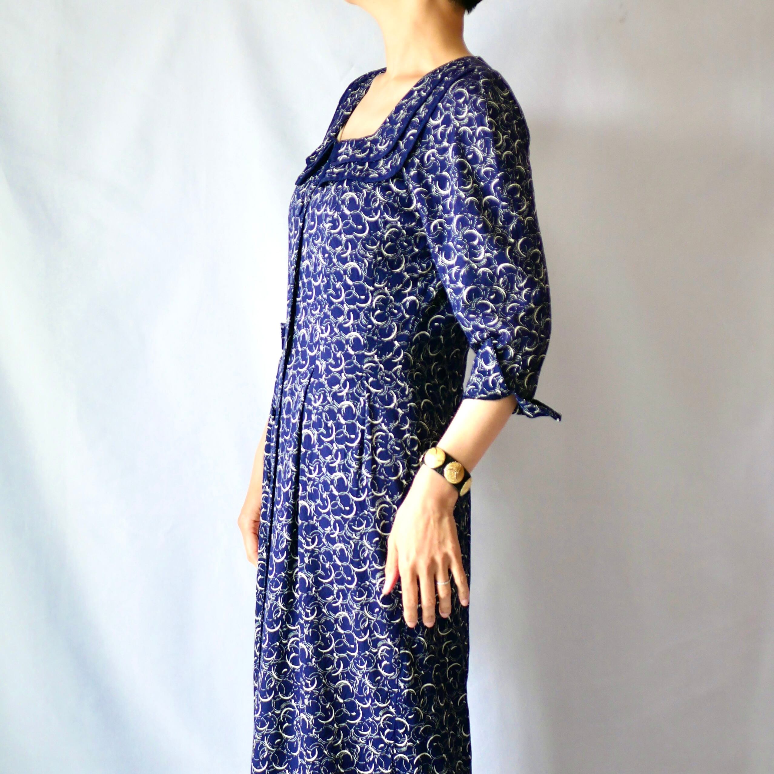 くるくると描かれた手書きの柄、2枚に重なったパイピング襟、くるみボタンなど要所にデザイン性の高さを感じるアメリカ製ワンピースです。