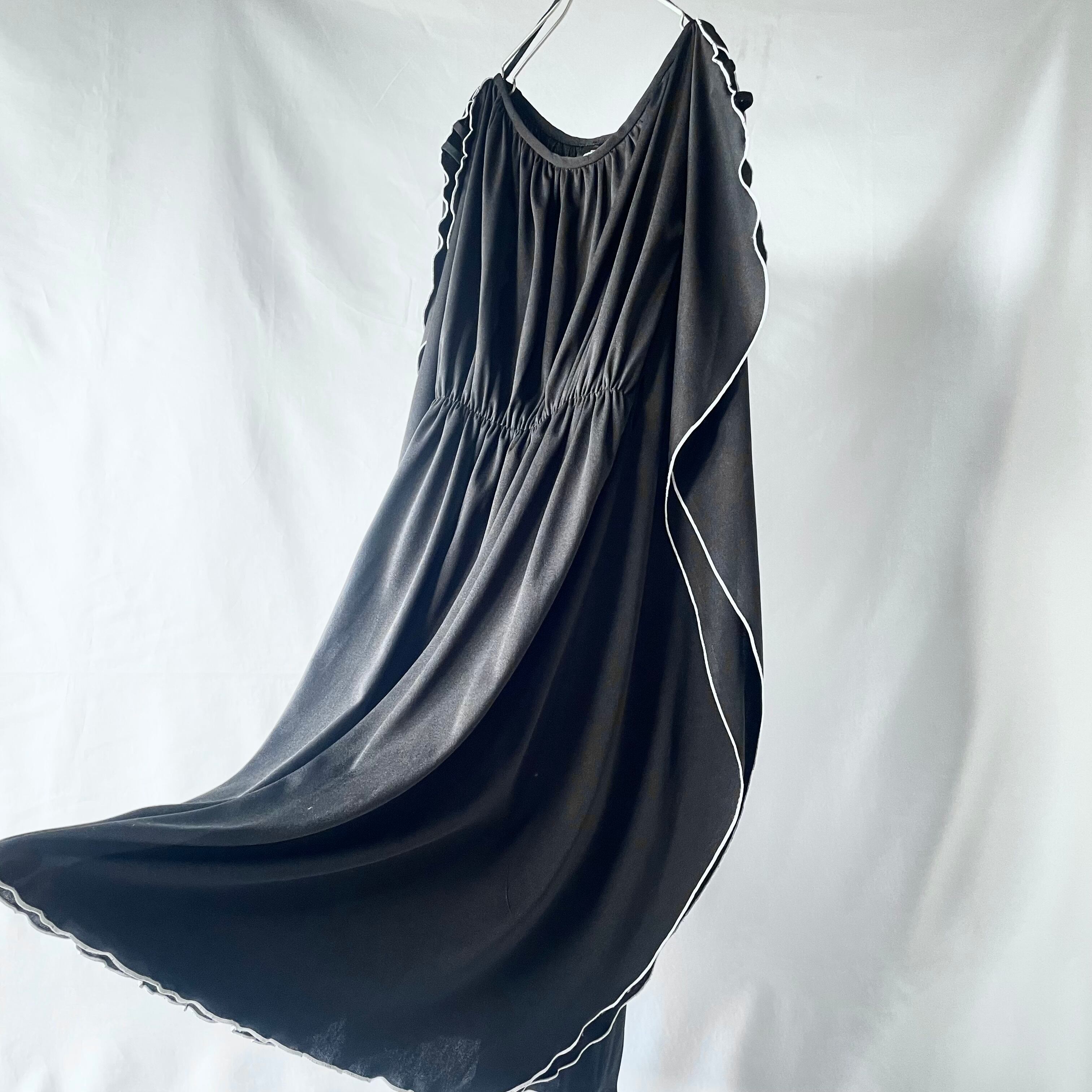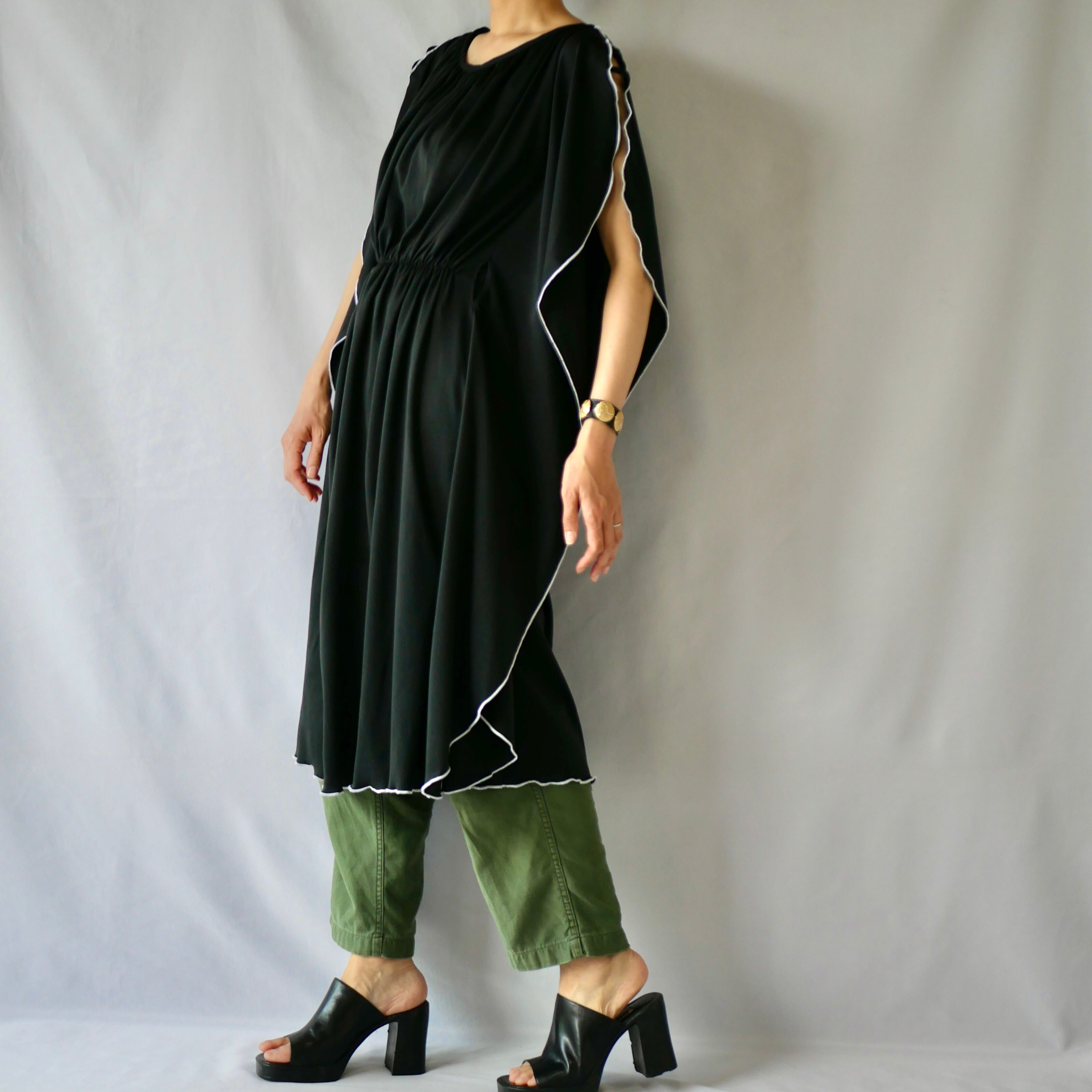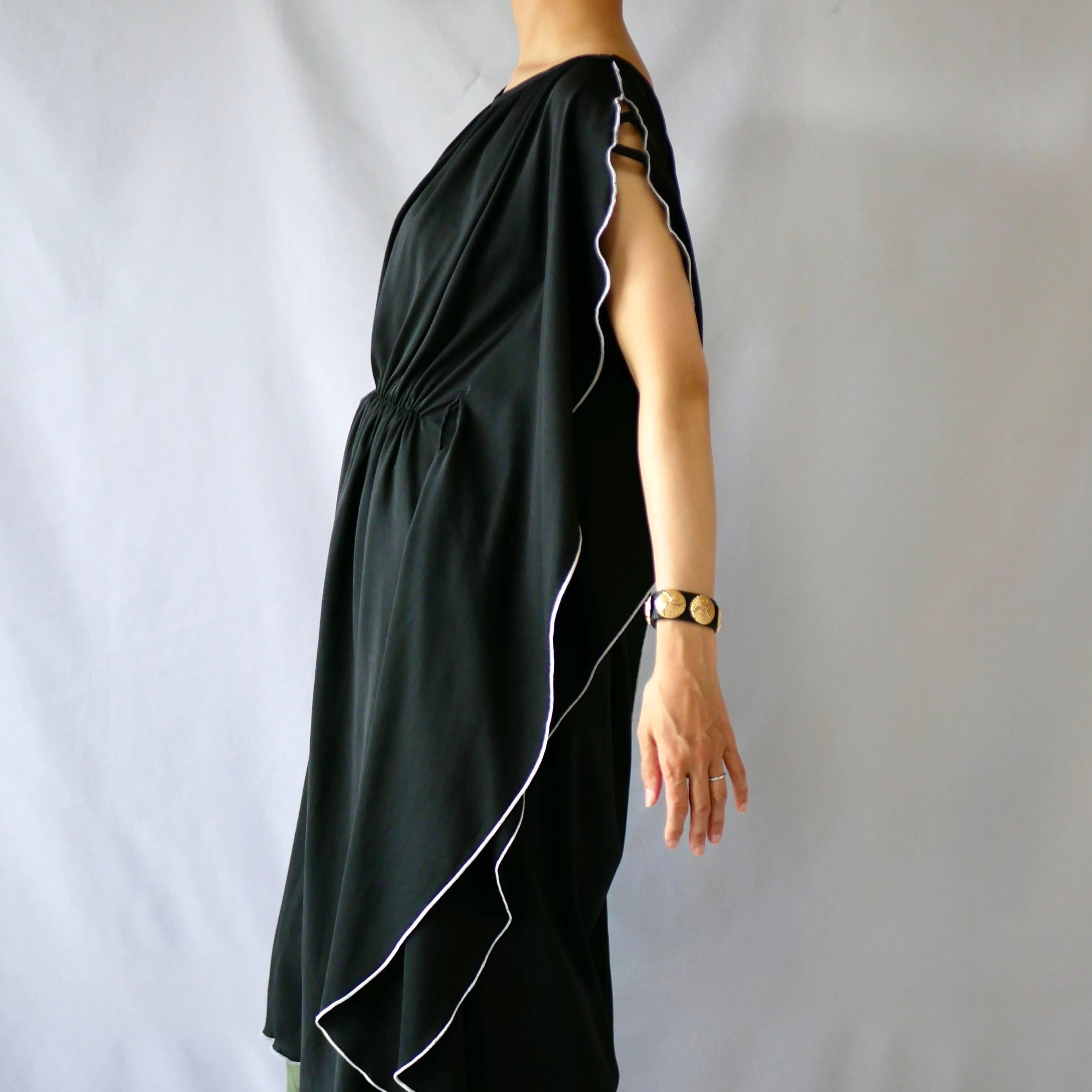 黒地に白ラインがアクセントになったドレープワンピースです。