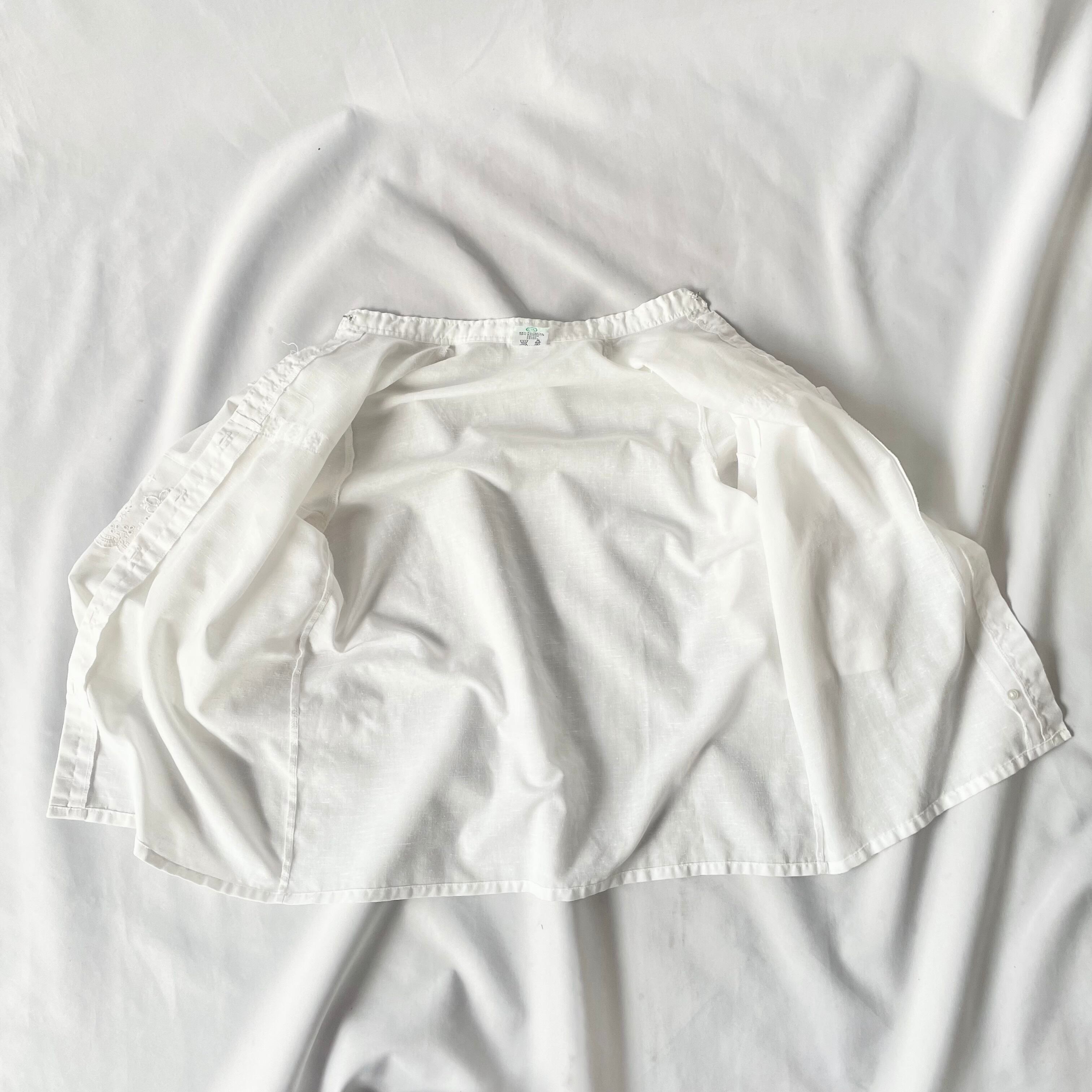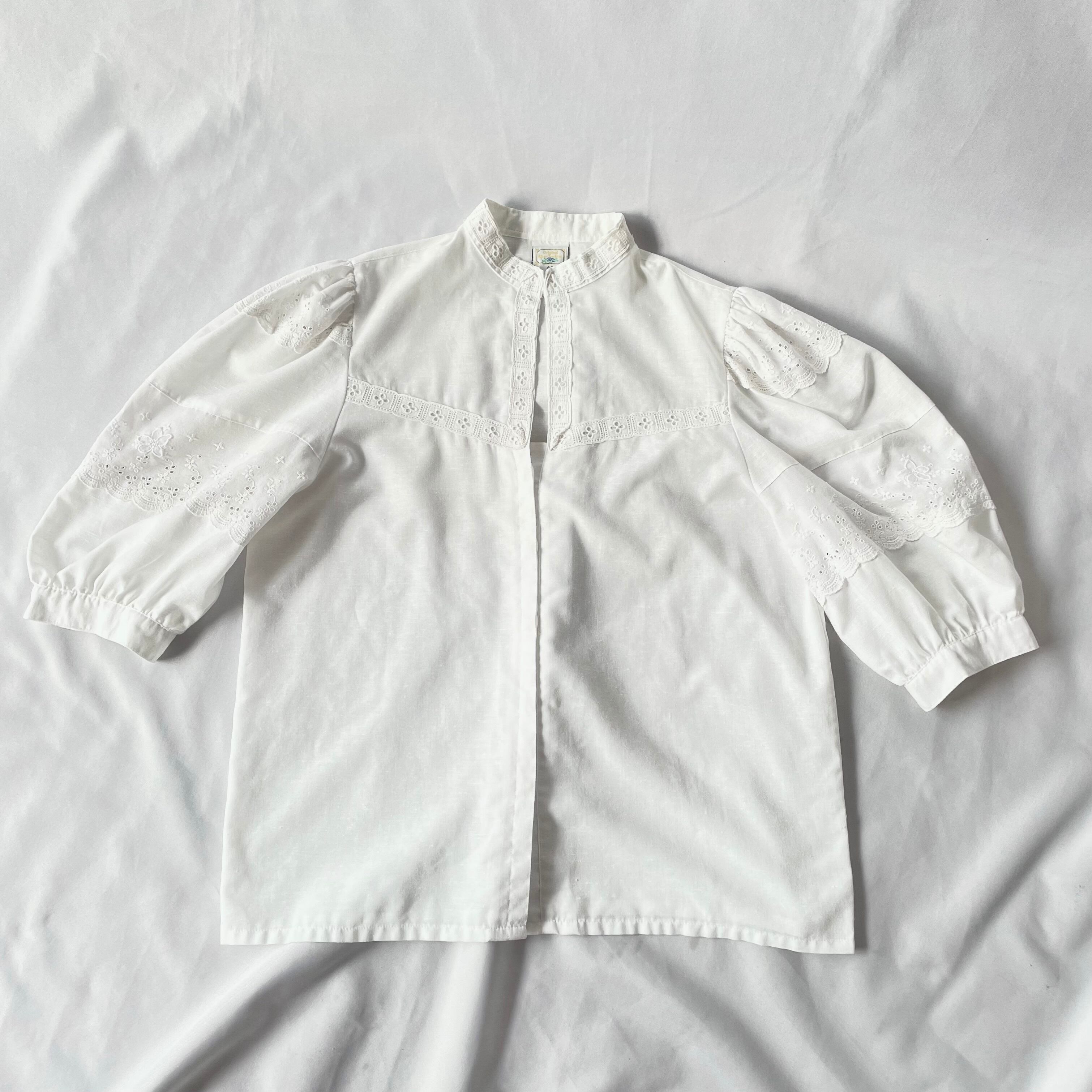 ハイネックのように詰まった首元にホックがあり、胸上辺りからボタンが付く造りが雰囲気抜群で、ふんわり袖のレース装飾もかわいいです。