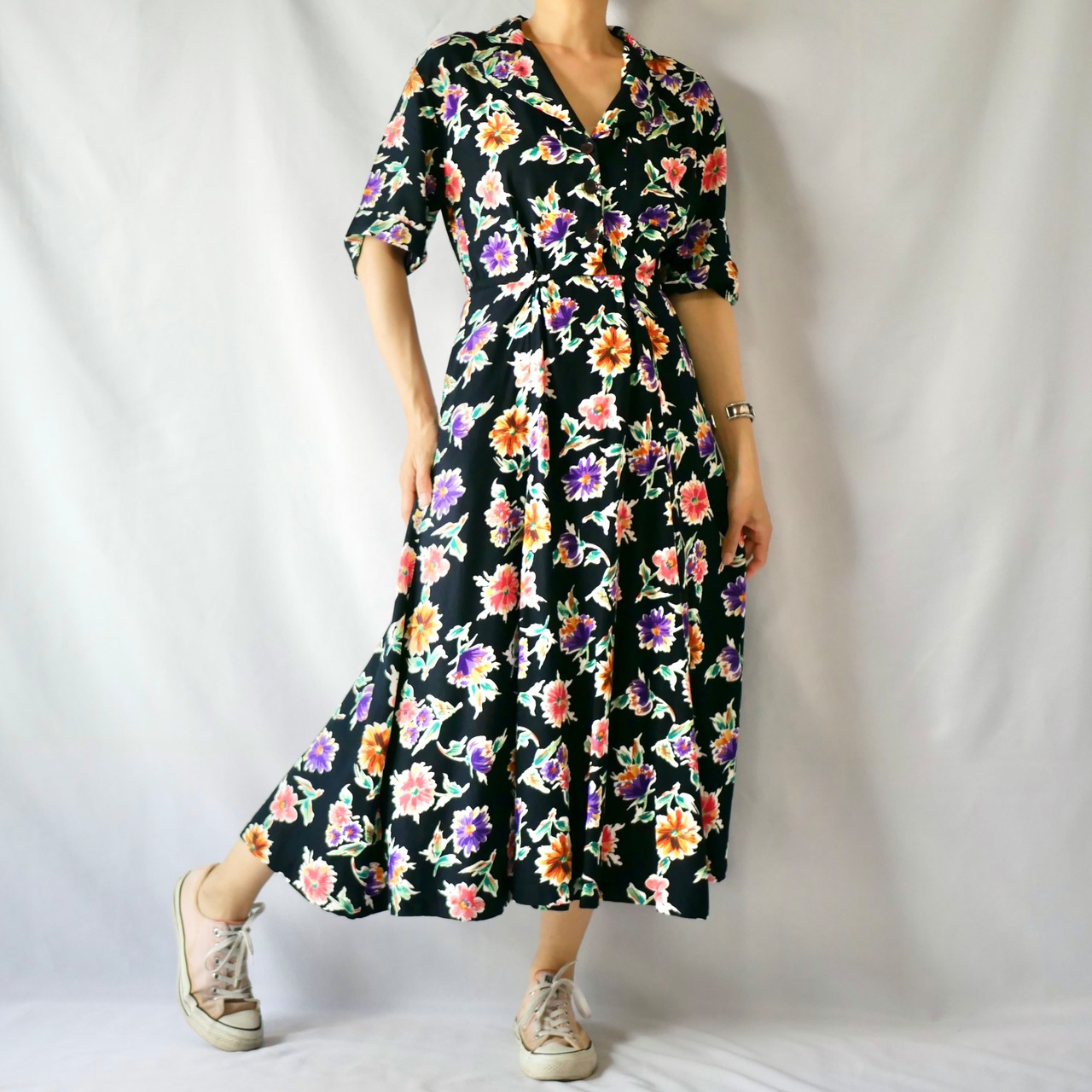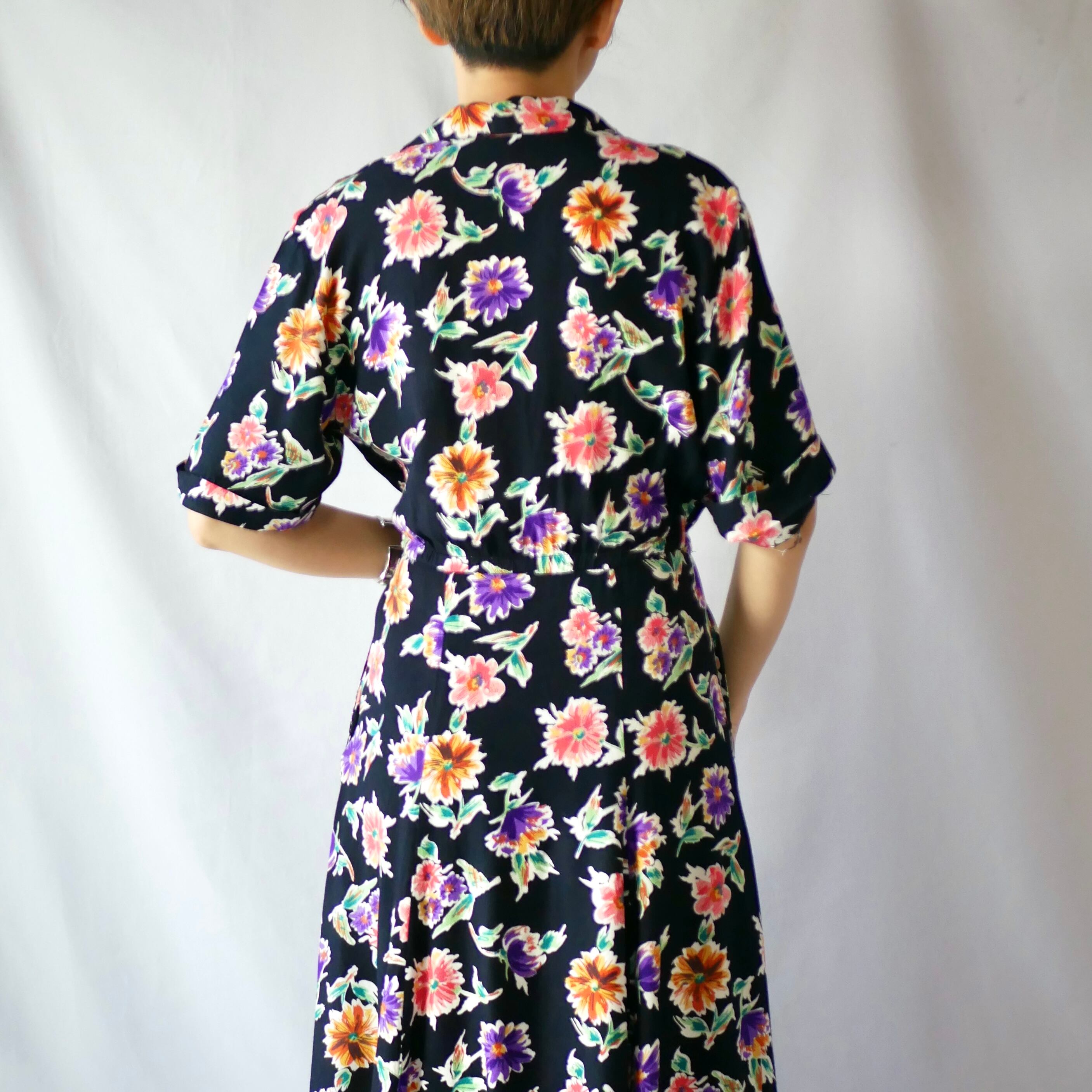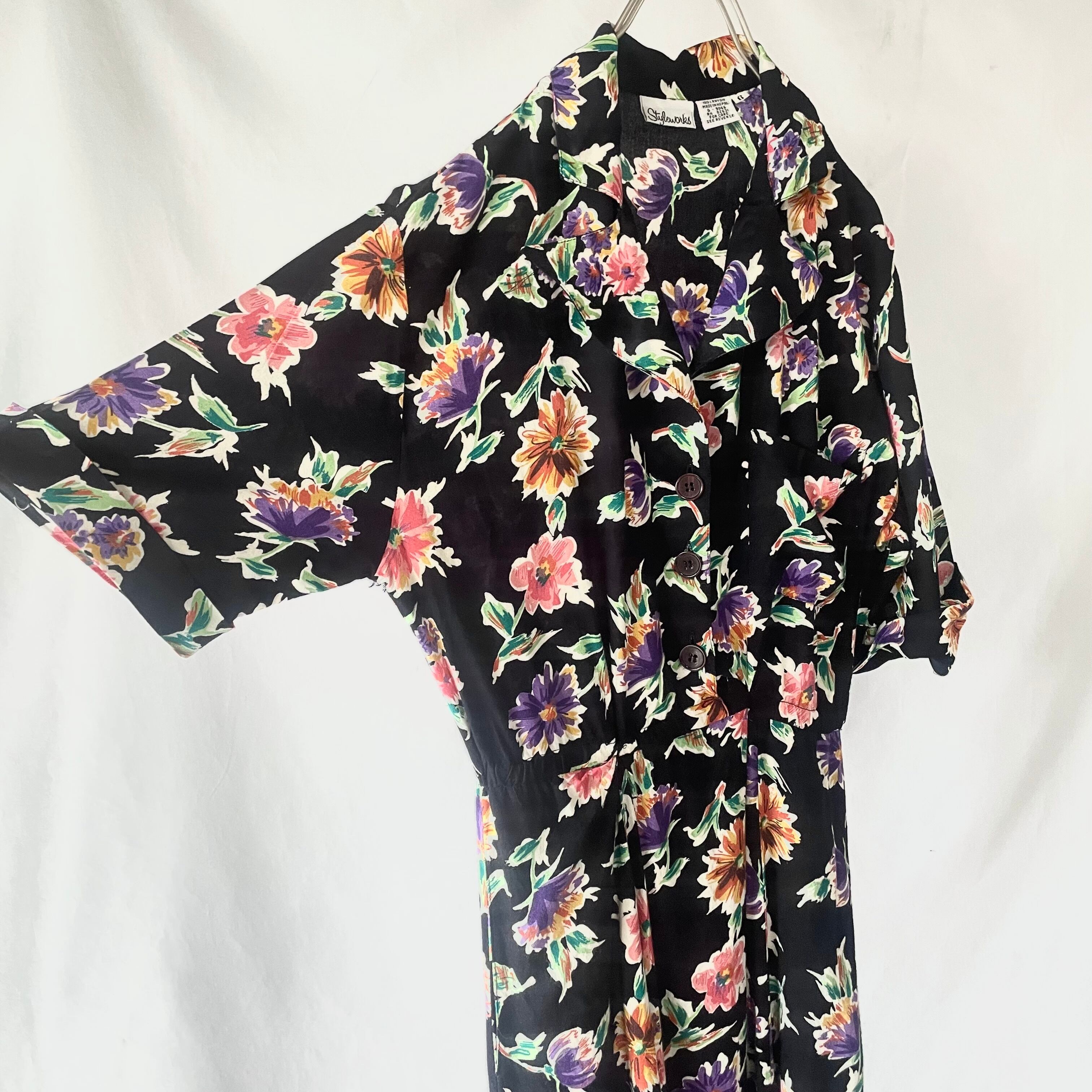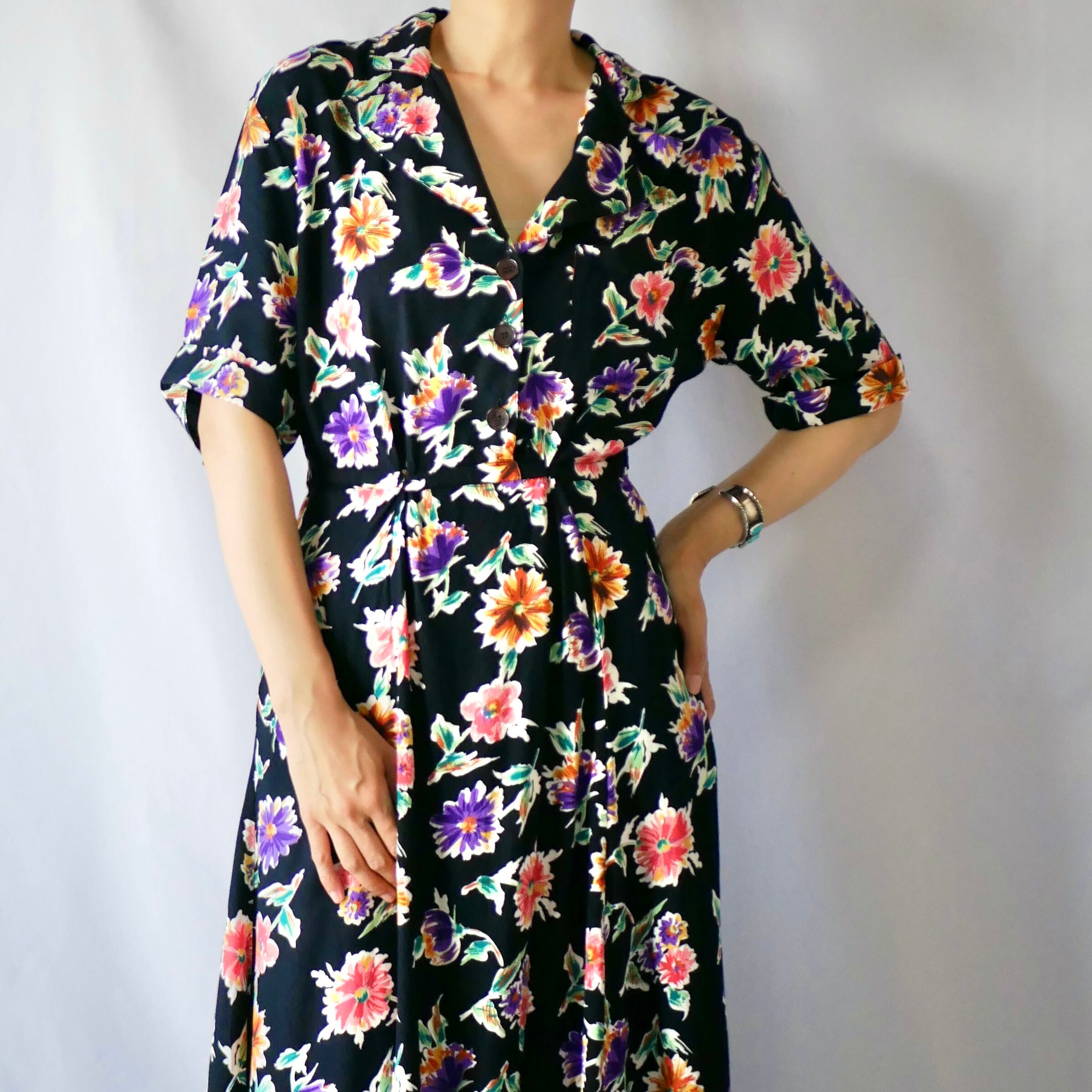黒地にカラフルな花柄のオープンカラーレーヨンワンピースです。