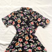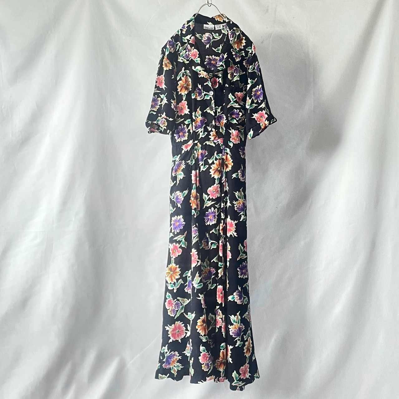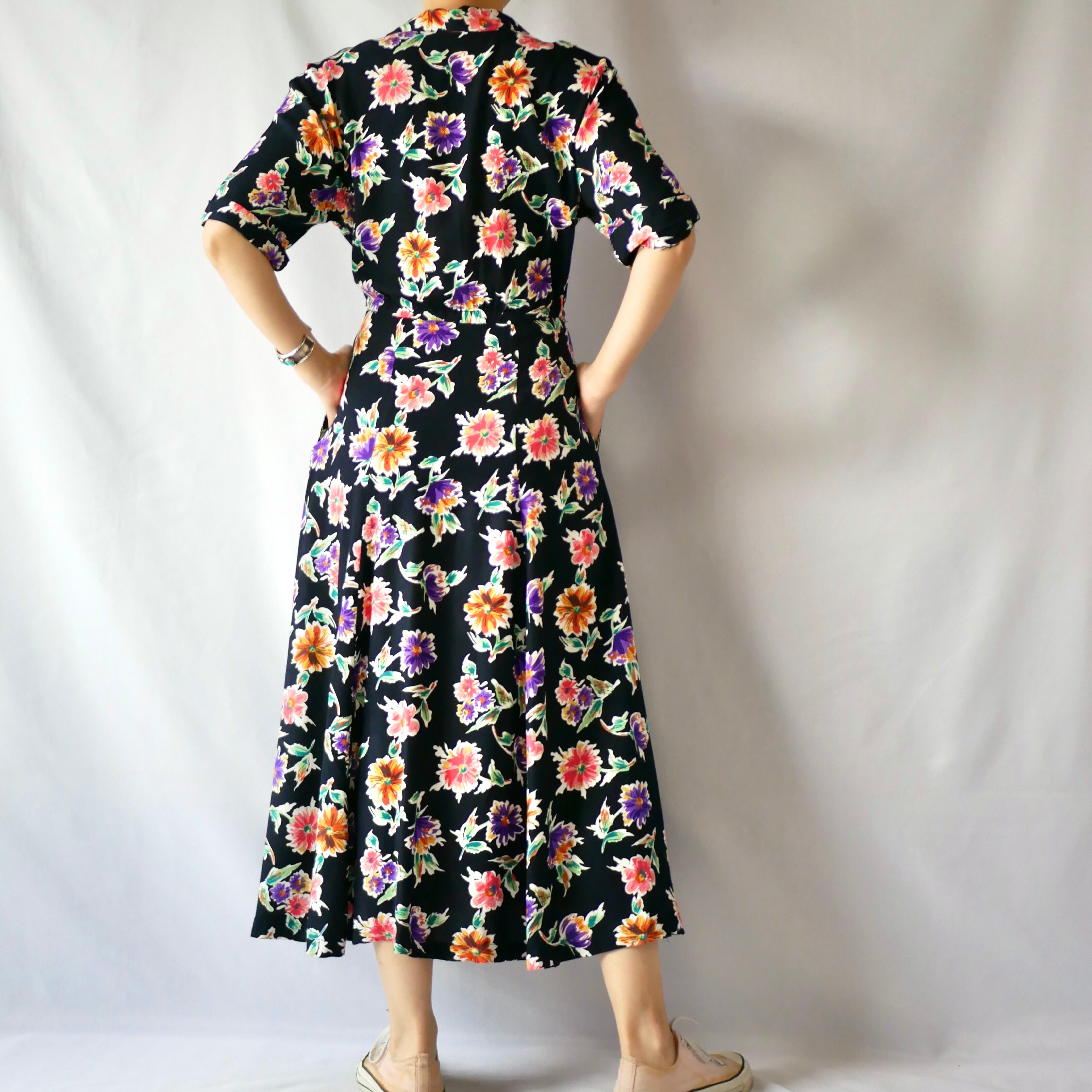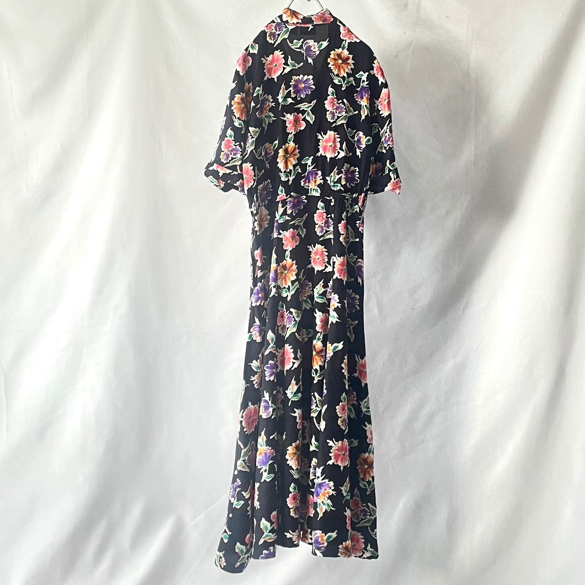 黒地にカラフルな花柄のオープンカラーレーヨンワンピースです。