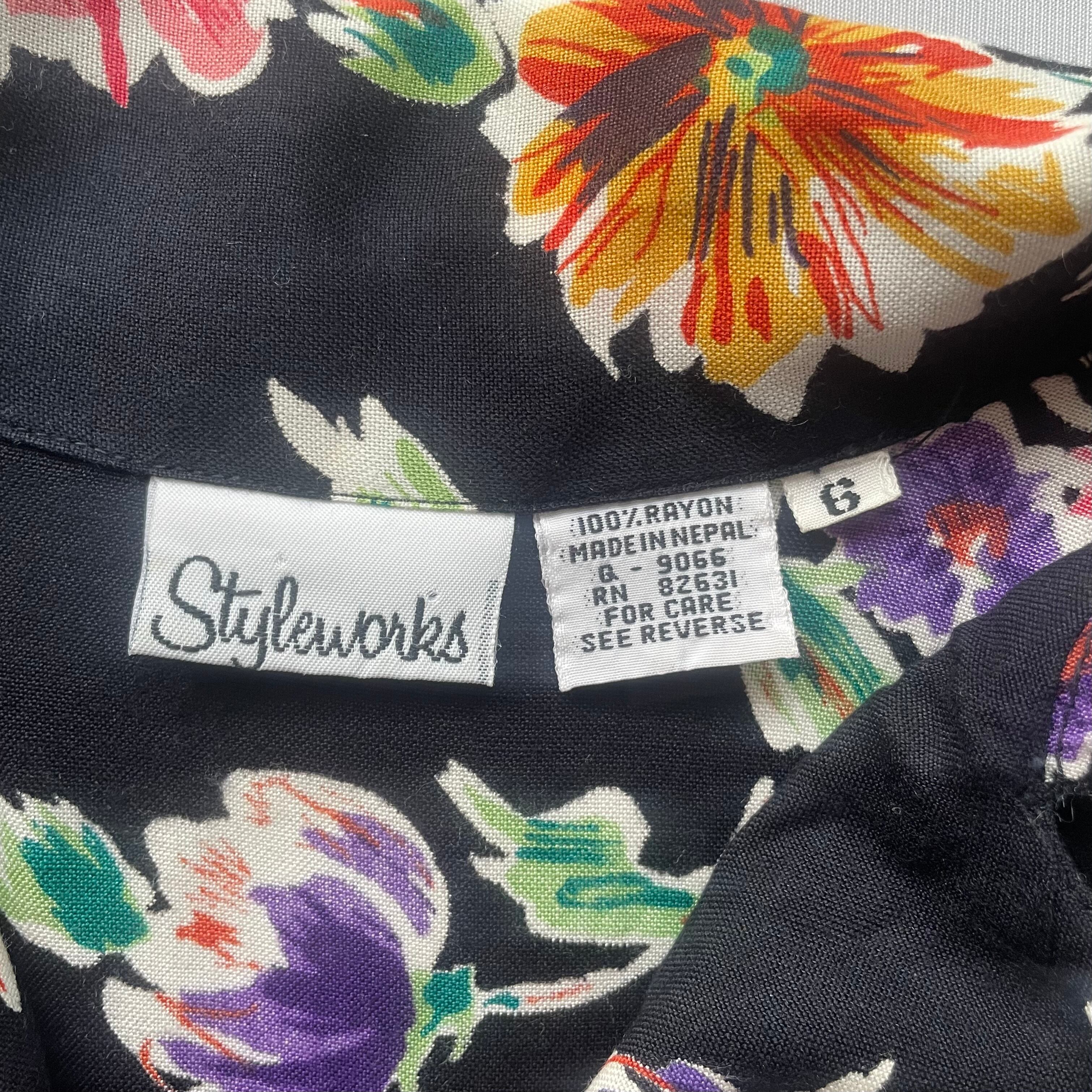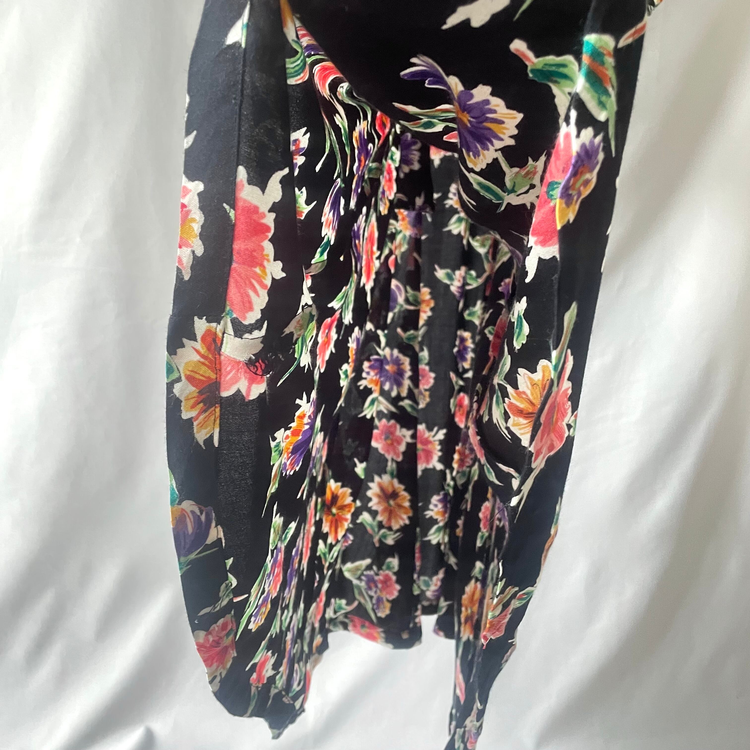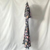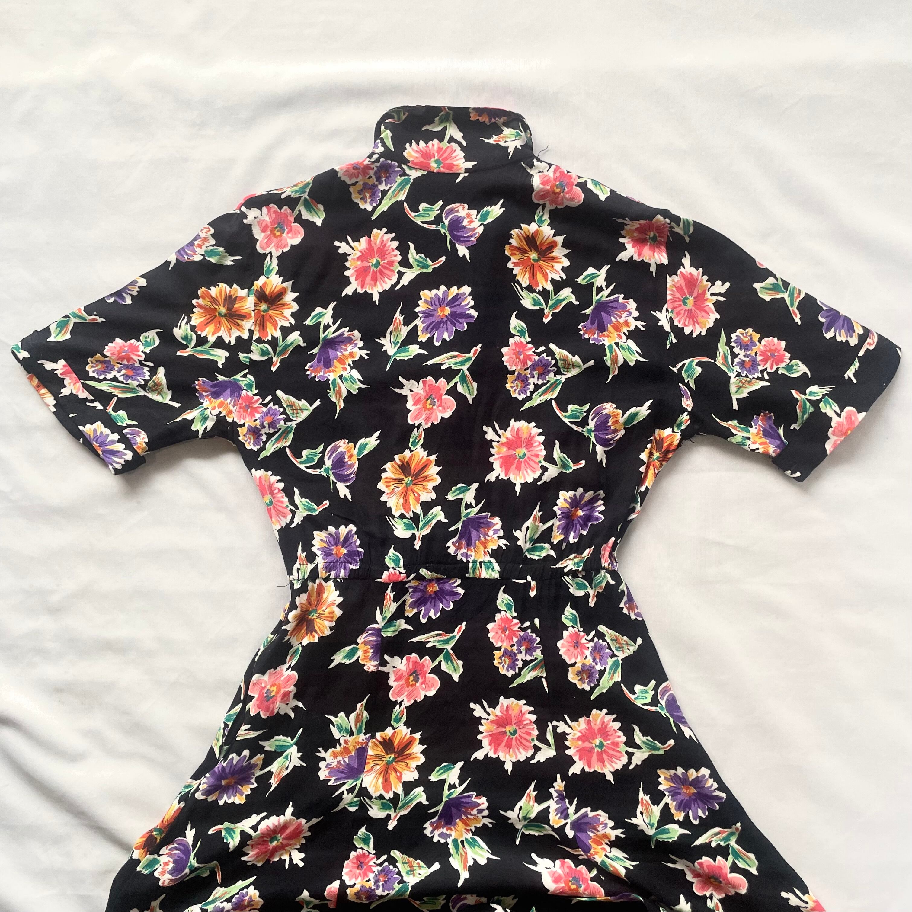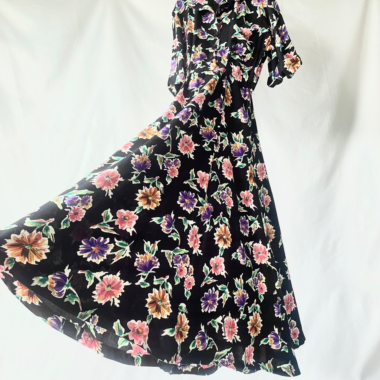 黒地にカラフルな花柄のオープンカラーレーヨンワンピースです。